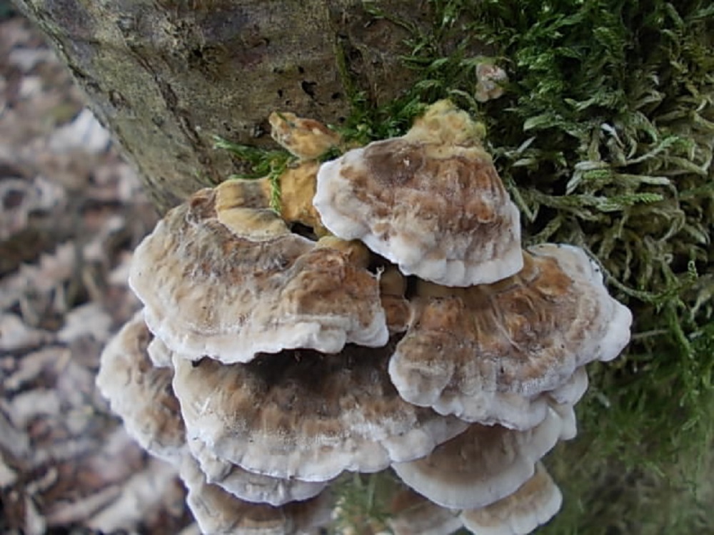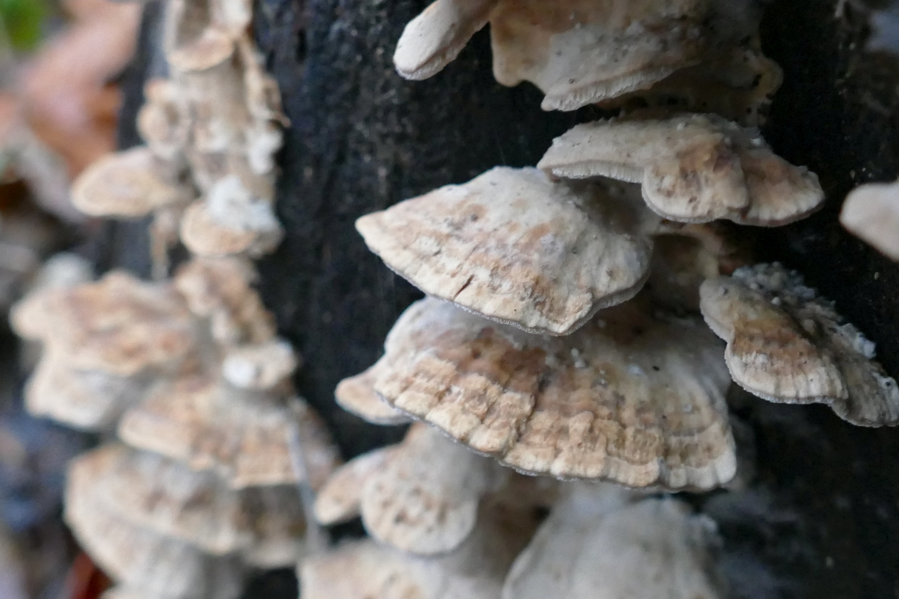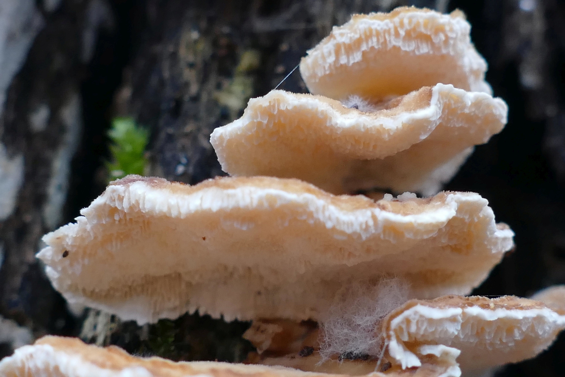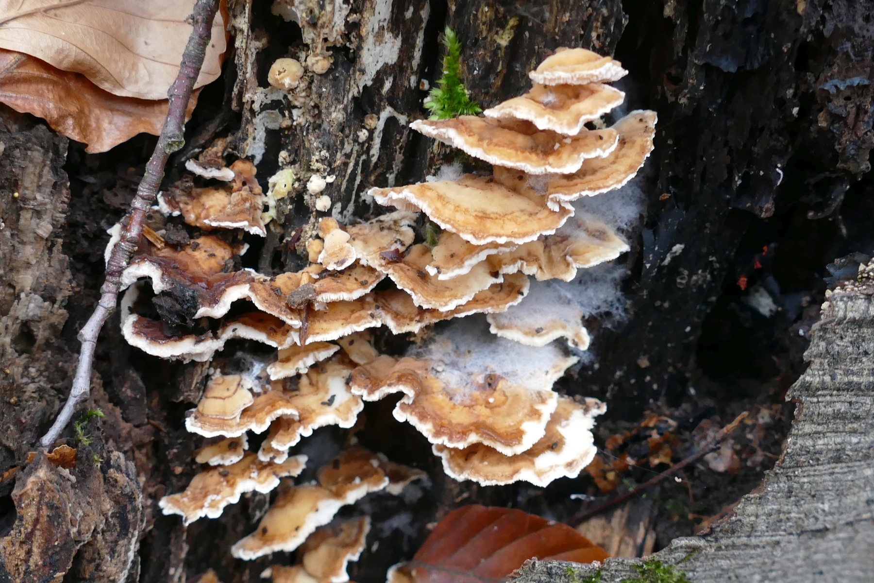 2: Trametes versicolor in beige-brauner Ausführung. Die dicke Hutkante hat mich wohl in die Irre geführt und Trametopsis cervina hat wohl eher in Zähnchen zerfallende Poren.