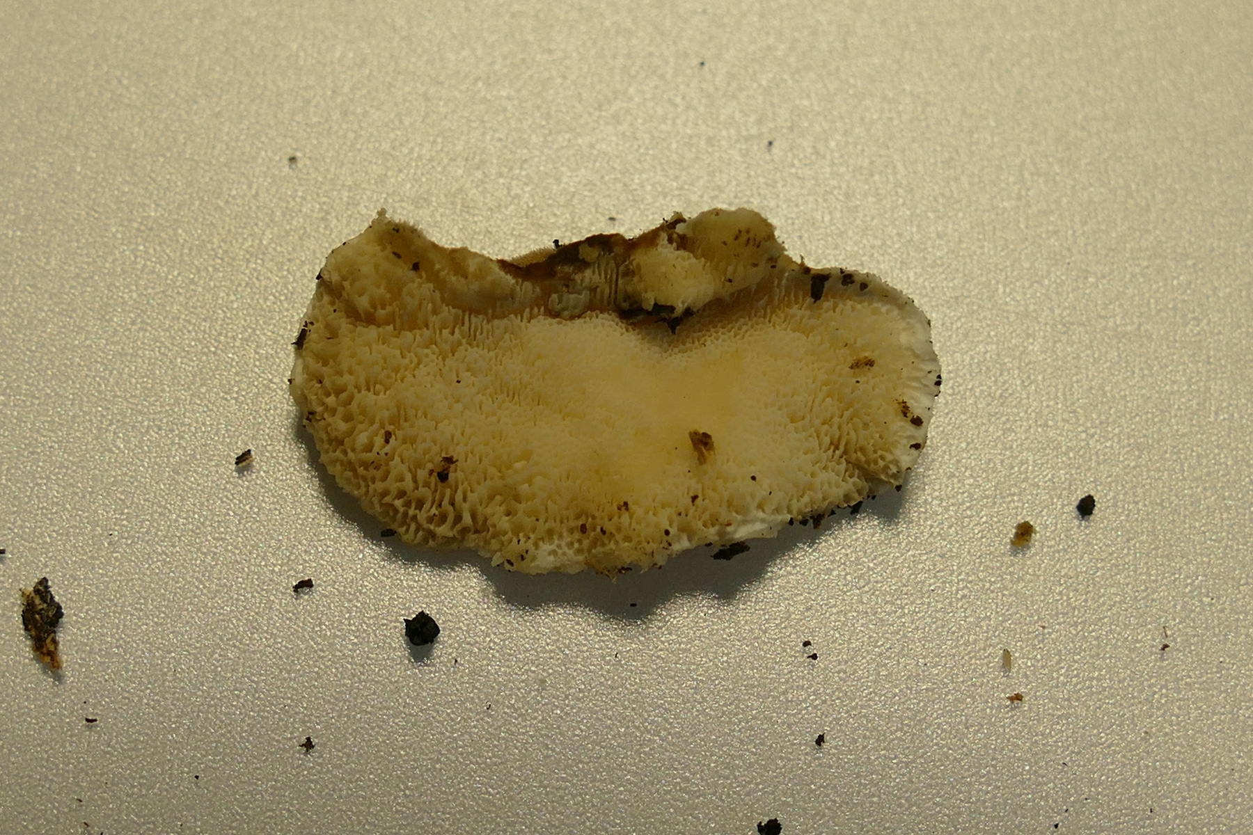 Ein dickfleischiger Porling mit beigem Hut und grauen, groben, eher eckigen Poren.