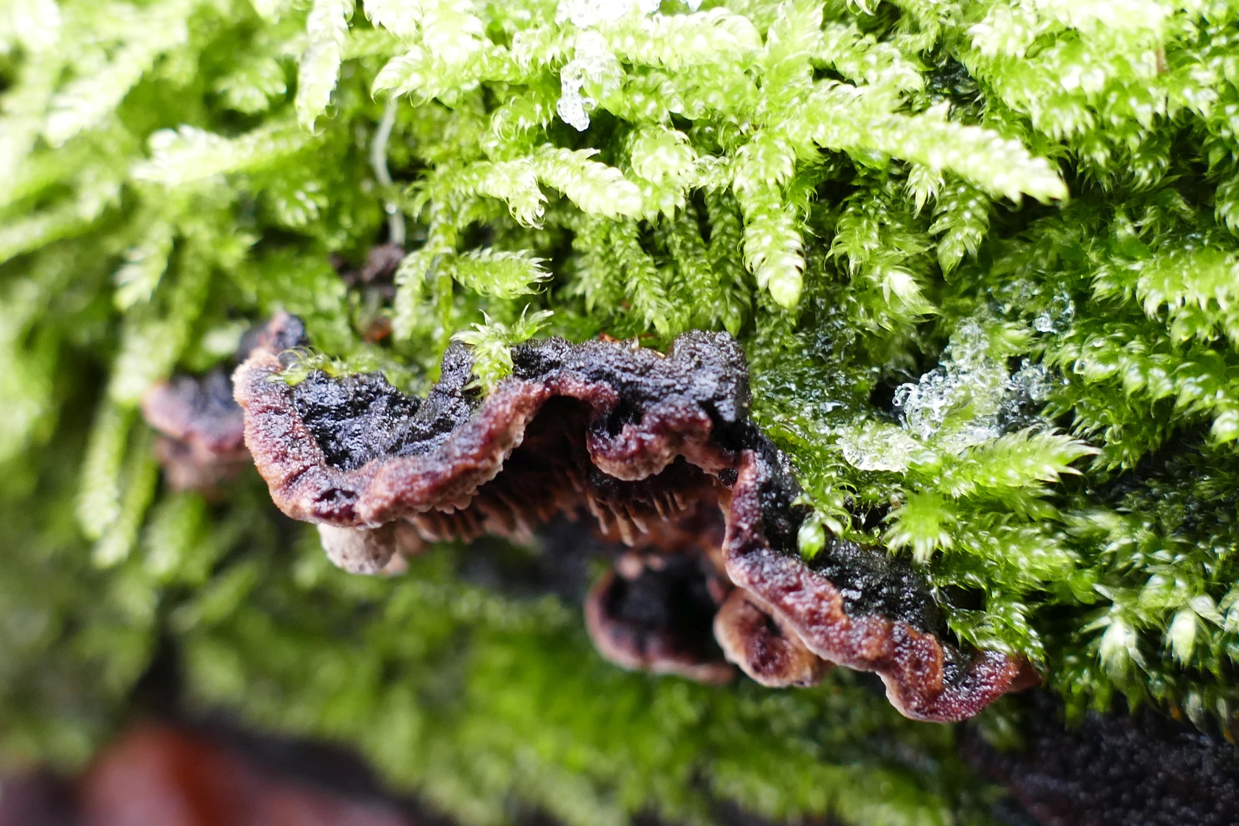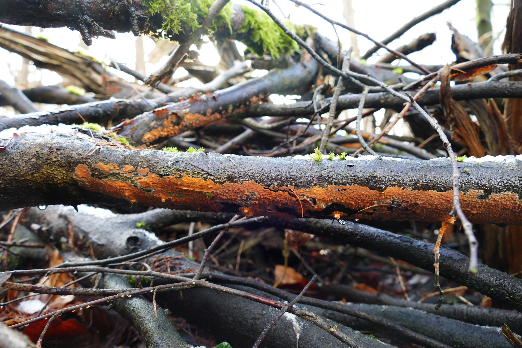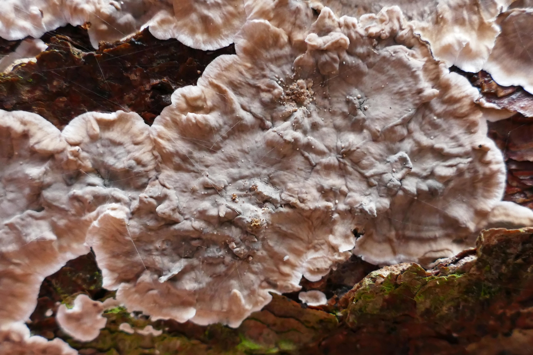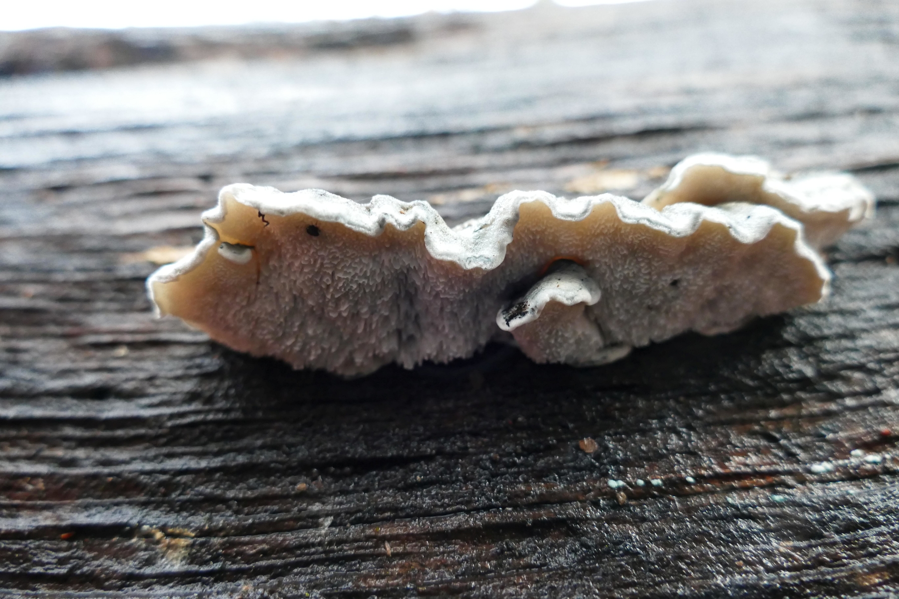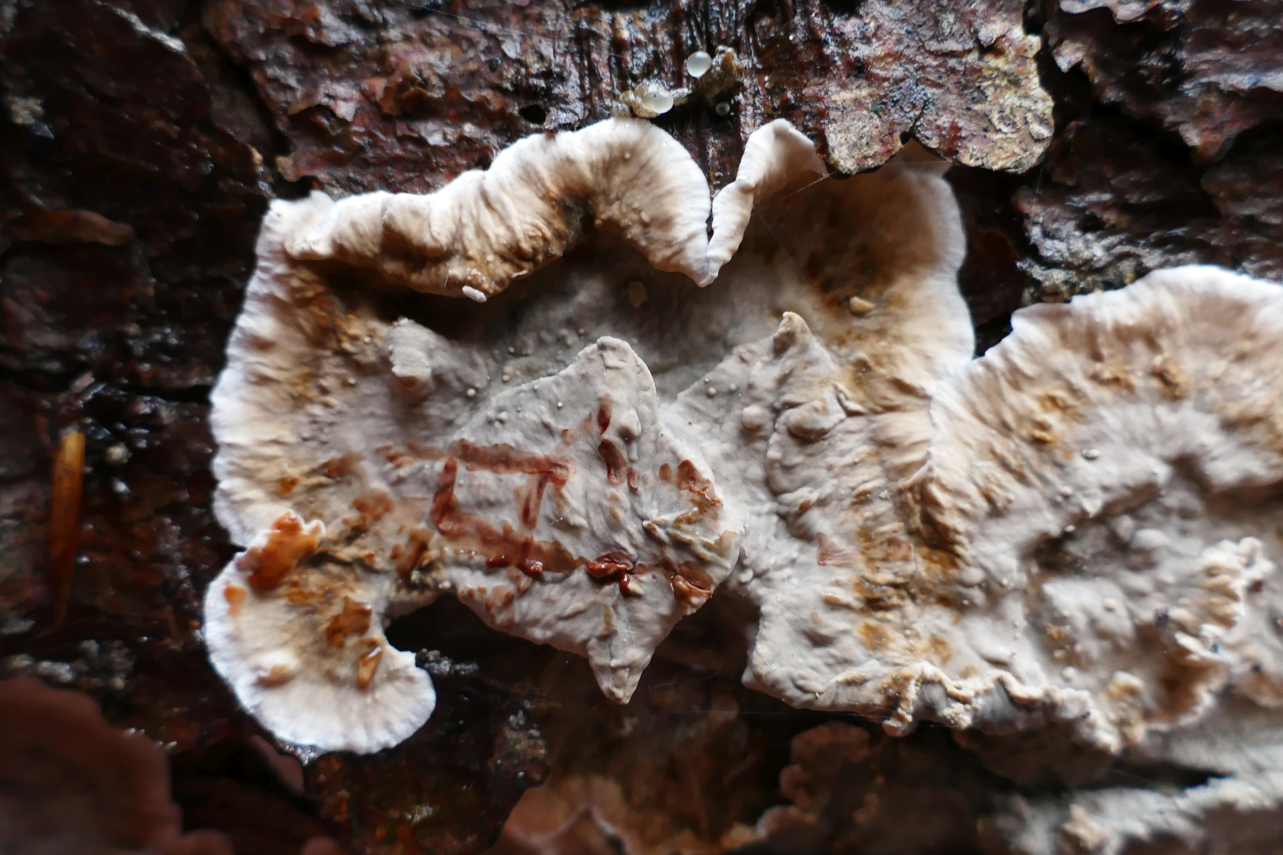1) An einer umgekippten Fichte relativ eindeutig Stereum sanguinolentum (Blutender Nadelholz-Schichtpilz):