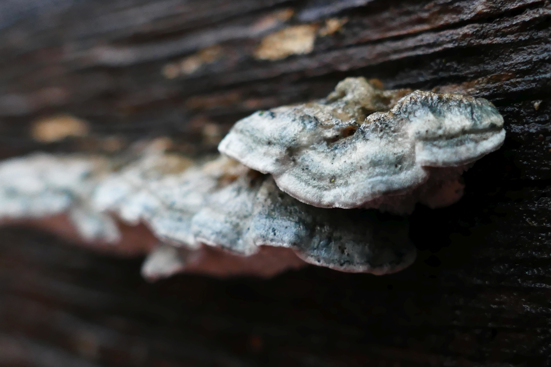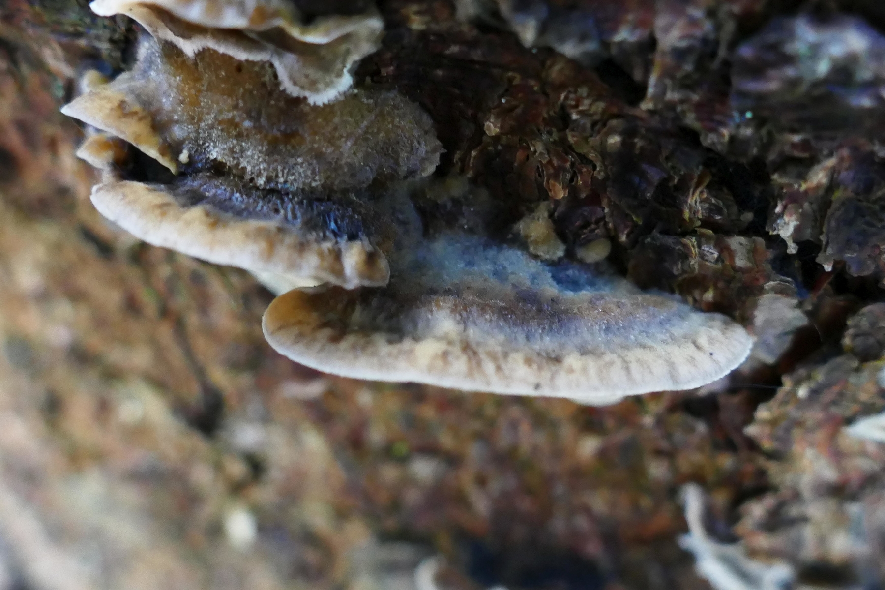 2) An liegender Rotbuche ein bläulich-grauer Pilz: Oligoporus cf. alni = jetzt Cyanosporus cf. alni (Fastblauender Erlen-Saftporling):