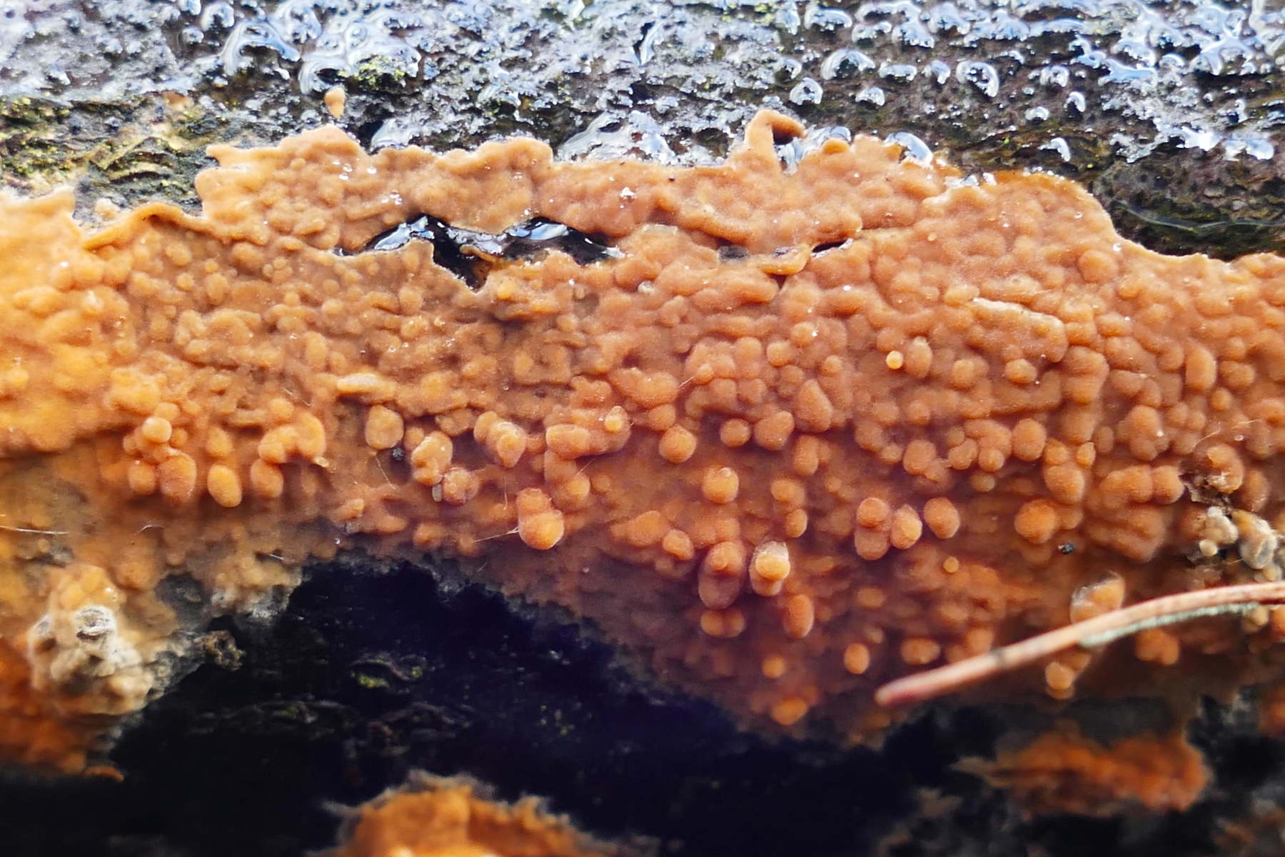 Aphyllophorales News - Holzpilze - Porlinge - Rindenpilze: Peniophora aurantiaca – Grünerlen-Zystidenrindenpilz