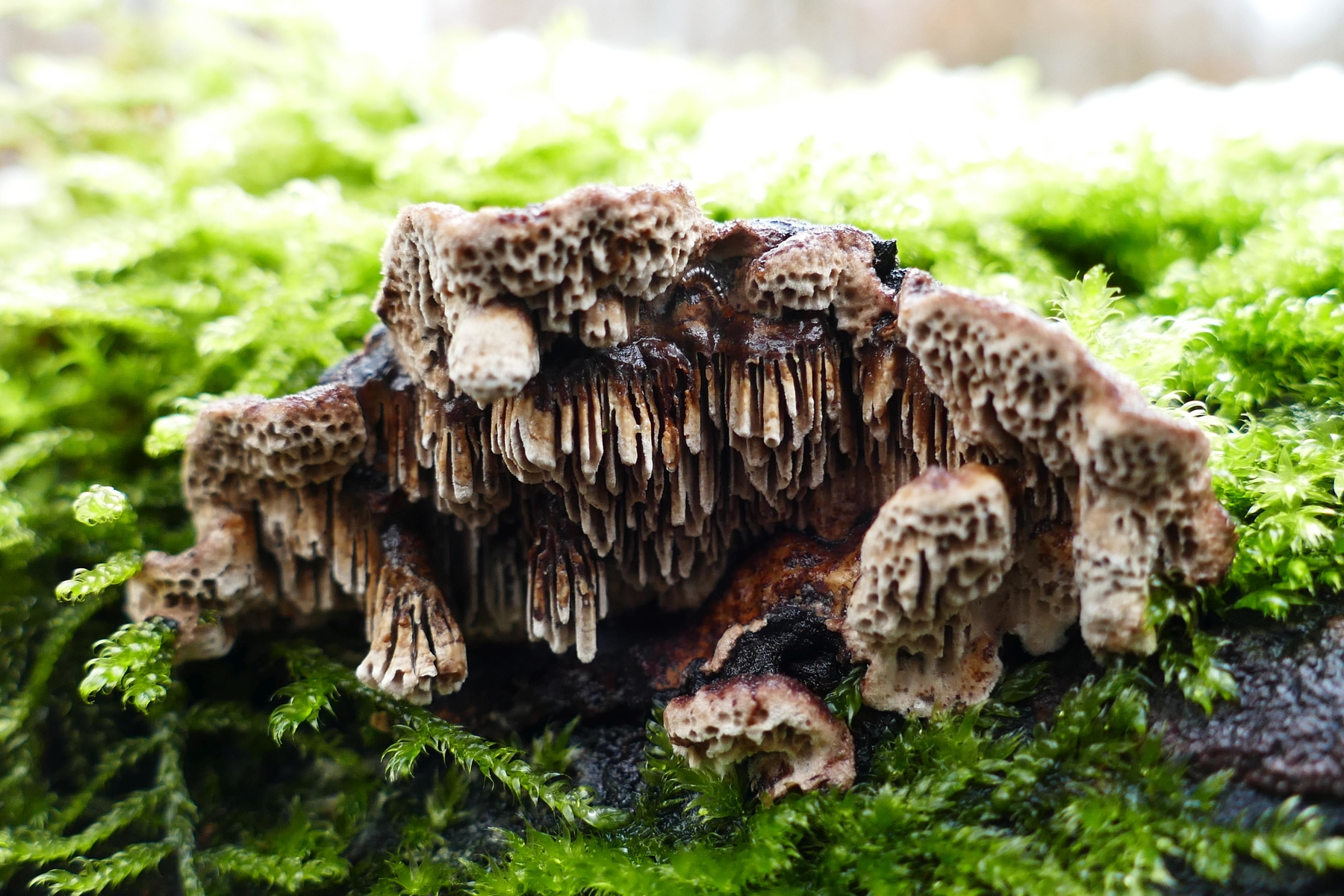4) An liegendem, vermoostem Laubholz vermutlich Datronia mollis (Großporige Datronie oder Weicher Resupinatporling):