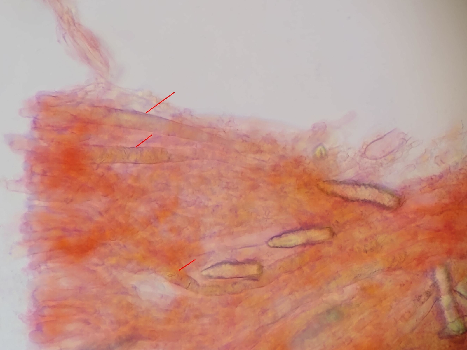 lange Zystidien mit seltsamem, wie gefaltet wirkendem Inhalt (in Kongorot gefärbt):