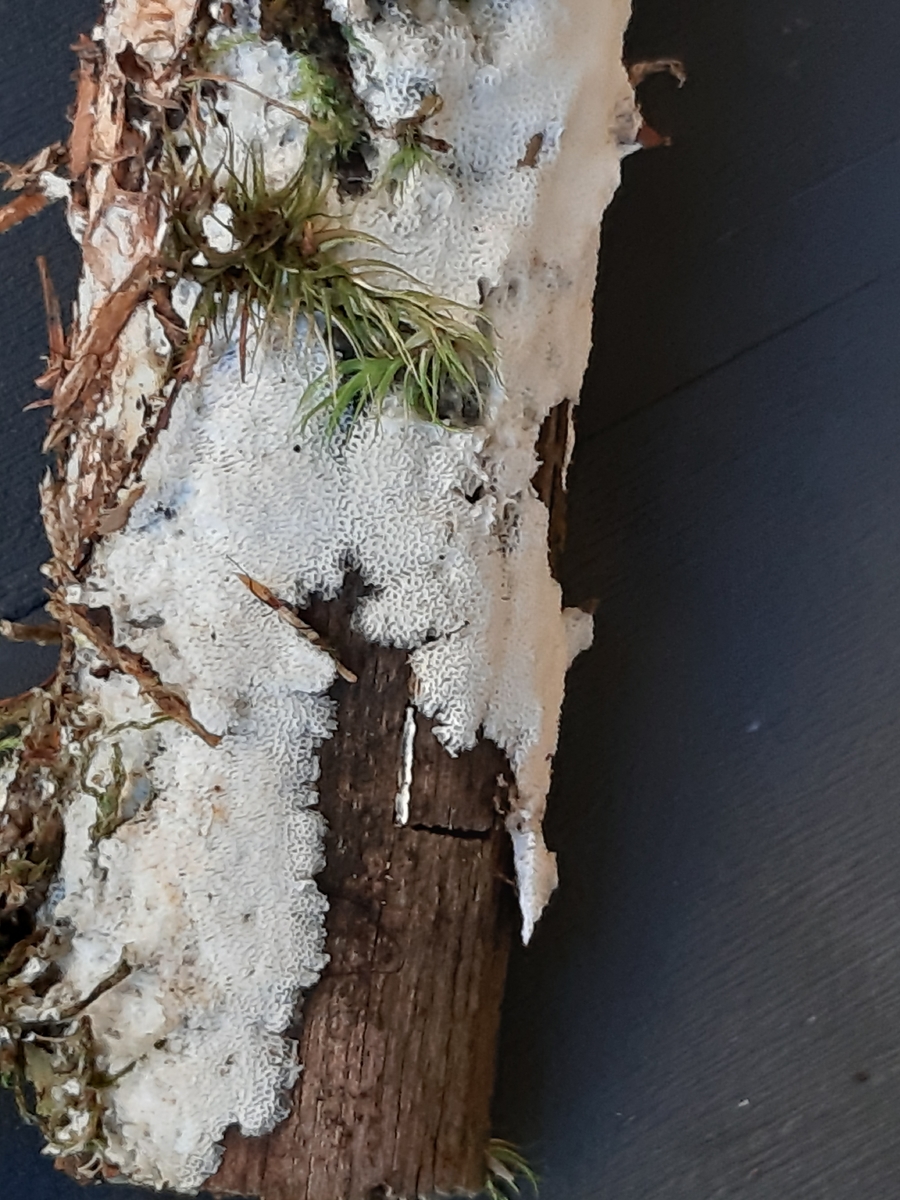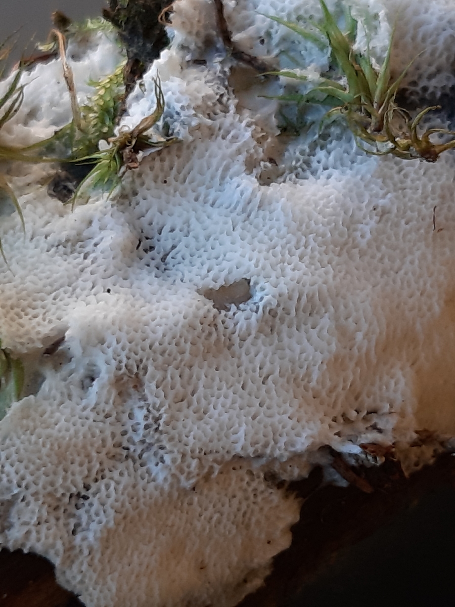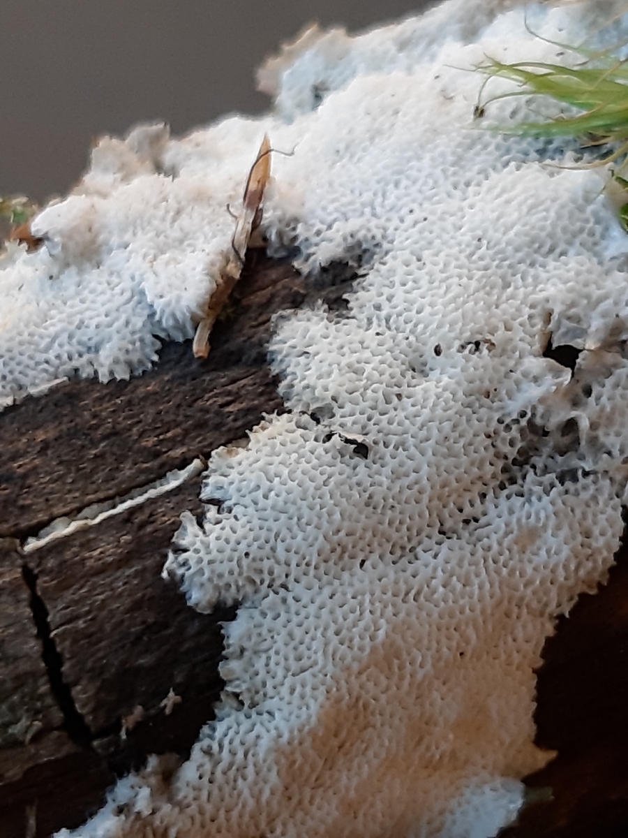 Vor 3 Tagen habe ich einen resupinat wachsenden Porling auf Nadeltodholz gefunden. Den weichen, milch-weißlichen Fruchtkörper konnte man gut ablösen vom Substrat. Die Poren sind rundlich bis länglichen und fein, auf einen Millimeter 3 Stück und sehen aus wie kleine angereihte Krater die zum Rand auslaufen. Der Geruch angenehm pilzig. Angefangen habe ich in Wasser zu mikroskopiert leider sieht man nicht sehr deutlich, danach in Kongorot eingefärbt um die Hyphenstruktur besser zu erkennen. Einen Sporenabwurf habe ich 2 mal versucht, leider ohne Ergebnis. Wenn die Temperaturen etwas wärmer werden kann es noch zur Sporenreife kommen?