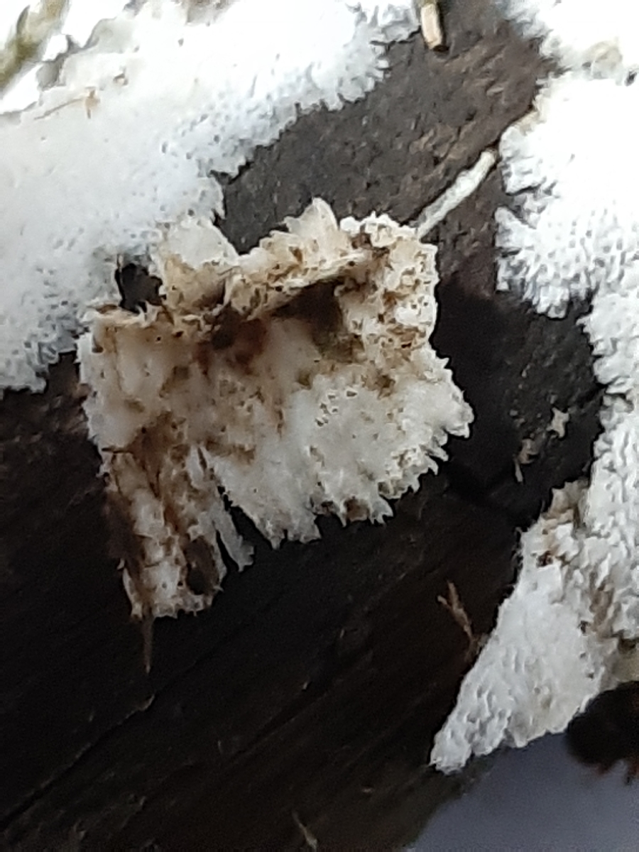 Auf einigen der Bilder sieht man noch die Schlieren der sich aufgelösten Skeletthyphen. Ich denke dass der Pilz Cinereomyces lindbladii ist.