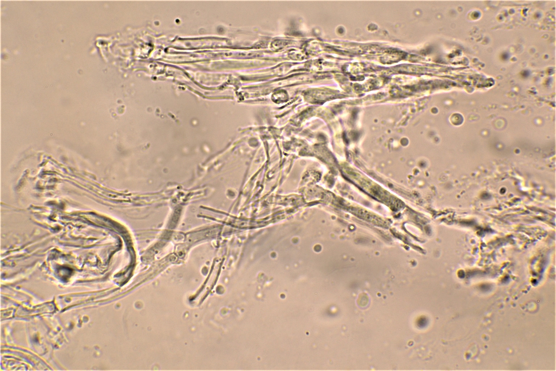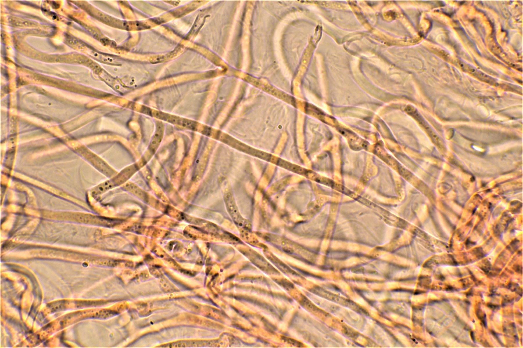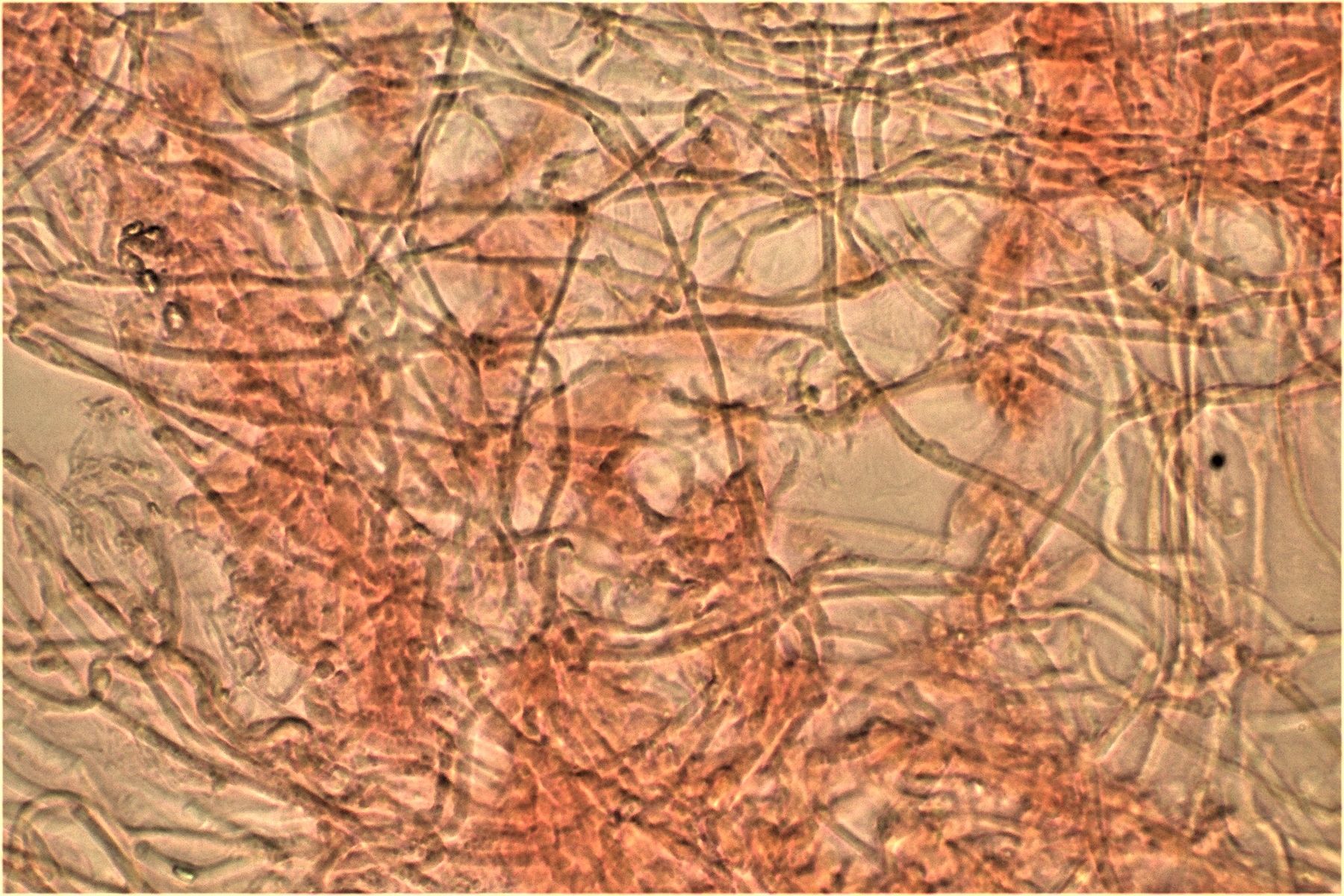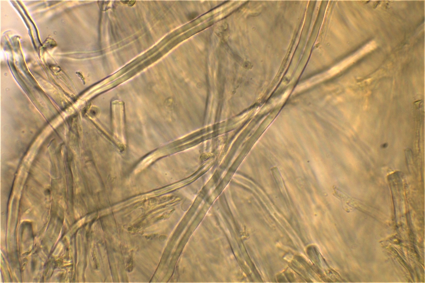 Gestern hatte ich schon einmal probiert mit 20% KOH kurz danach, und 30 Minuten später zu mikroskopieren. Die dickwandigen unseptierten Hyphen haben sich aufgelöst. Mit dem einfließen lassen des KOH direkt unter dem Deckgläschen werde ich nachholen! Das wußte ich nicht und deine Nachricht hatte ich Schussel leider zu spät gelesen. Danke noch einmal für deinen guten sehenswerten und famosen Tipp! Das ist auch etwas für unseren Mikroskopier Stammtisch bei den Pilzfreunden Saar-Pfalz, da werde ich ein paar Exsikkate trocknen damit wir uns das gemeinsam anschauen können beim nächsten Treffen. Es fehlen jetzt noch die Sporen, da gehe ich heute noch einmal auf die Suche und nehme an verschiedenen Stellen des Pilzes Proben. Wenn ich den Pilz trockne und dann schneide bekomme ich dünnere Schnitte hin, das hat auf jeden Fall besser geklappt. In Wasser, Kongorot NH3 und Melzer hatte ich auch noch einmal aus probiert, durch das dünnere Präparat konnte man die dimitrische Hyphenstruktur jetzt besser erkennen.