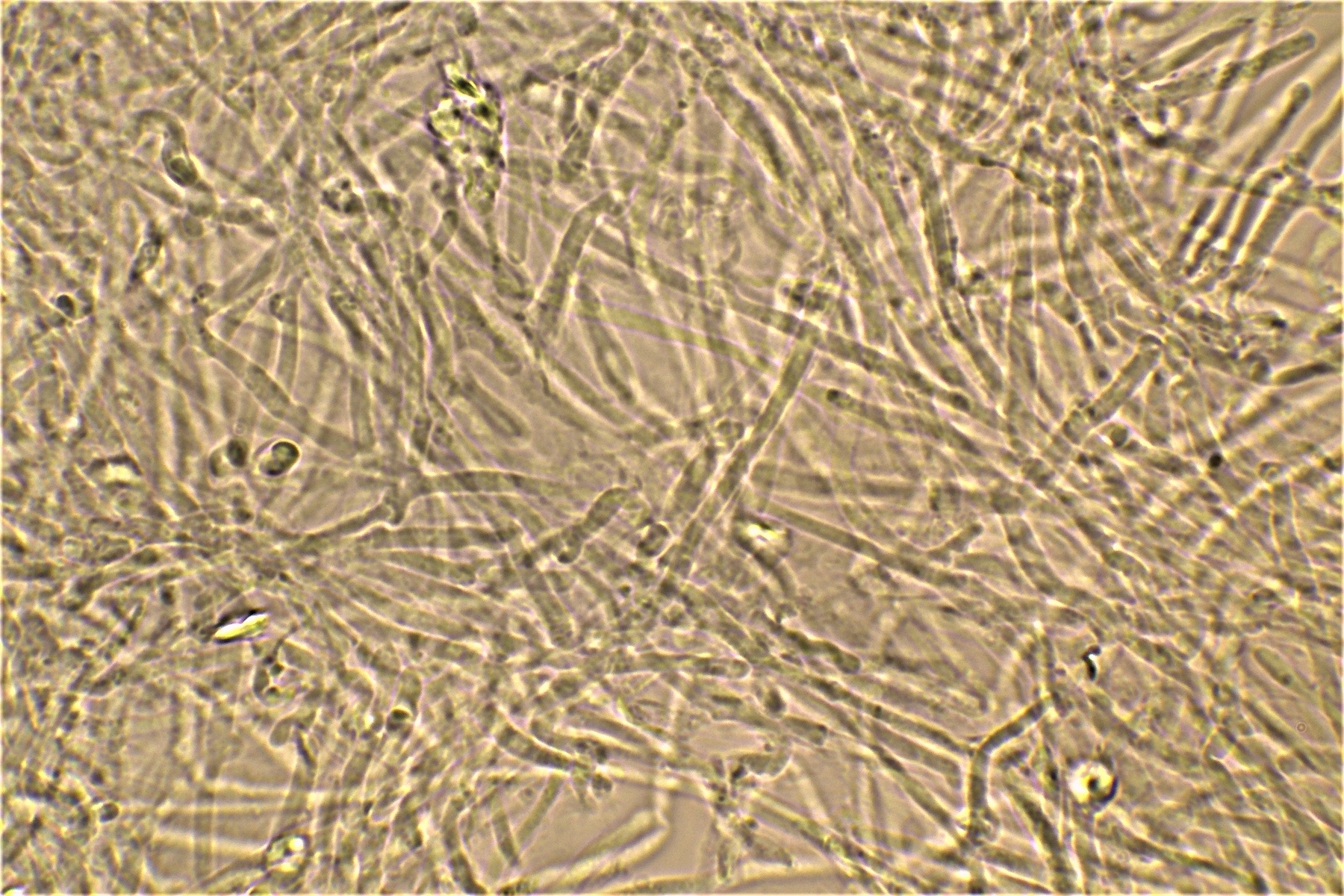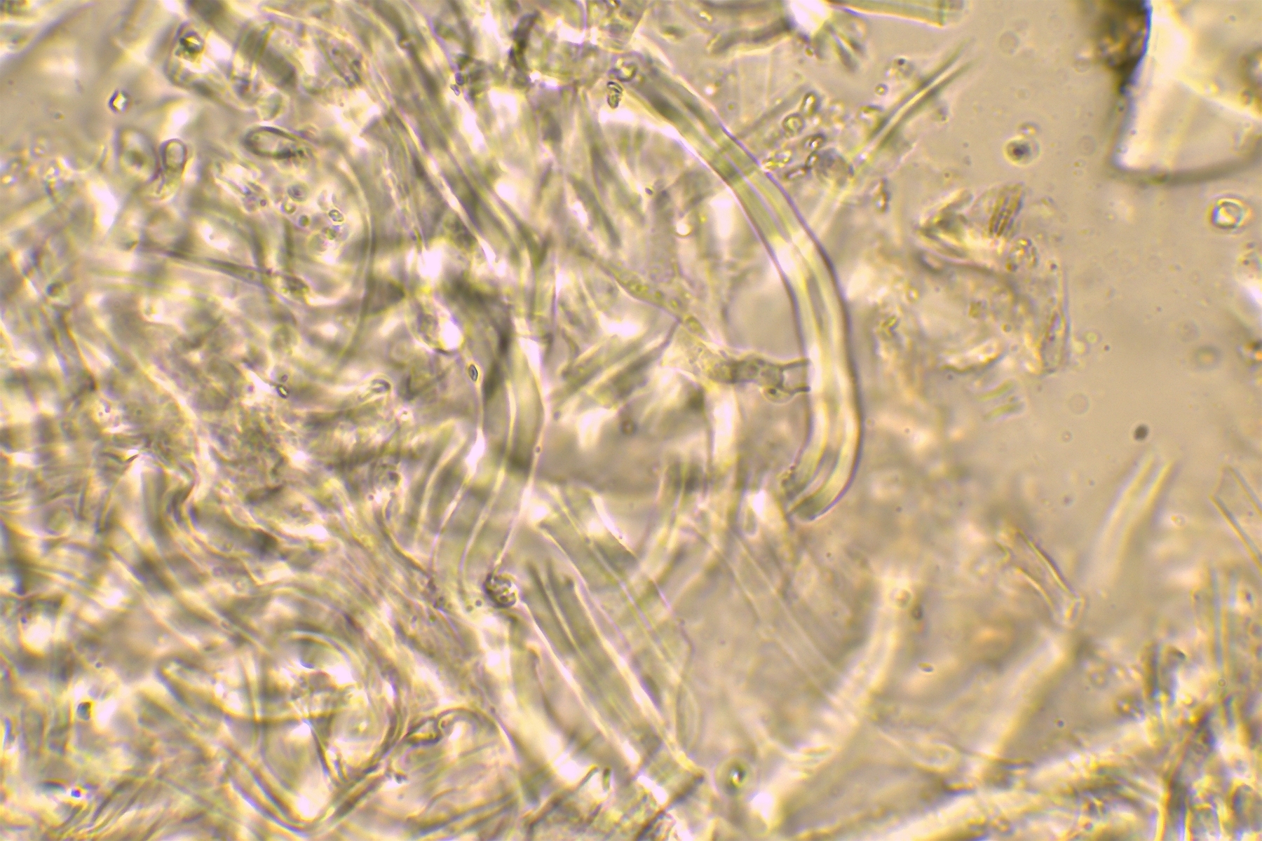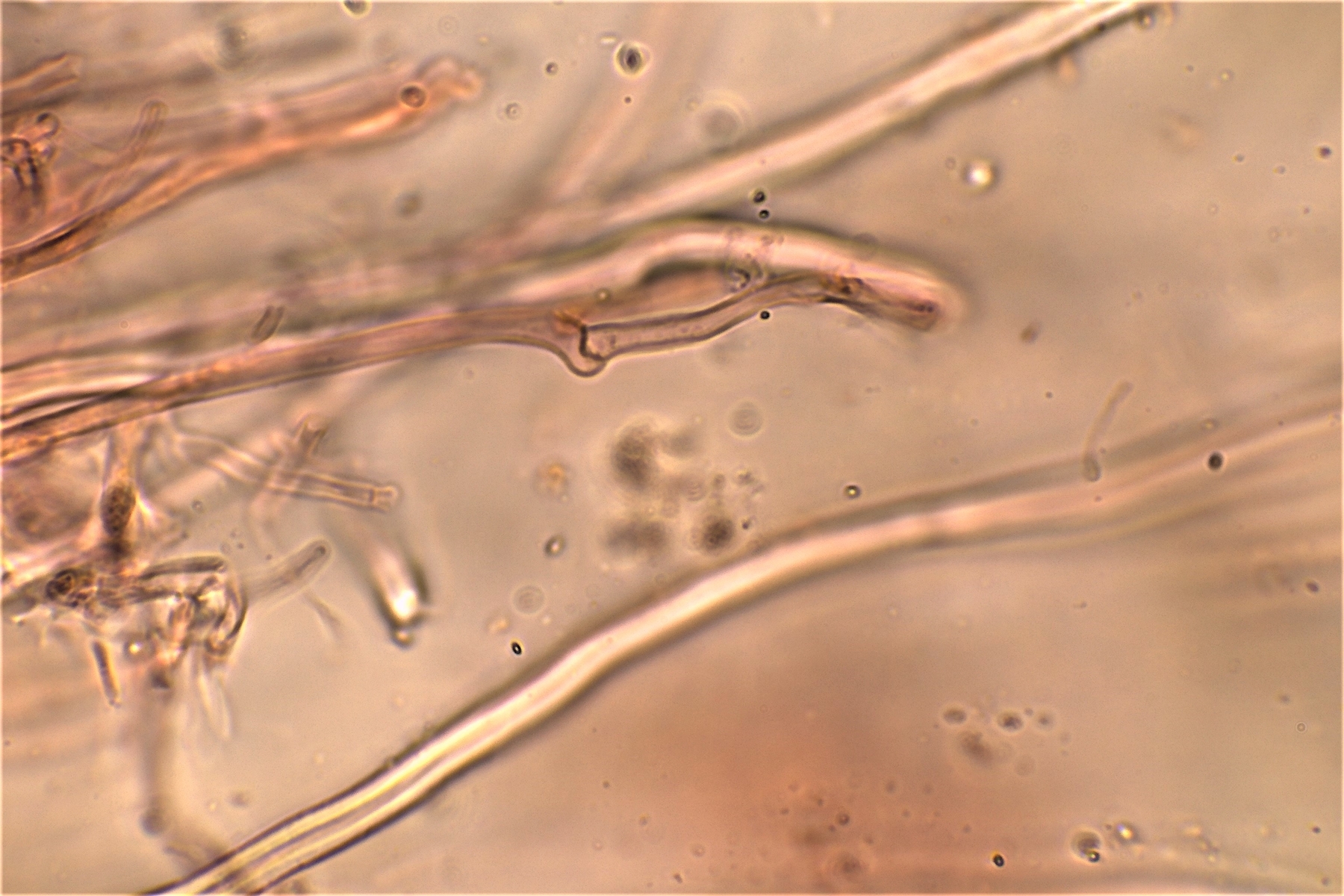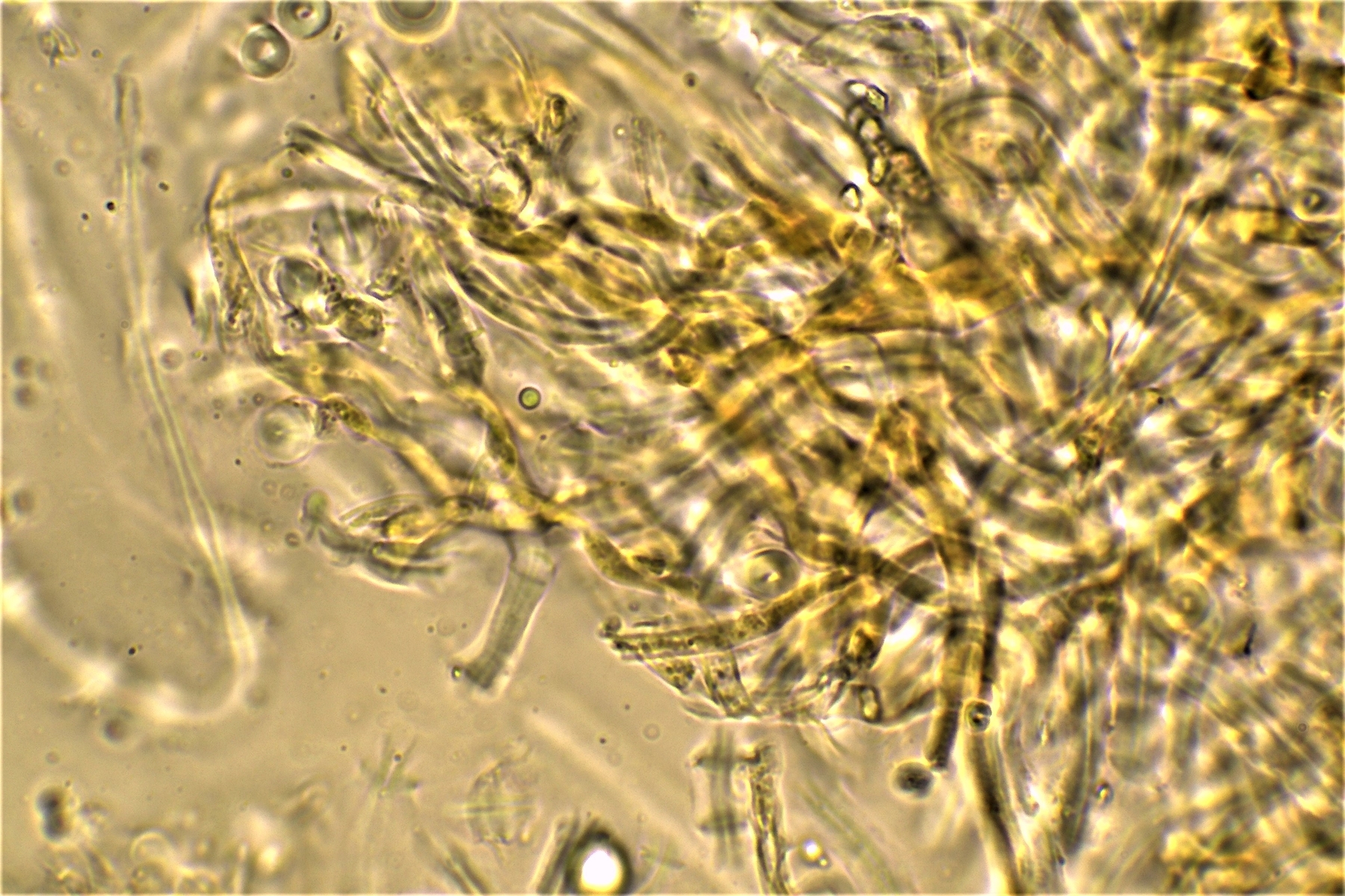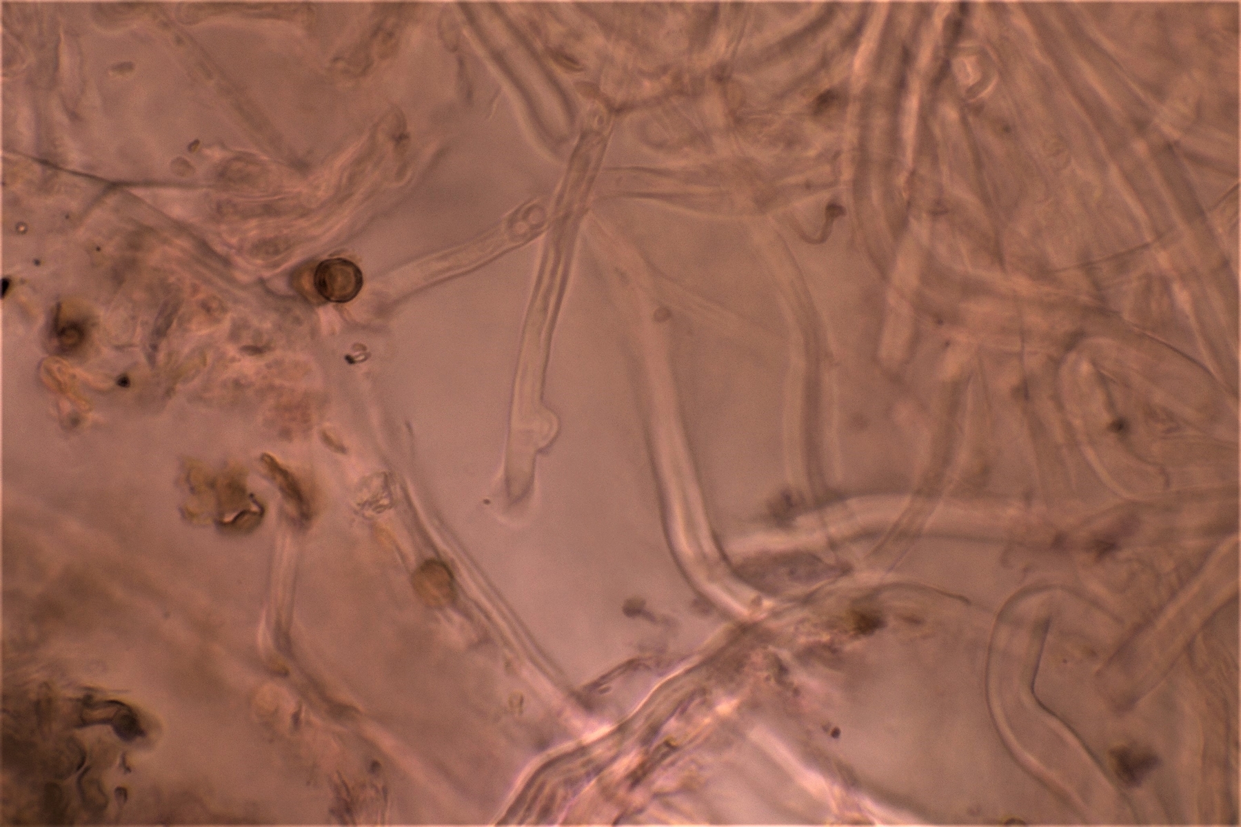 Gestern hatte ich schon einmal probiert mit 20% KOH kurz danach, und 30 Minuten später zu mikroskopieren. Die dickwandigen unseptierten Hyphen haben sich aufgelöst. Mit dem einfließen lassen des KOH direkt unter dem Deckgläschen werde ich nachholen! Das wußte ich nicht und deine Nachricht hatte ich Schussel leider zu spät gelesen. Danke noch einmal für deinen guten sehenswerten und famosen Tipp! Das ist auch etwas für unseren Mikroskopier Stammtisch bei den Pilzfreunden Saar-Pfalz, da werde ich ein paar Exsikkate trocknen damit wir uns das gemeinsam anschauen können beim nächsten Treffen. Es fehlen jetzt noch die Sporen, da gehe ich heute noch einmal auf die Suche und nehme an verschiedenen Stellen des Pilzes Proben. Wenn ich den Pilz trockne und dann schneide bekomme ich dünnere Schnitte hin, das hat auf jeden Fall besser geklappt. In Wasser, Kongorot NH3 und Melzer hatte ich auch noch einmal aus probiert, durch das dünnere Präparat konnte man die dimitrische Hyphenstruktur jetzt besser erkennen.