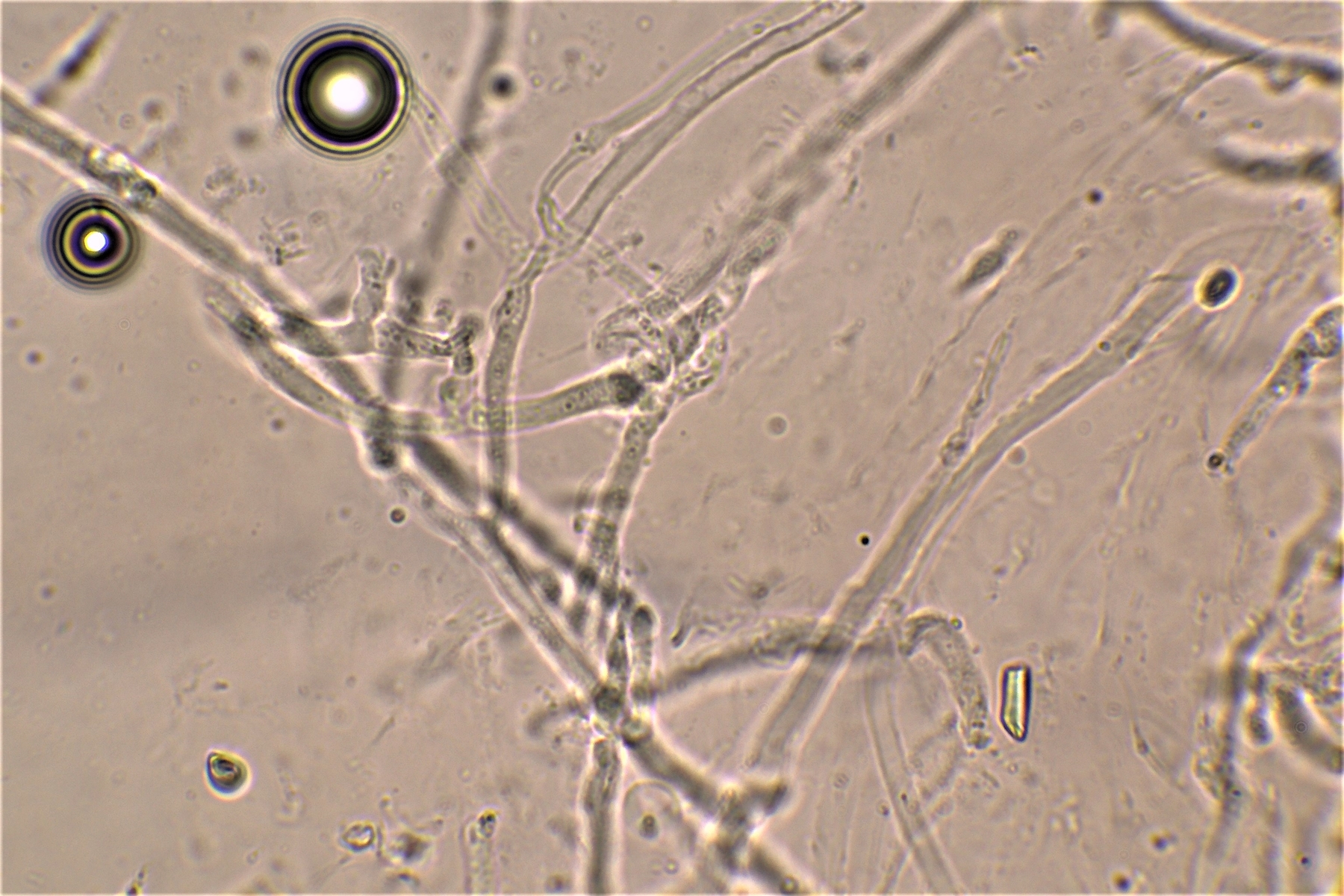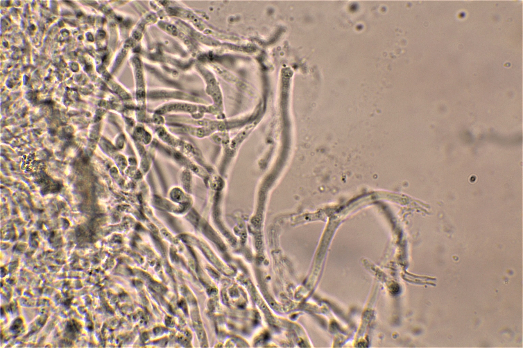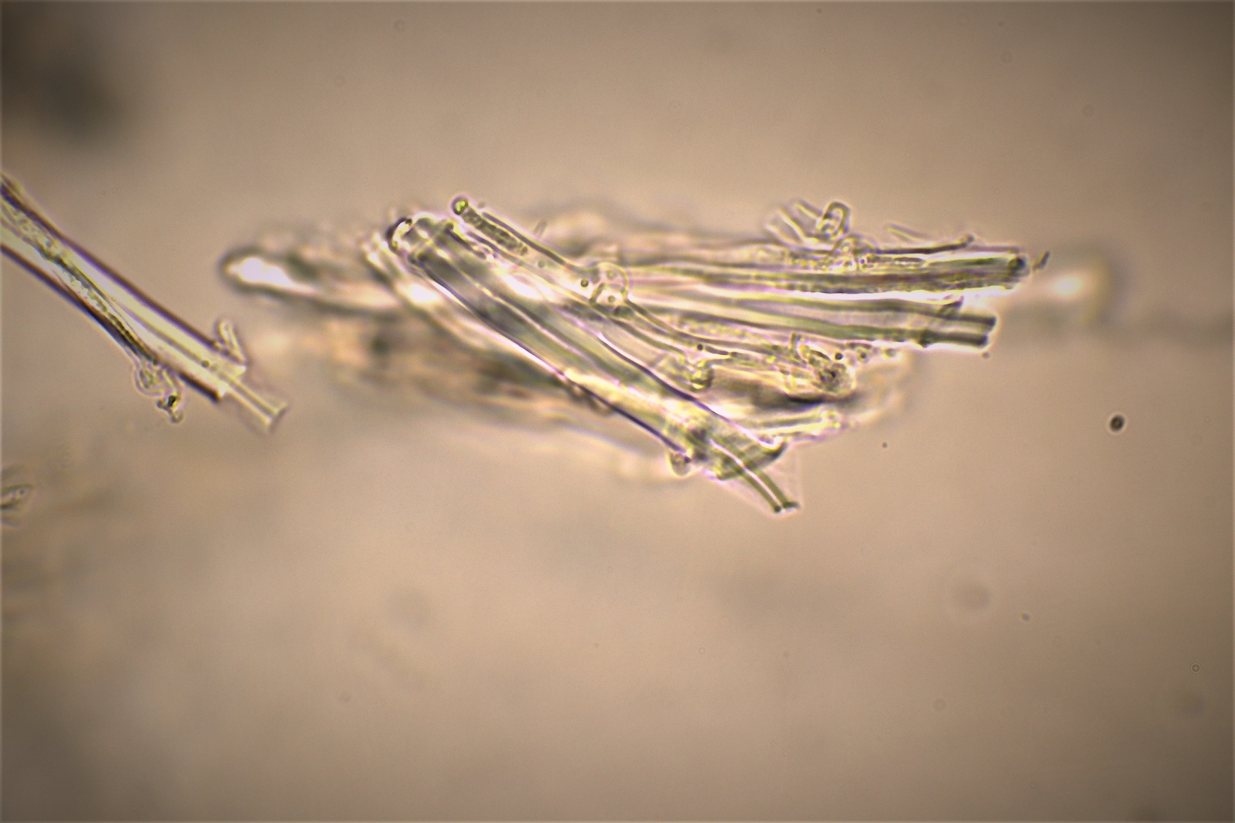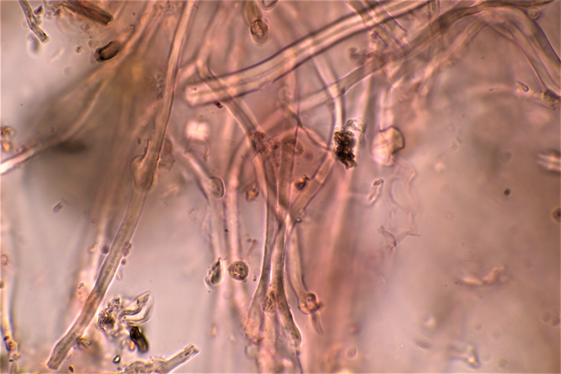 Gestern hatte ich schon einmal probiert mit 20% KOH kurz danach, und 30 Minuten später zu mikroskopieren. Die dickwandigen unseptierten Hyphen haben sich aufgelöst. Mit dem einfließen lassen des KOH direkt unter dem Deckgläschen werde ich nachholen! Das wußte ich nicht und deine Nachricht hatte ich Schussel leider zu spät gelesen. Danke noch einmal für deinen guten sehenswerten und famosen Tipp! Das ist auch etwas für unseren Mikroskopier Stammtisch bei den Pilzfreunden Saar-Pfalz, da werde ich ein paar Exsikkate trocknen damit wir uns das gemeinsam anschauen können beim nächsten Treffen. Es fehlen jetzt noch die Sporen, da gehe ich heute noch einmal auf die Suche und nehme an verschiedenen Stellen des Pilzes Proben. Wenn ich den Pilz trockne und dann schneide bekomme ich dünnere Schnitte hin, das hat auf jeden Fall besser geklappt. In Wasser, Kongorot NH3 und Melzer hatte ich auch noch einmal aus probiert, durch das dünnere Präparat konnte man die dimitrische Hyphenstruktur jetzt besser erkennen.