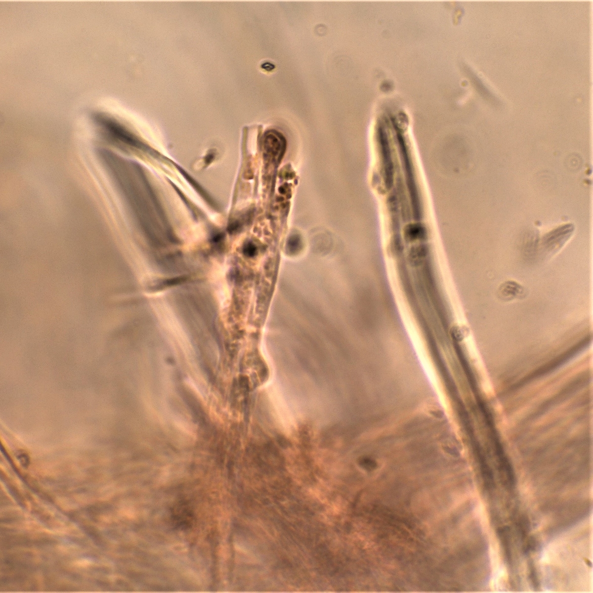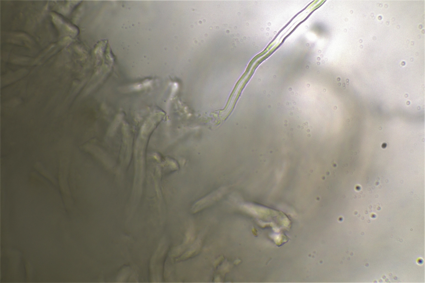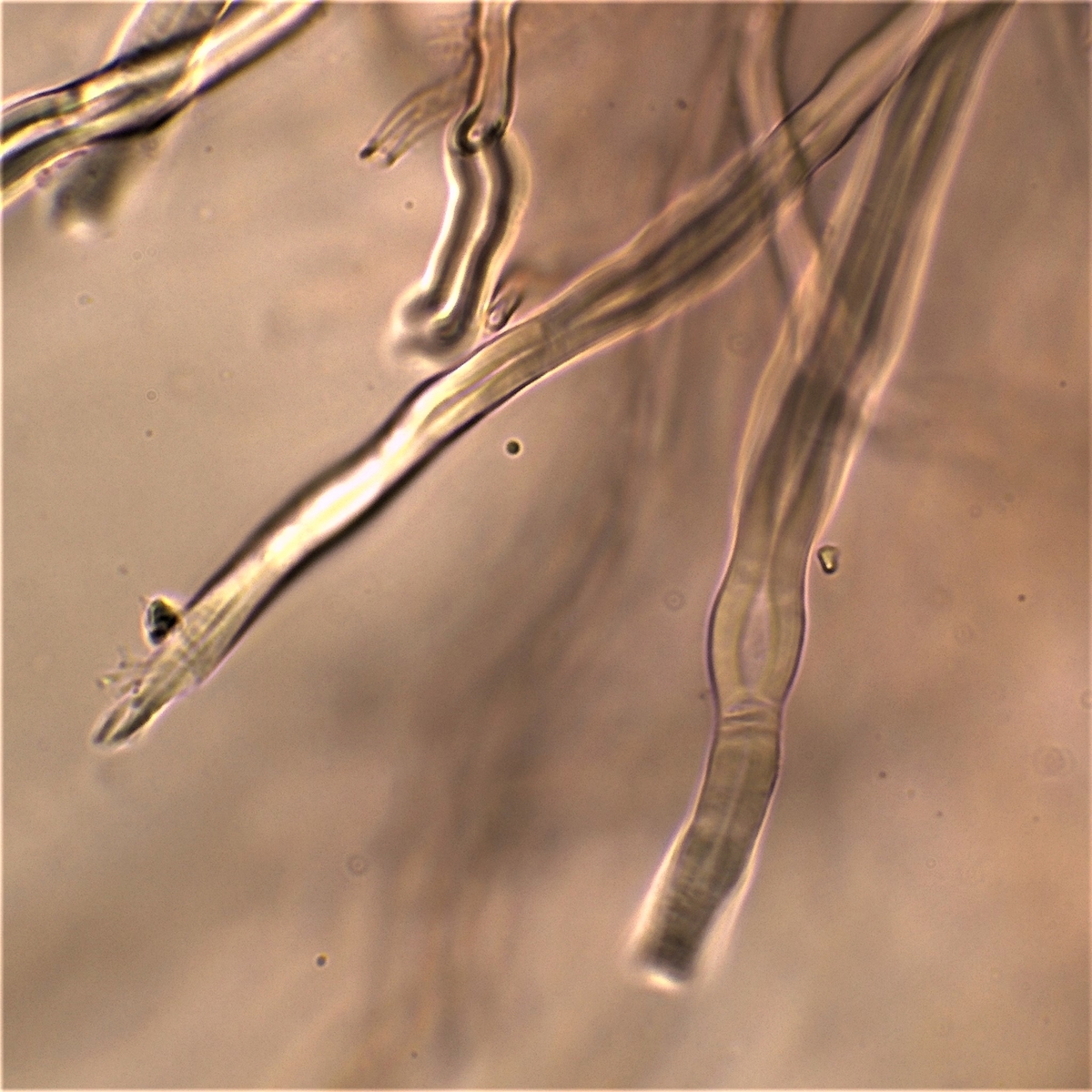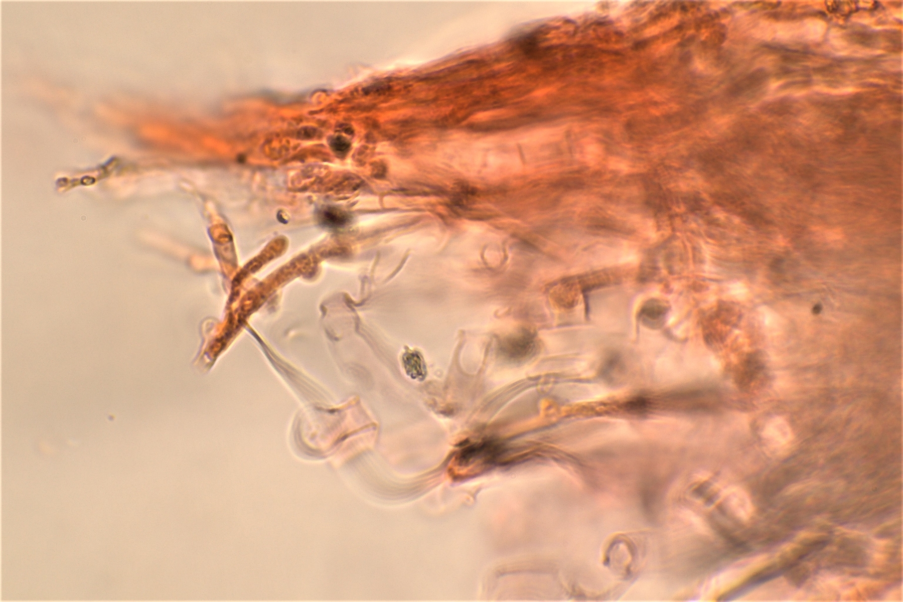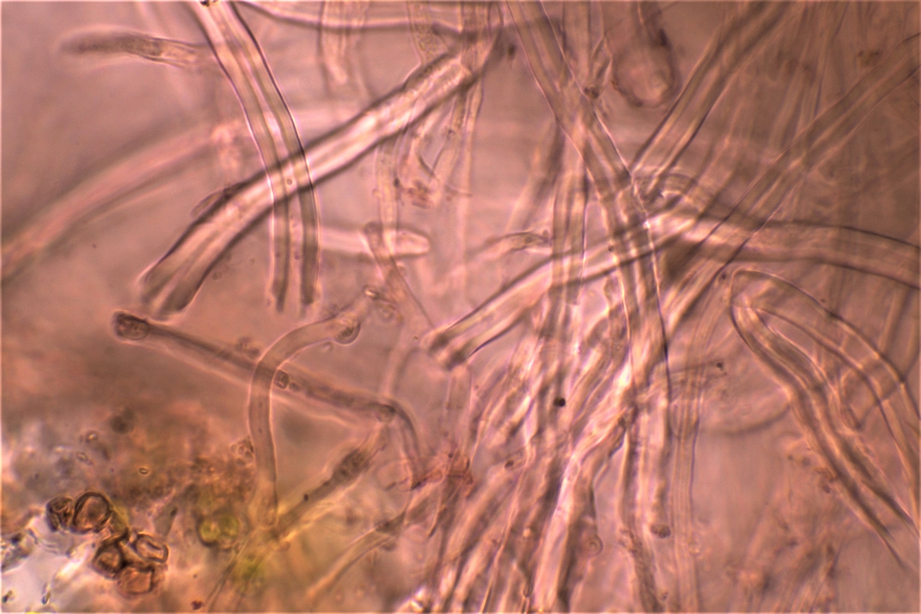 Gestern hatte ich schon einmal probiert mit 20% KOH kurz danach, und 30 Minuten später zu mikroskopieren. Die dickwandigen unseptierten Hyphen haben sich aufgelöst. Mit dem einfließen lassen des KOH direkt unter dem Deckgläschen werde ich nachholen! Das wußte ich nicht und deine Nachricht hatte ich Schussel leider zu spät gelesen. Danke noch einmal für deinen guten sehenswerten und famosen Tipp! Das ist auch etwas für unseren Mikroskopier Stammtisch bei den Pilzfreunden Saar-Pfalz, da werde ich ein paar Exsikkate trocknen damit wir uns das gemeinsam anschauen können beim nächsten Treffen. Es fehlen jetzt noch die Sporen, da gehe ich heute noch einmal auf die Suche und nehme an verschiedenen Stellen des Pilzes Proben. Wenn ich den Pilz trockne und dann schneide bekomme ich dünnere Schnitte hin, das hat auf jeden Fall besser geklappt. In Wasser, Kongorot NH3 und Melzer hatte ich auch noch einmal aus probiert, durch das dünnere Präparat konnte man die dimitrische Hyphenstruktur jetzt besser erkennen.