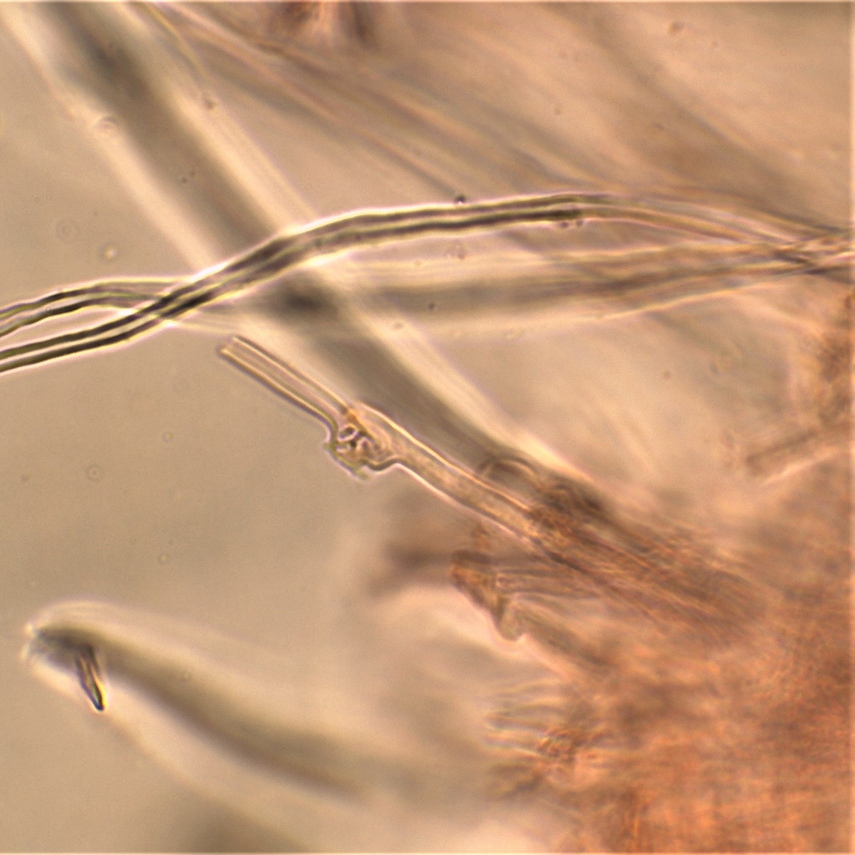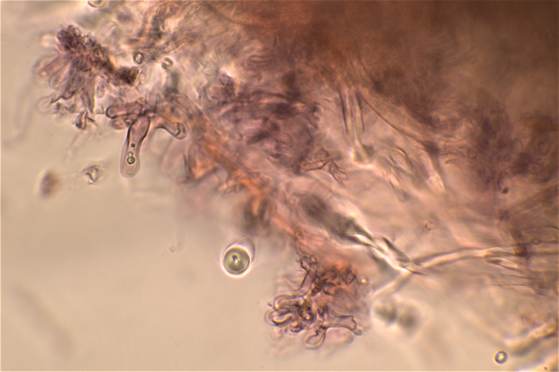 Ich könnte mir hier auch Cinereomyces lindbladii vorstellen, dann würden die Skeletthyphen aber in Kalilauge oder Ammoniak sich auflösen.