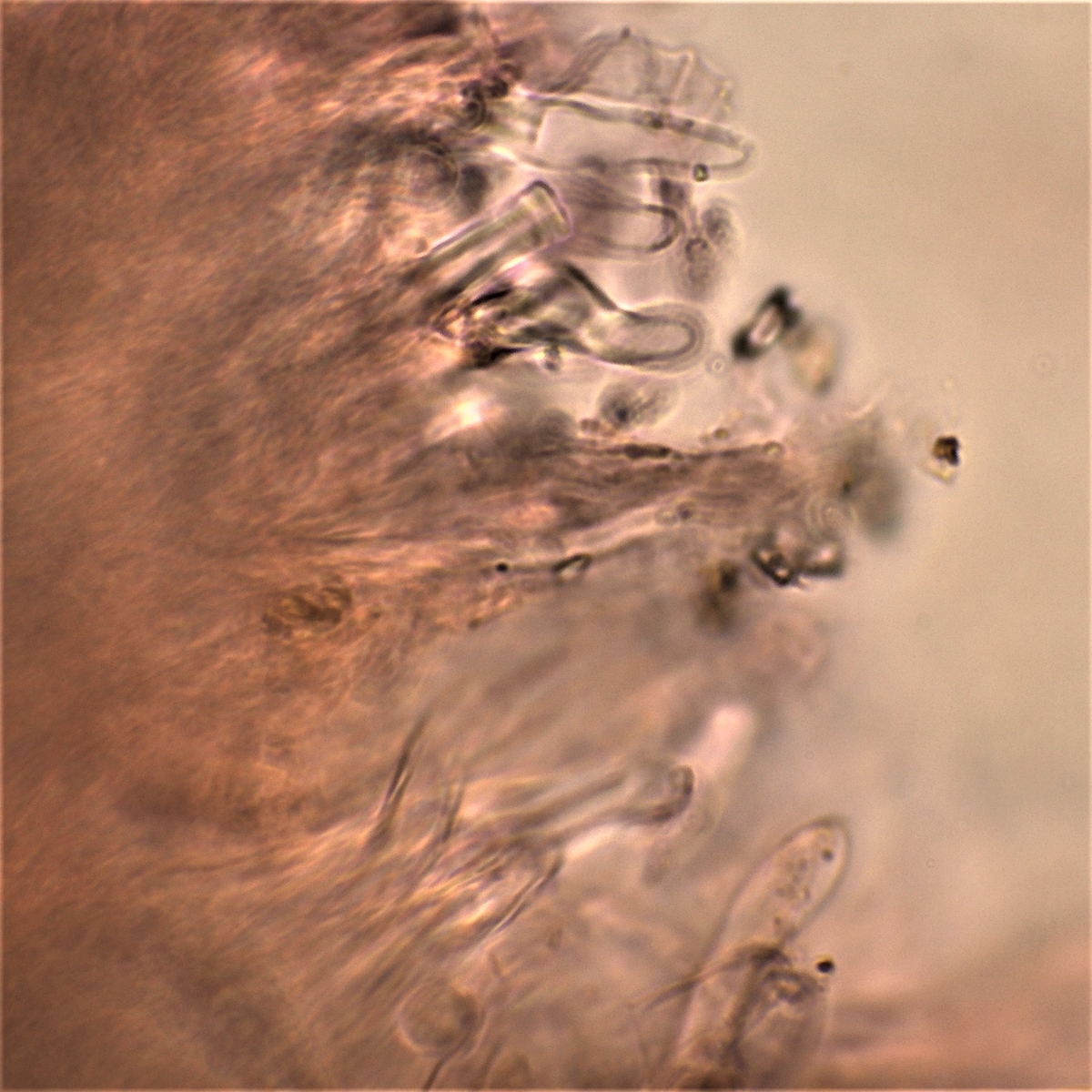 Wenn der Vorschlag von Andreas zutrifft, dann kannst du das leicht überprüfen: Ein Präparat in Wasser anfertigen, Stelle mit reichlich Skeletthyphen (bzw. den dickwandigen, unseptierten Hyphen) raussuchen, anschließend unterm Deckgläschen KOH einfließen lassen (klappt sogar mit 3-5% nur durch Einfließenlassen!!!). Wenn's Cinereomyces ist, kannst du direkt durch die Linsen beobachten, wie die dickwandigen Hyphen erst massiv aufquellen, und sich dann rasch auflösen. Sieht famos aus, und ich kenne keinen anderen PIlz, der das in der Form macht.