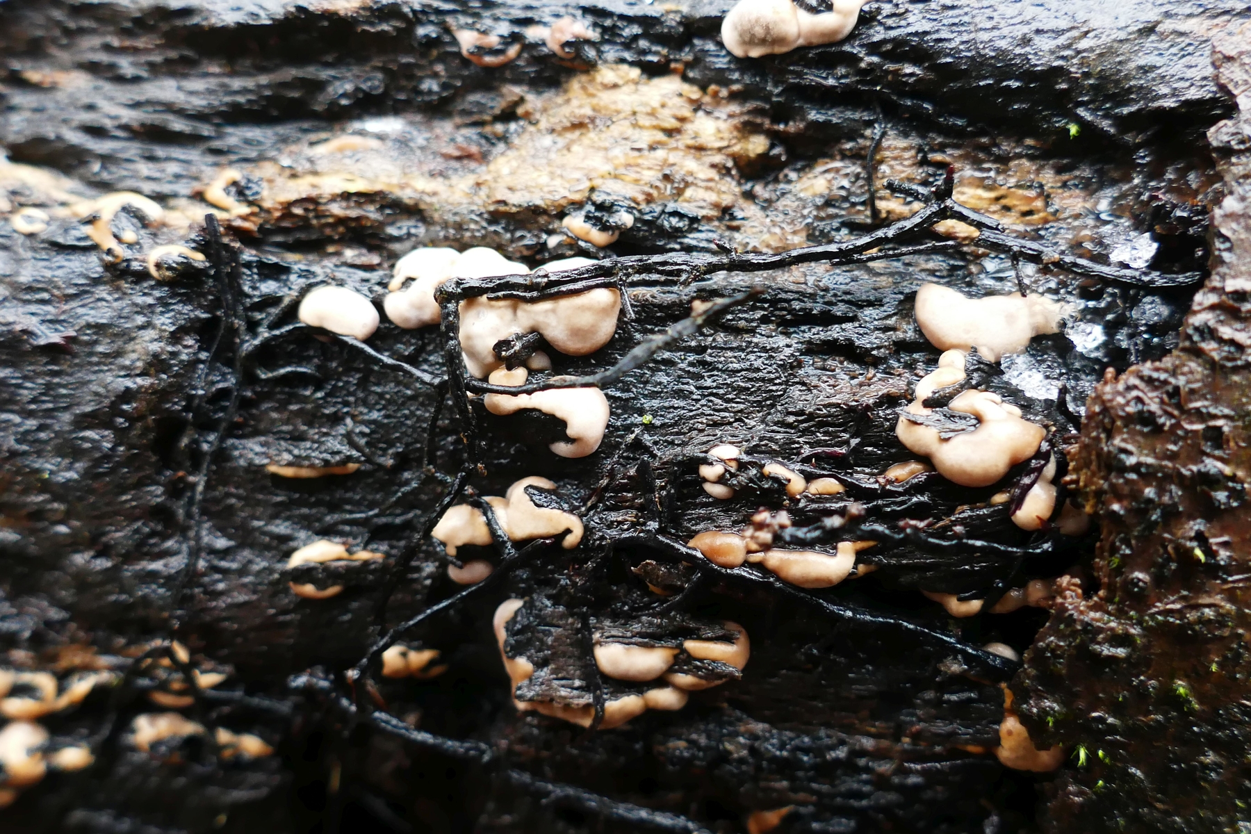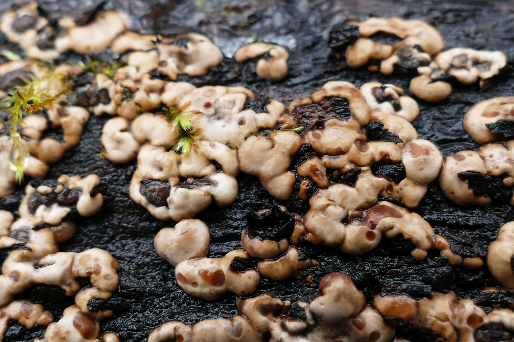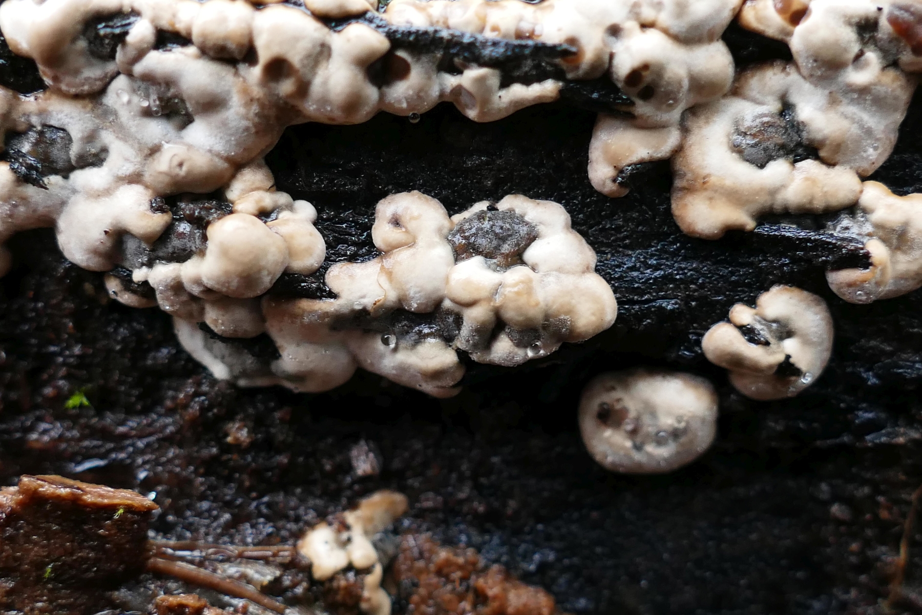 Das Schwarze ist wahrscheinlich angehobenes Holz; die Pilze scheinen sich von unterhalb hervorzuzwängen und heben dabei Teile der schwarz gefärbten Holzoberfläche mit an.