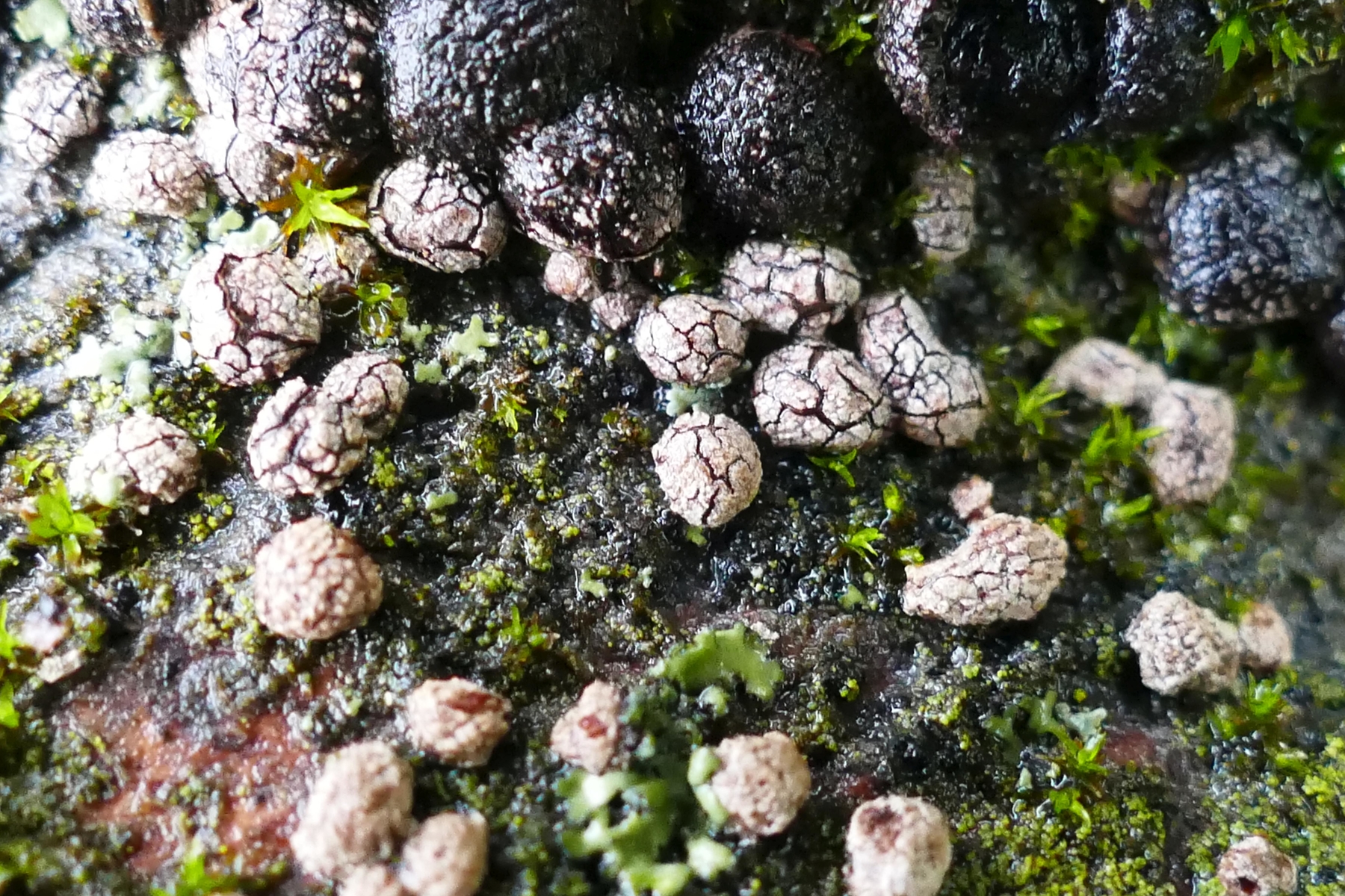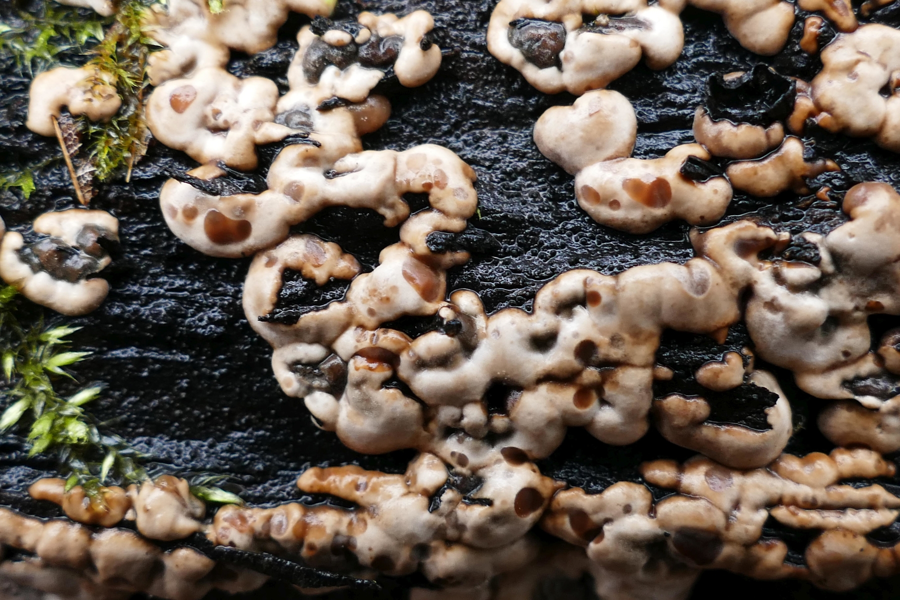Auf den hellen Fruchtkörpern lassen sich schwarze, braune und graue Strukturen erkennen: