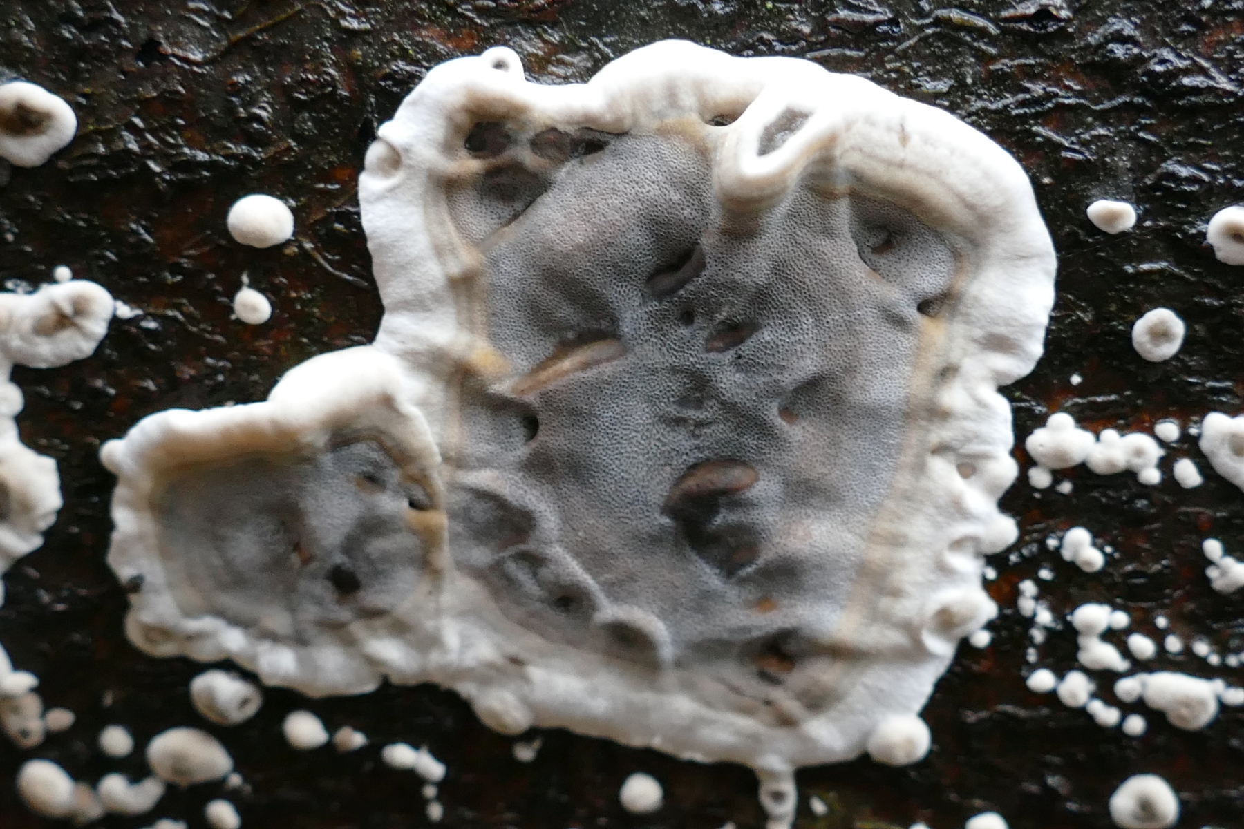 Daneben exisitieren auf den Fruchtkörpern die runden, transparent wirkenden, braunen Flecken (Bild 2+3). Damit kann ich nicht wirklich etwas anfangen, vielleicht Befall?Wenn die grauen Strukturen aber erste Porenbildungen sind, könnte es sich vielleicht um junge Bjerkanderae adustae (Angebrannte Rauchporlinge) handeln?