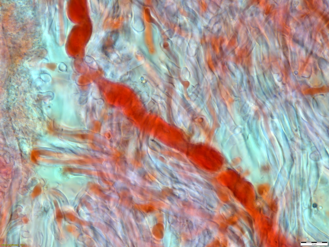 Hymenium (20 mm) nicht poroid, sondern extrem stark zerschlitzt und hydnoid; generative Hyphen mit Schnallen, wenige Skeletthyphen oder sklerosierte Hyphen (mit Inhalt? wenn ja welcher?)