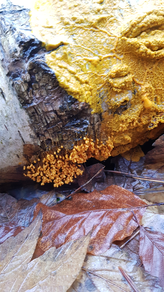 Ich bin keine Expertin, aber ich hab grad mal mit der Beschreibung und den Fotos zu Badhamia utricularis in Marion Geibs Myxomyceten verglichen und das passt gut. Sie zeigt auch so ein großflächiges gelbes Plasmodium, was "Adern bildet", und schreibt, dass die Art makroskopisch gut zu bestimmen sei. Auch die Jahreszeit ist typisch.