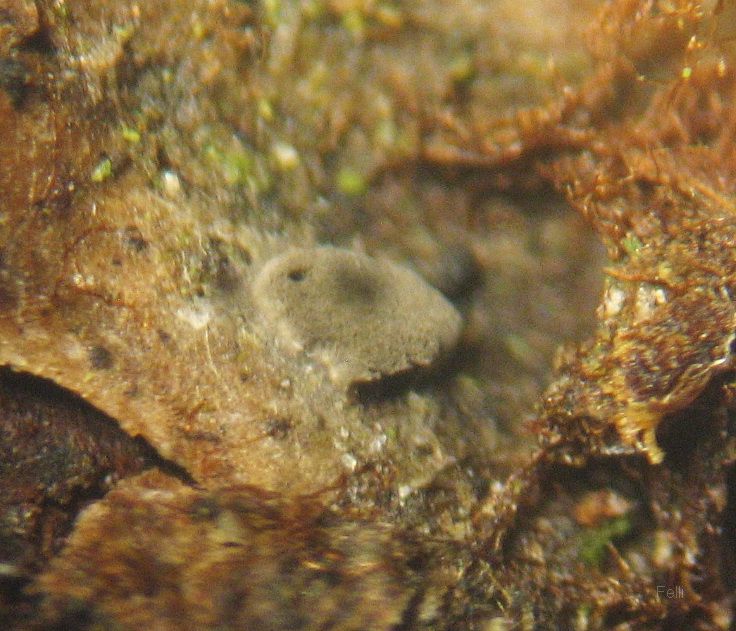 Auf einem Hölzchen fand ich ein graubraunes Polster mit eine Durchmesser von ca.:2 mm.
