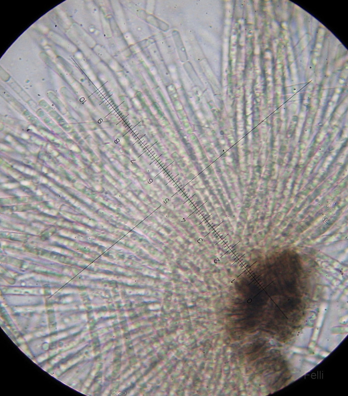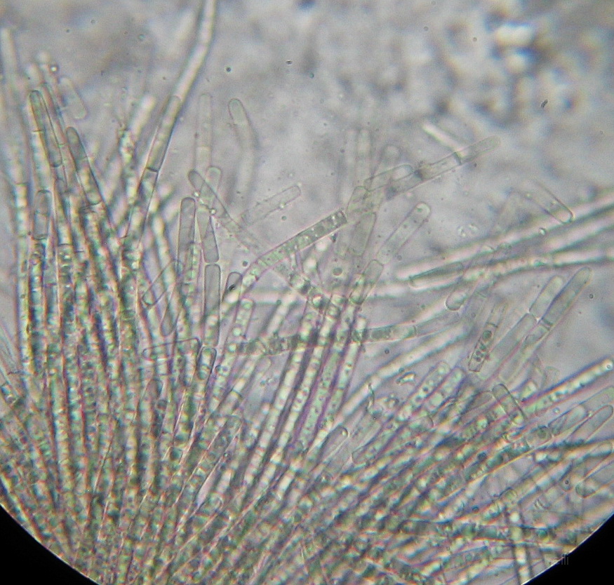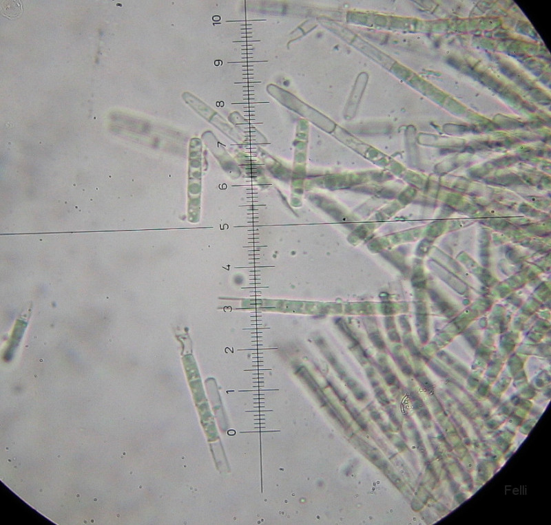 Meistens erst in ca 20x3µ lange Teile mit Guttulen und später dann weiter in kurze ca 5µ lange Teilsporen.