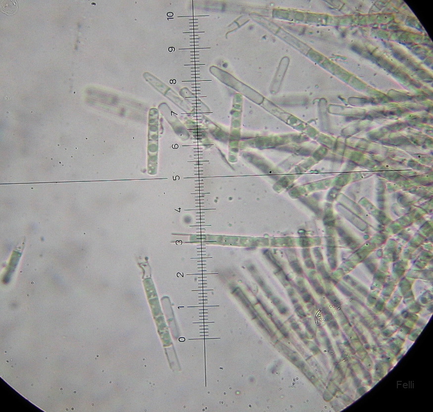 Meistens erst in ca 20x3µ lange Teile mit Guttulen und später dann weiter in kurze ca 5µ lange Teilsporen.
