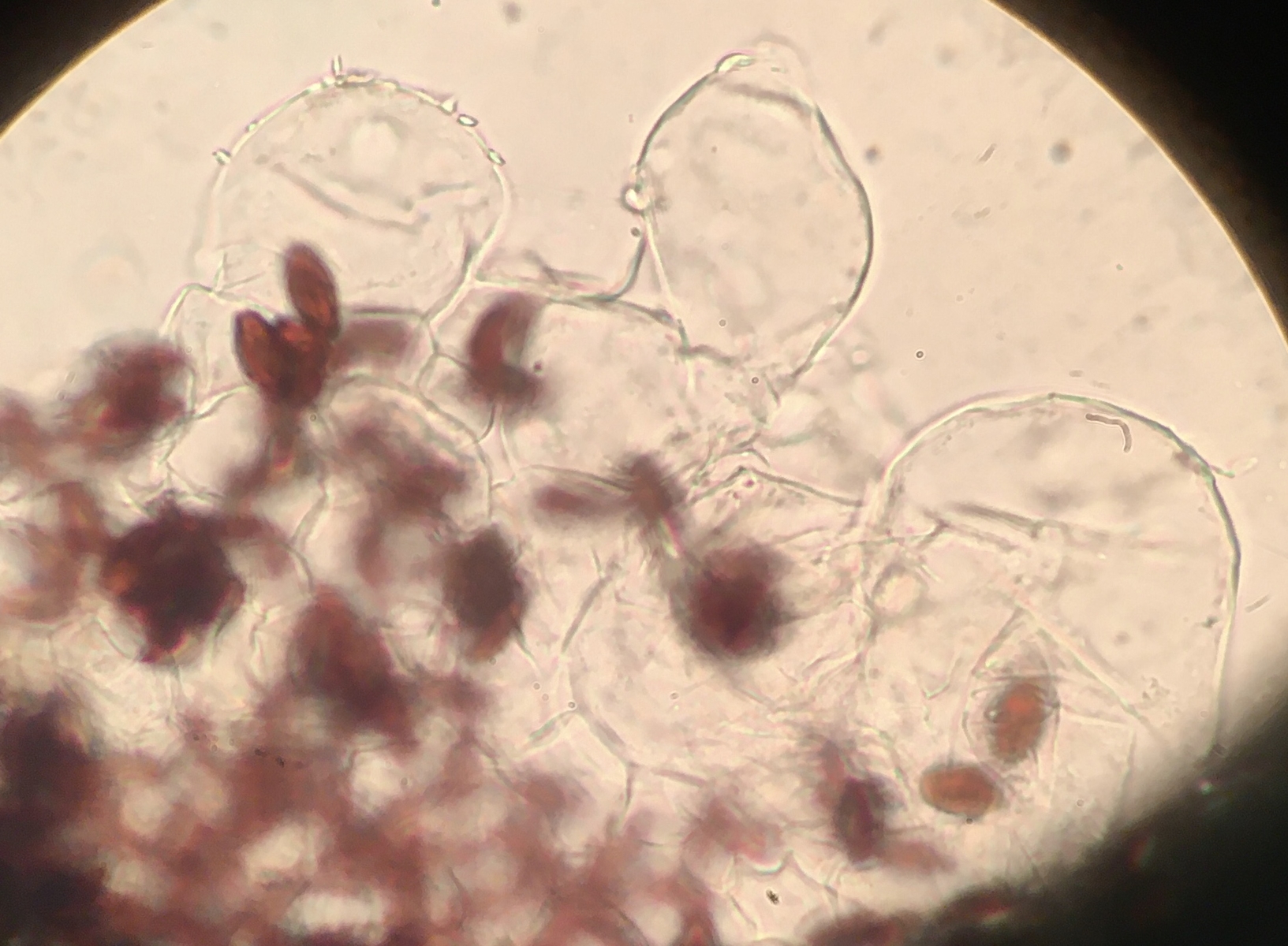 Mikroskopiert werden muss in der Tat immer, einige andere aus der Sektion wachsen unter selben ökologischen Umständen (cinereofloccosus, martinii z.B.). Um die 2- bzw. 4-sporigkeit nachzuweisen ist es sinnvoll, ein Stück Lamelle mit der Fläche auf den Objektträger zu legen und dann ungequetscht (!) bei kleiner Vergrößerung draufzuschauen. Mit dem 10er-Objektiv und man kann sich sogar das Deckgläschen sparen. Dann sieht man ein schönes regelmäßiges Blümchenmuster und ob die dunklen Sporen zu viert stehen oder zu zweit.