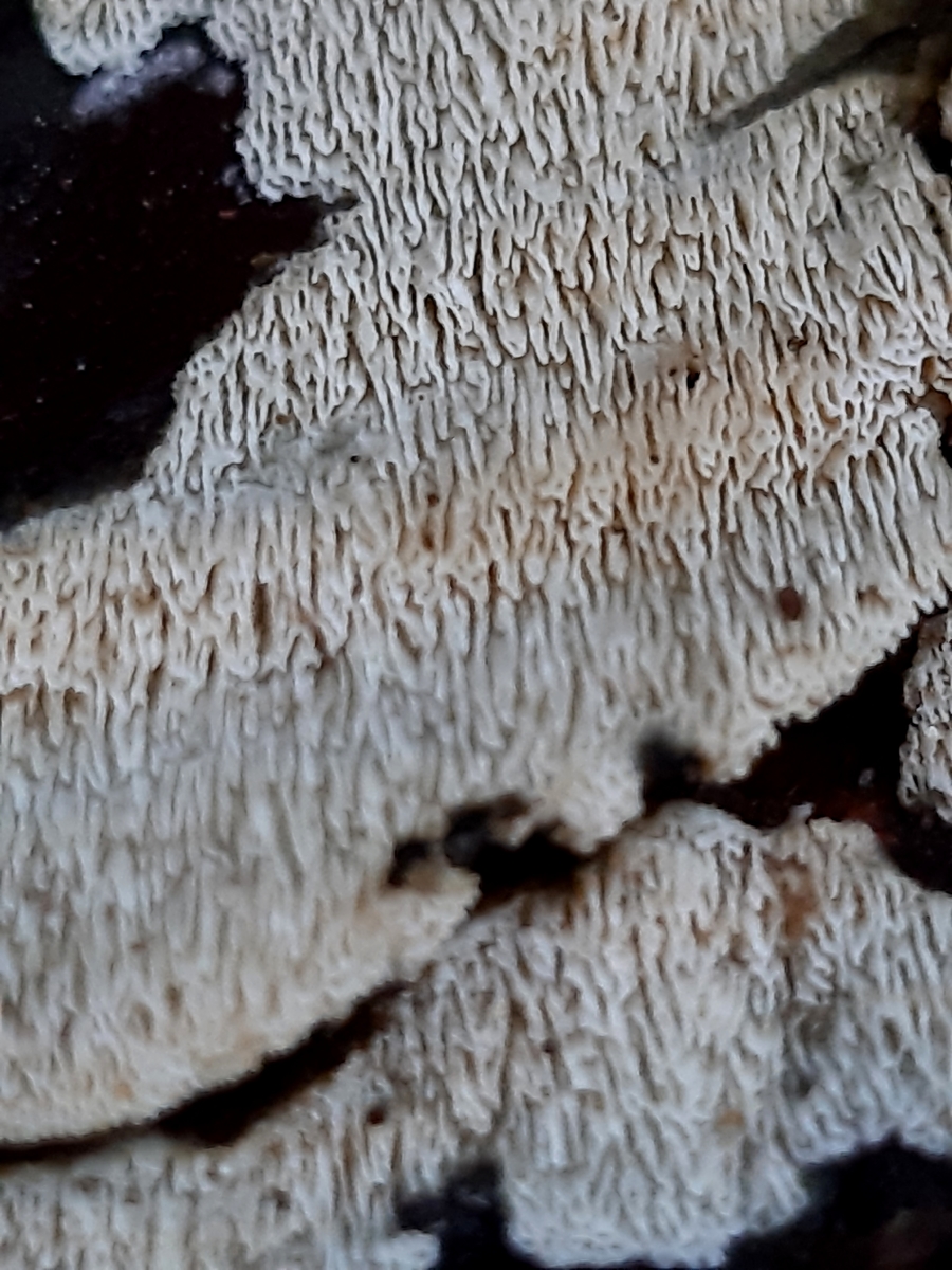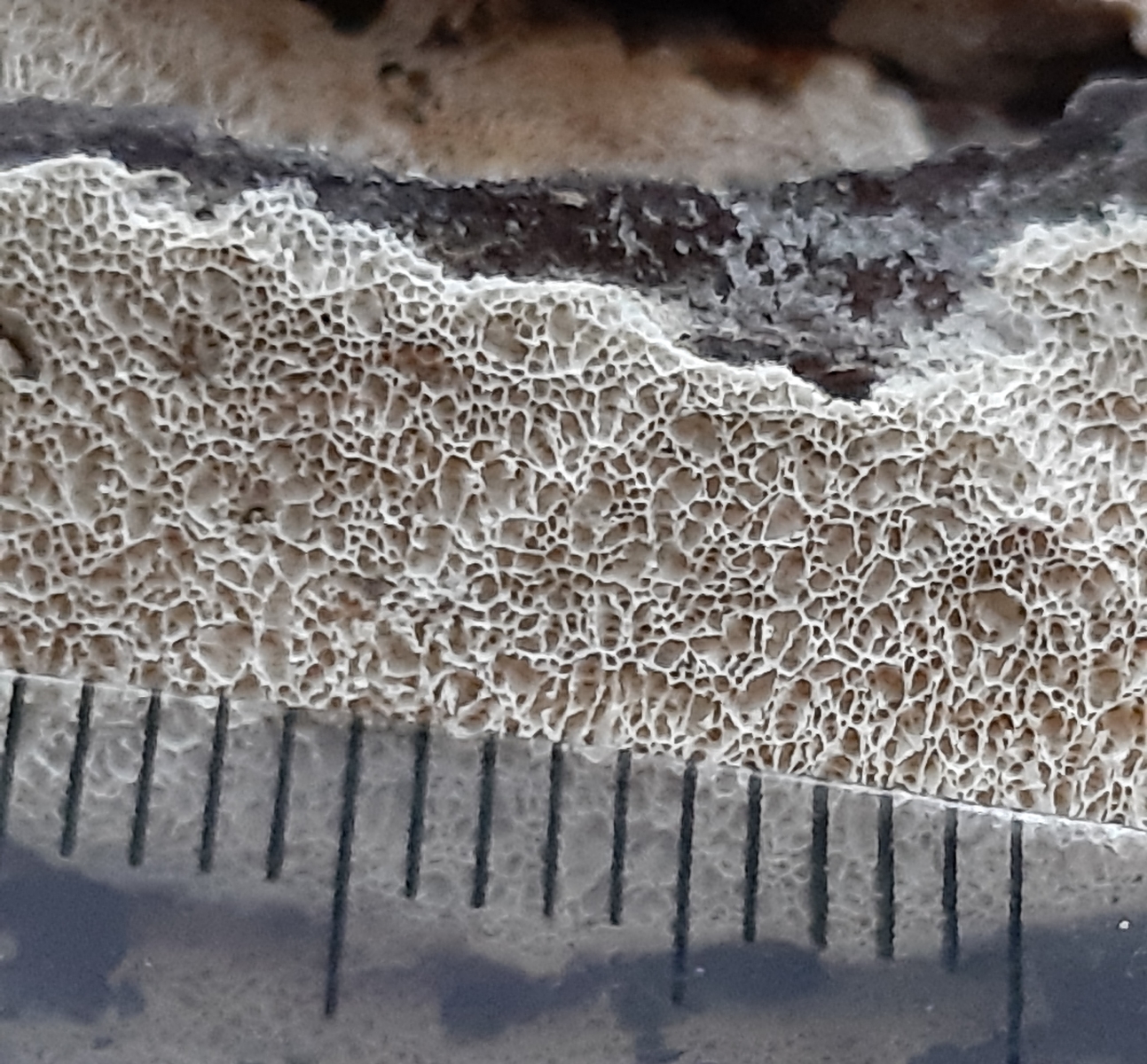 vorgestern hatte ich auf einem Nadelholzstamm einen resupinaten Porling gefunden. Die Fruchtkörper befanden sich seitlich am Holz und hatten eine hell ockerbräunlichen Farbton, die Zuwachszone ist heller weisslich. Die Poren sind unregelmäßig rund bis länglich und bilden auch in der Tiefe noch kleinere Porenverbindungen und Miniporen in größer aufgerissenen langgestreckten Poren. Der Pilz hatte weißes Sporenpulver und für mich keinen Geruch. Ablösbar war er nicht, nur durch eine gesamte Borkenplatte. Dicke des Fruchtkörpers bis 1mm.