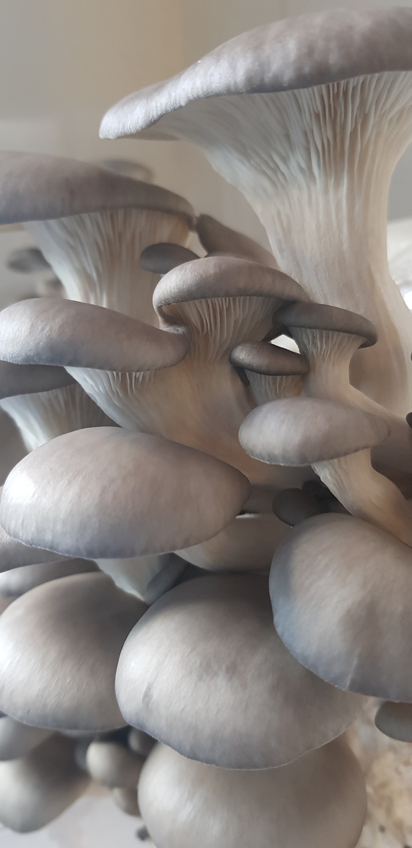 • Die einheimischen Austern sind etwas komplizierter in der Kultivierung, da sie nur nach einem Kälteschock zu fruchten beginnen. Wenn man die Pilze in großem Maßstab anbauen möchte, bräuchte man neben einem Fruchtungsraum mit ~10-15 Grad und einem Durchwachsraum mit ~24 Grad zusätzlich noch ein Kühlhaus.