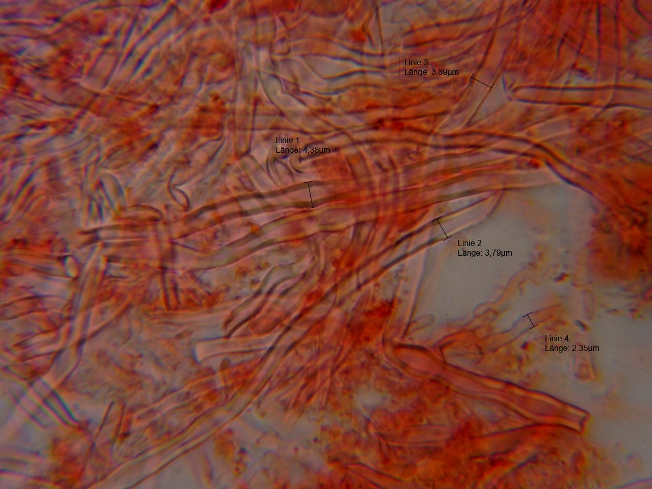 Geschlitzporig, nur am Rand rund, Basidien 4-sporig, Hyphen dünnwandig, mit Schnallen, Sporen, glatt, inamyloid, zylindrisch. Zystiden keine festgestellt.