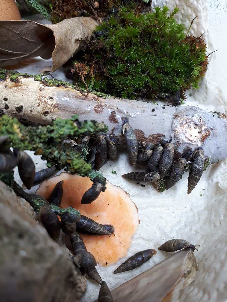 auf einen (Rinden?)pilz fahren meine Kleinen voll ab. Er sitzt an Eichenzweigen und wirkt wie ein dünner, grauer Samt - Belag. Wenn ich einen befallenen Ast mit reinbringe, sind die sonst lahmen Gesellen blitzschnell auf den Füßen. Aber was fressen sie da genau?