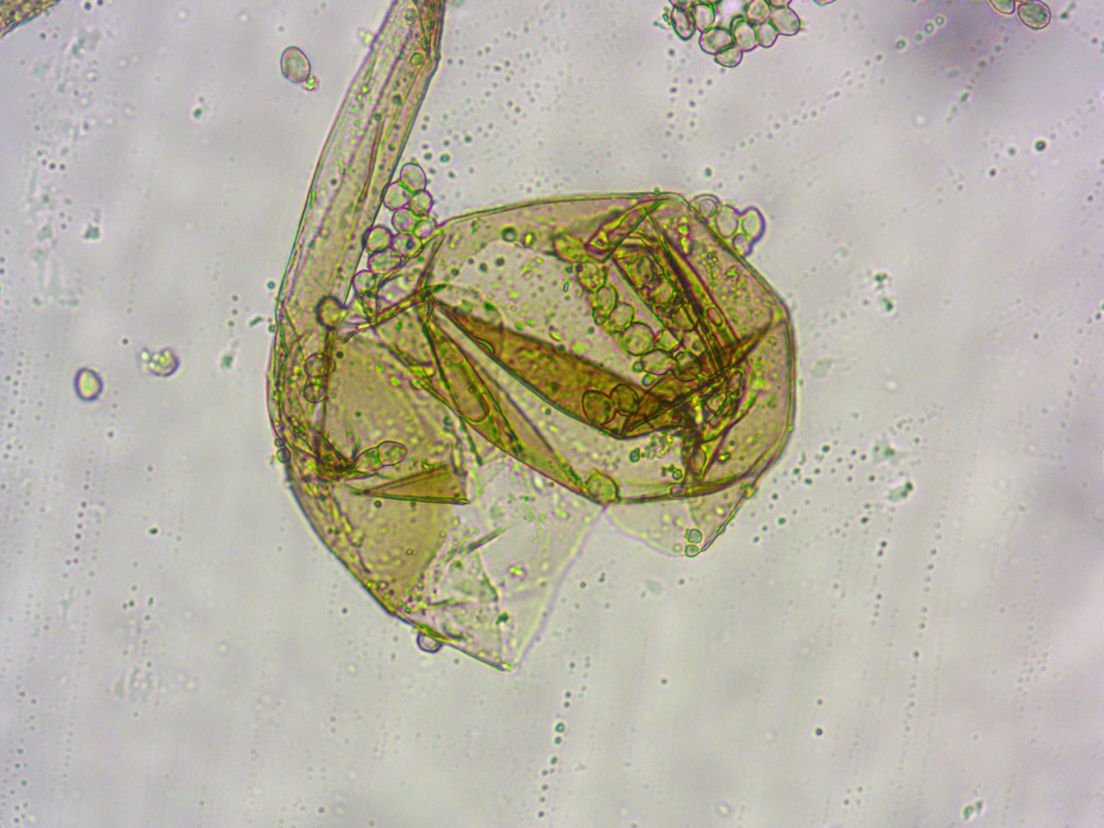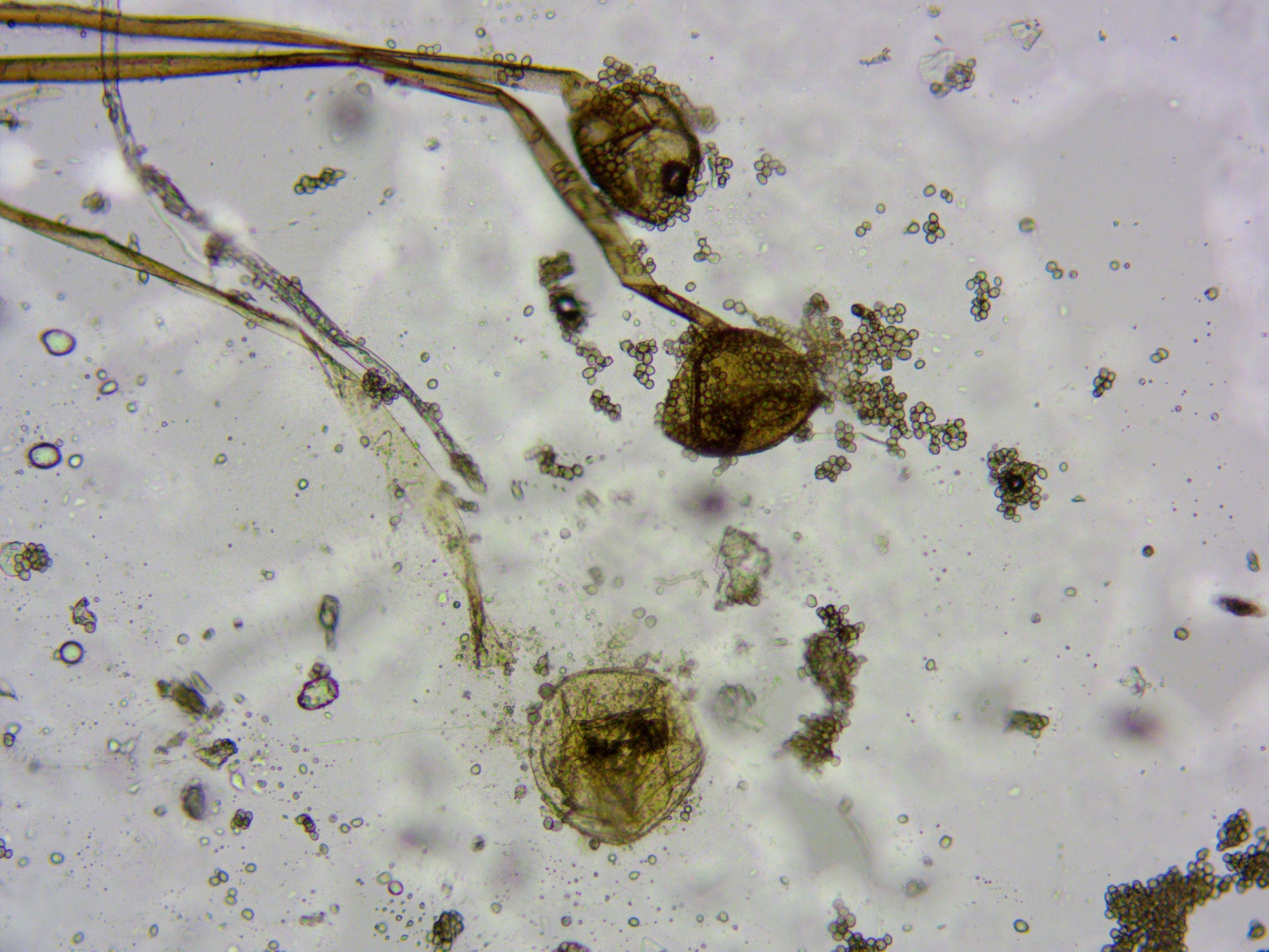 "Köpfchen" in 100-facher Vergrößerung. Leider ist der obere Teil des Sporangiophors nicht gut erkennbar.