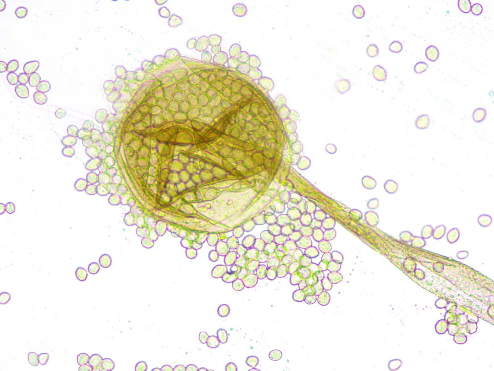 Sporangium in 400-facher Vergrößerung. Leider ist der obere Teil des Sporangiophors nicht gut sichtbar...