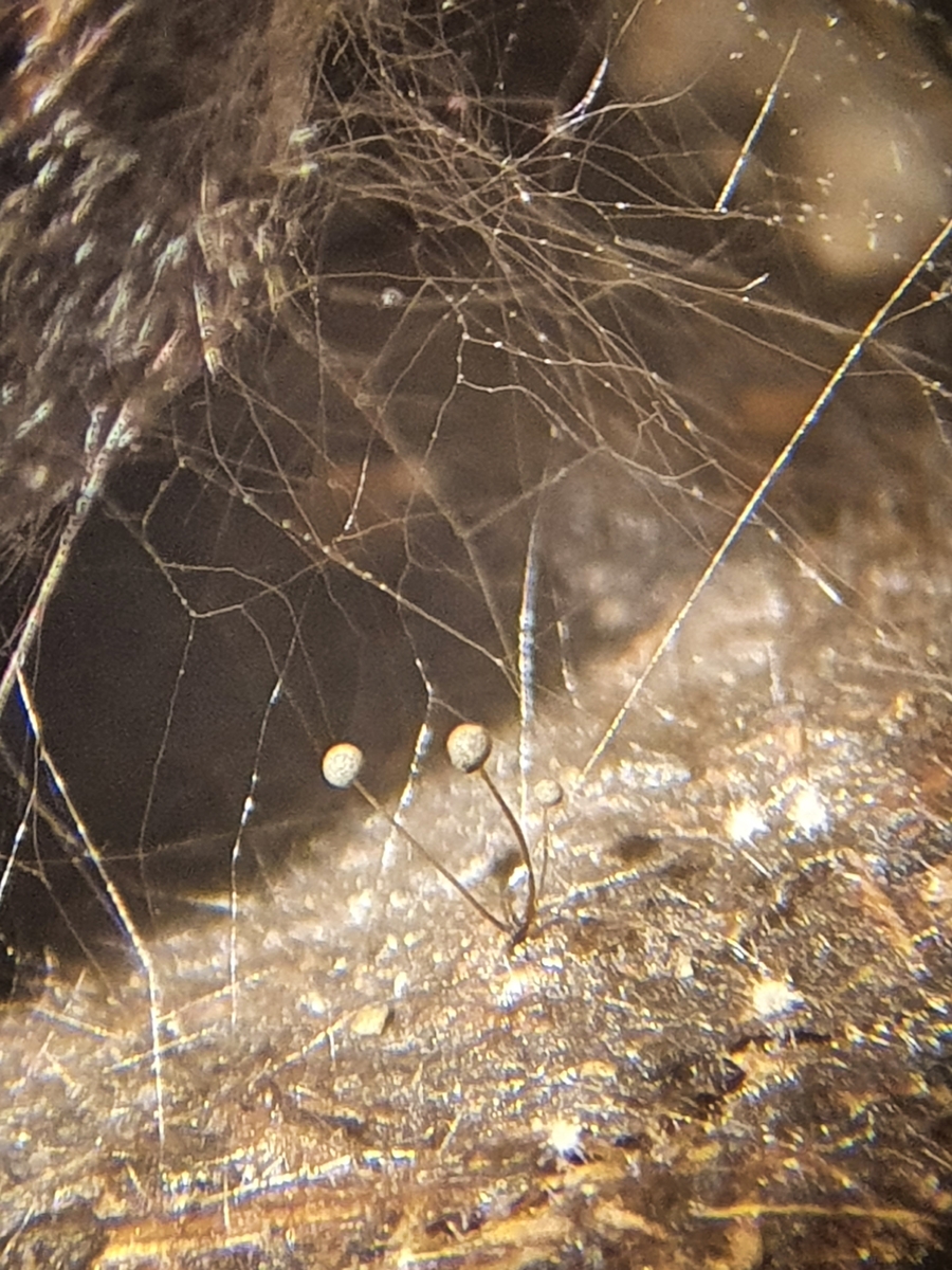 "Köpfchen" in 100-facher Vergrößerung. Leider ist der obere Teil des Sporangiophors nicht gut erkennbar.