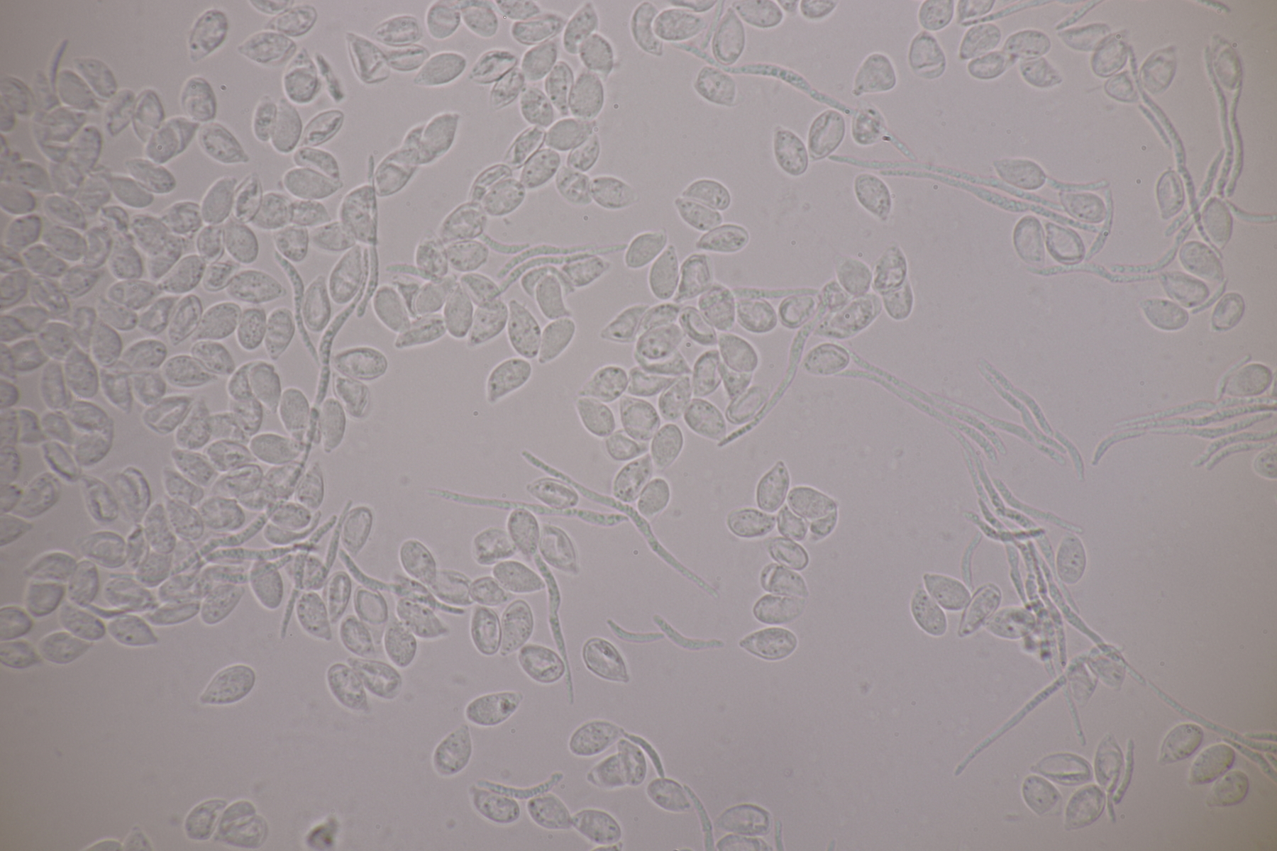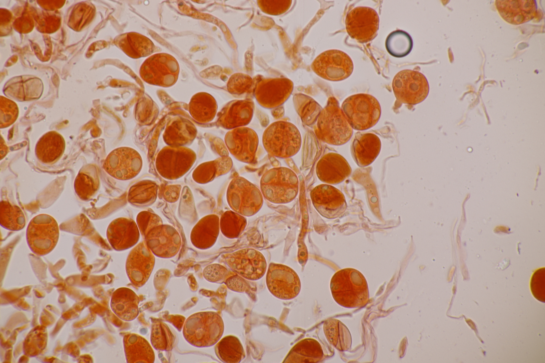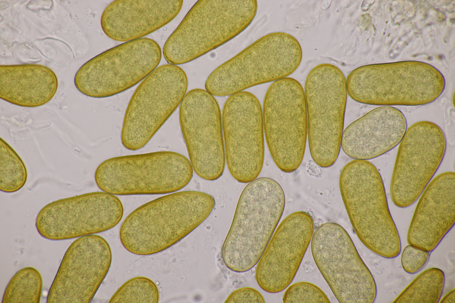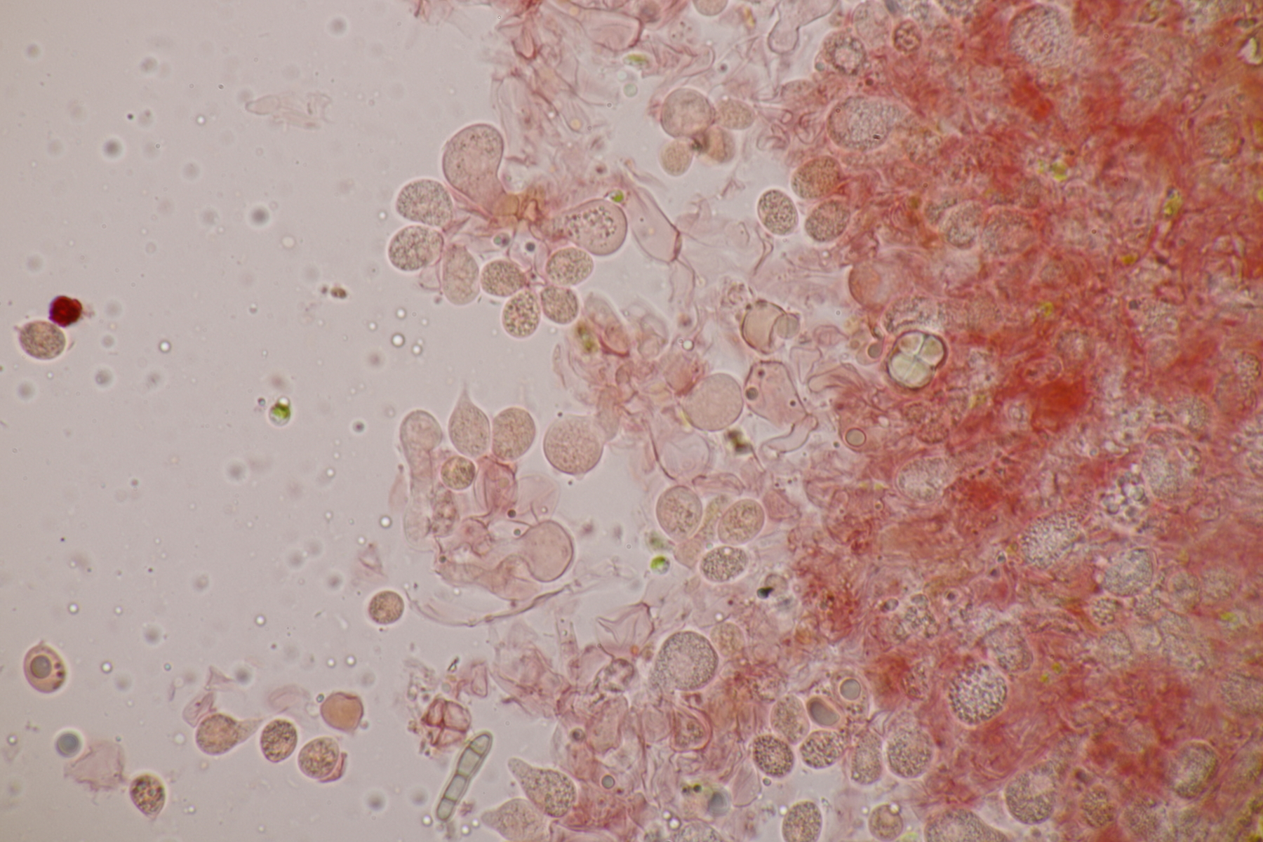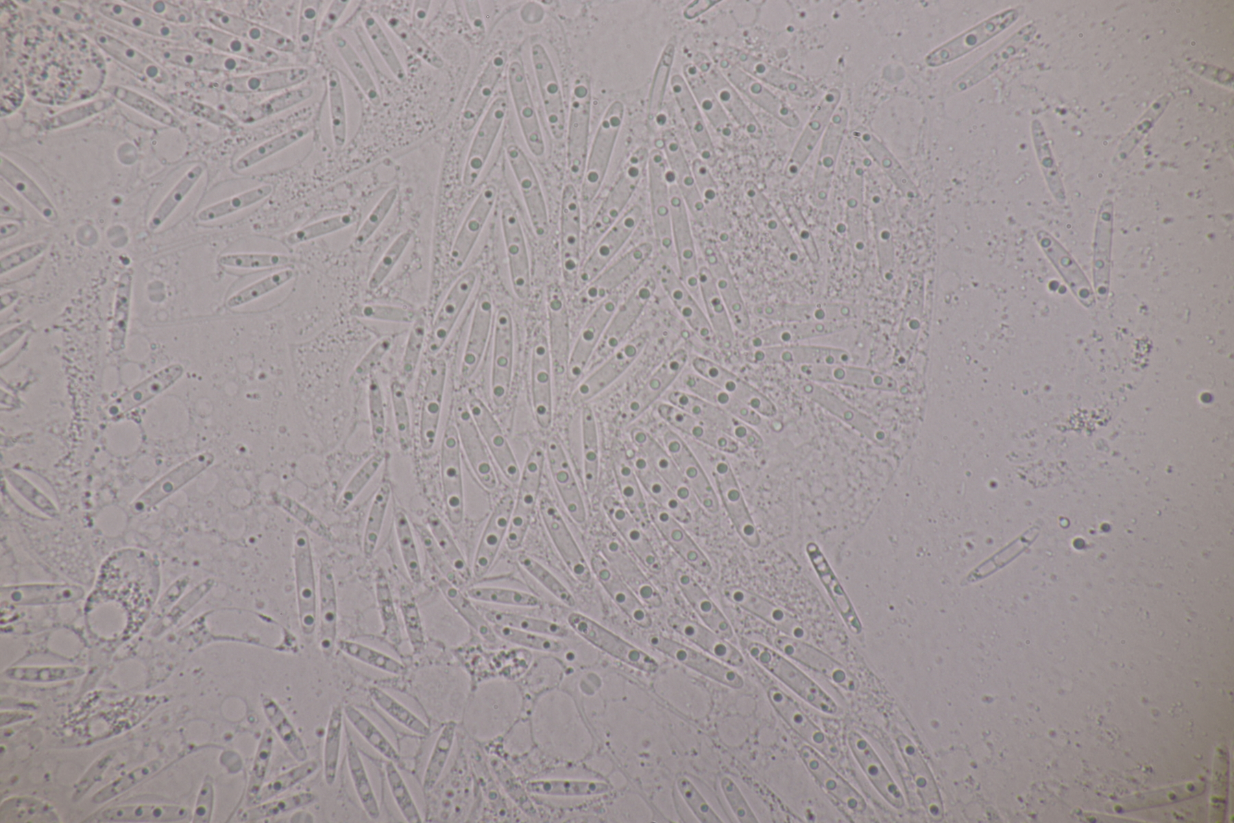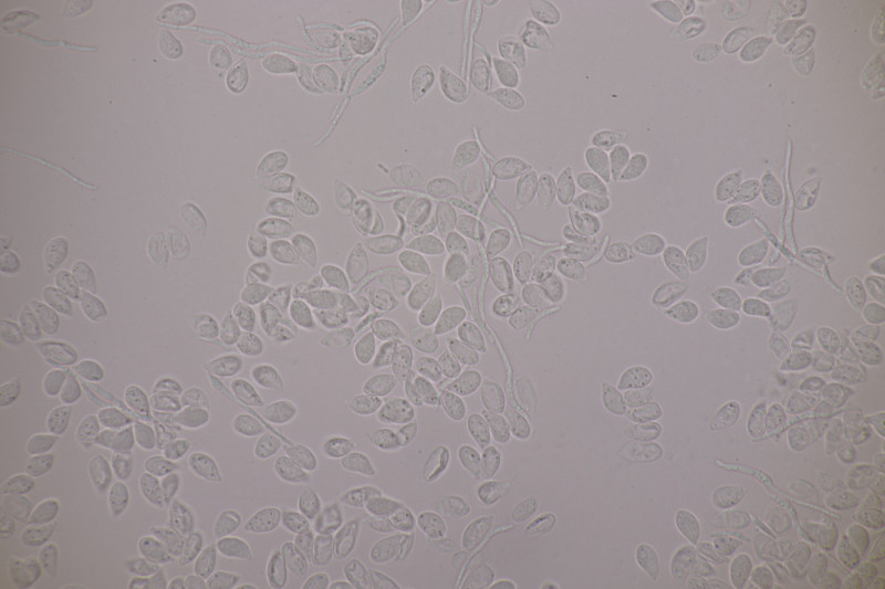 3. Bei den schwarzen Kügelchen handelt es sich um eine nicht näher betrachtete Anamorphe. Die weiße Masse scheint aber die Anamorphe zu den weißen Bechern zu sein. Diese haben ziemlich kleine, elliptische Sporen mit symmetrischen Tropfen, also Lachnellula resinaria var. resinaria