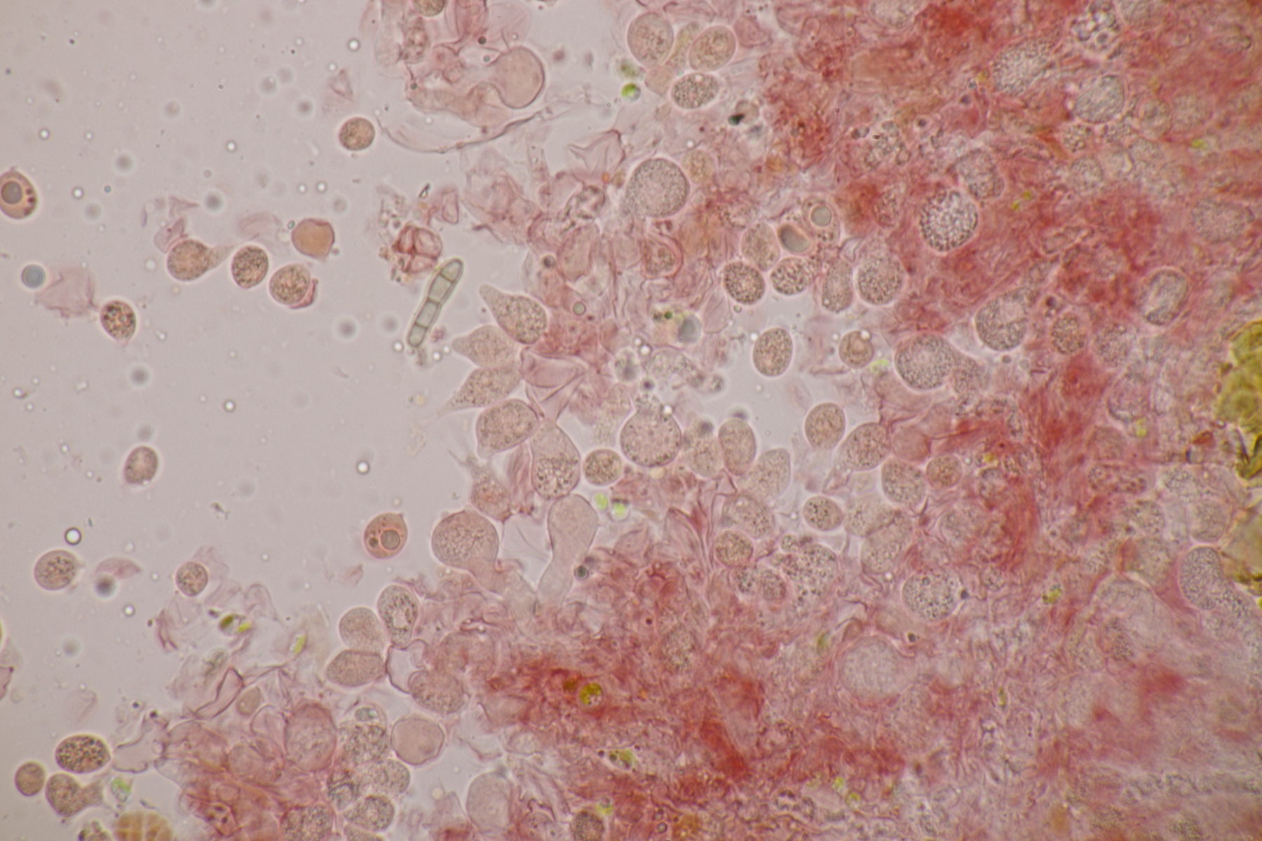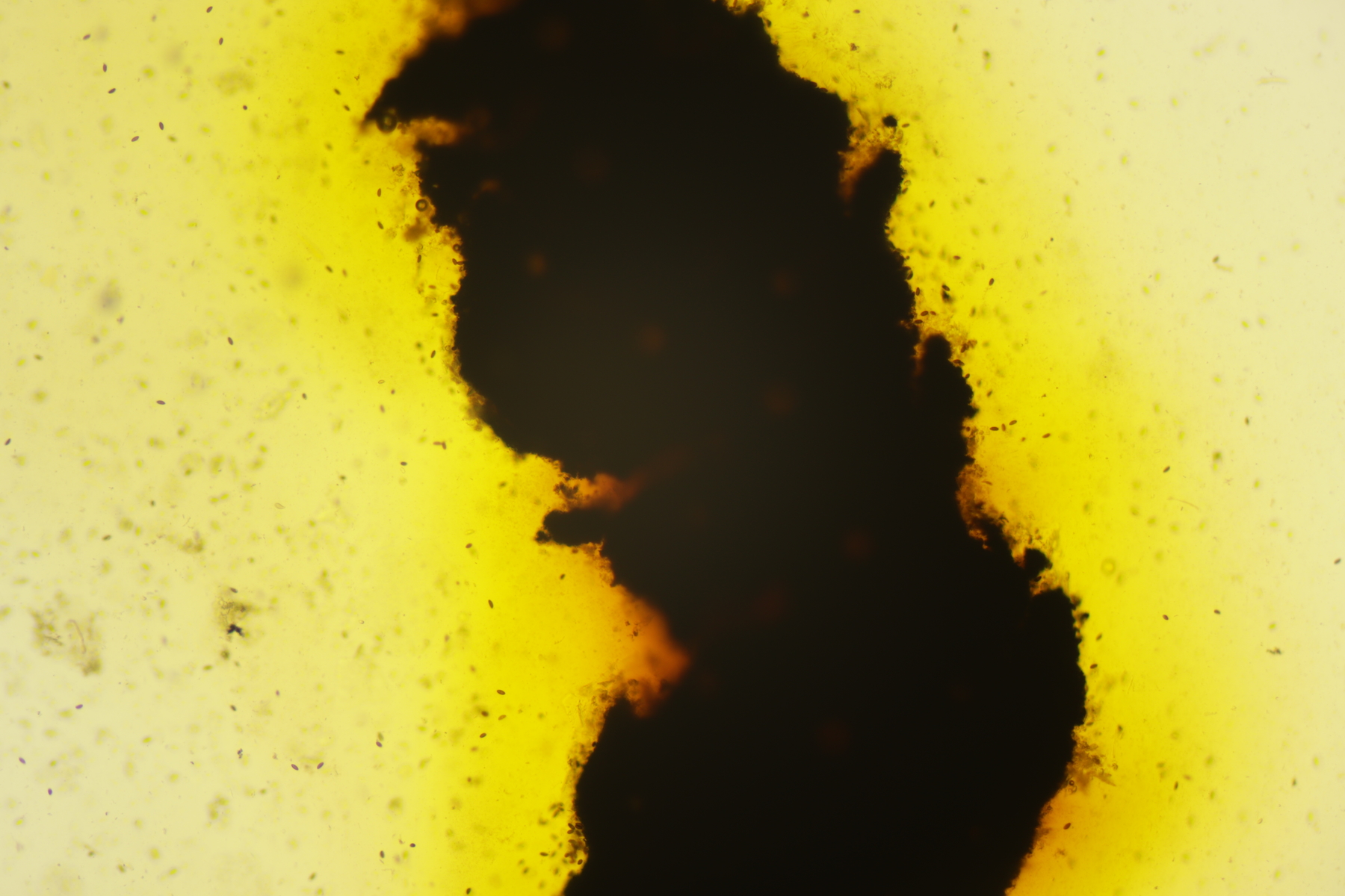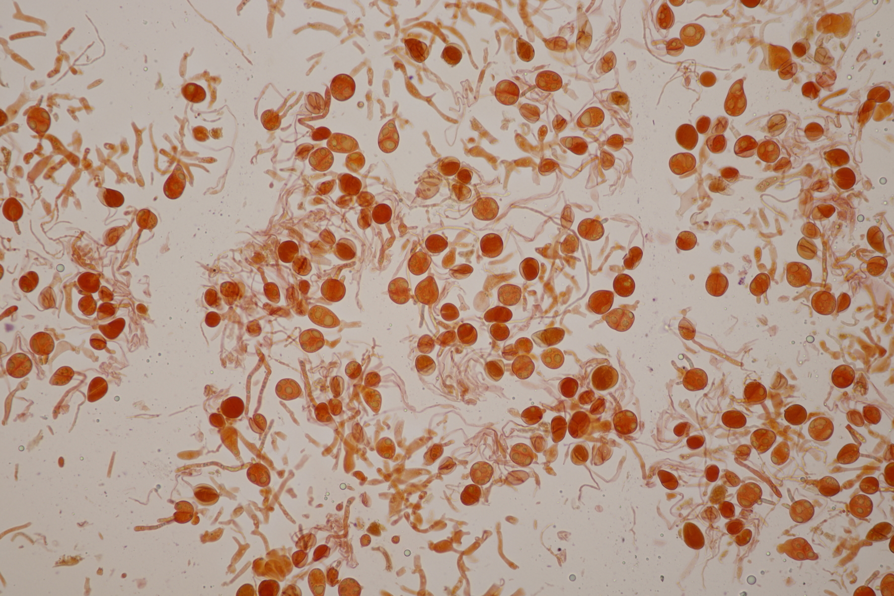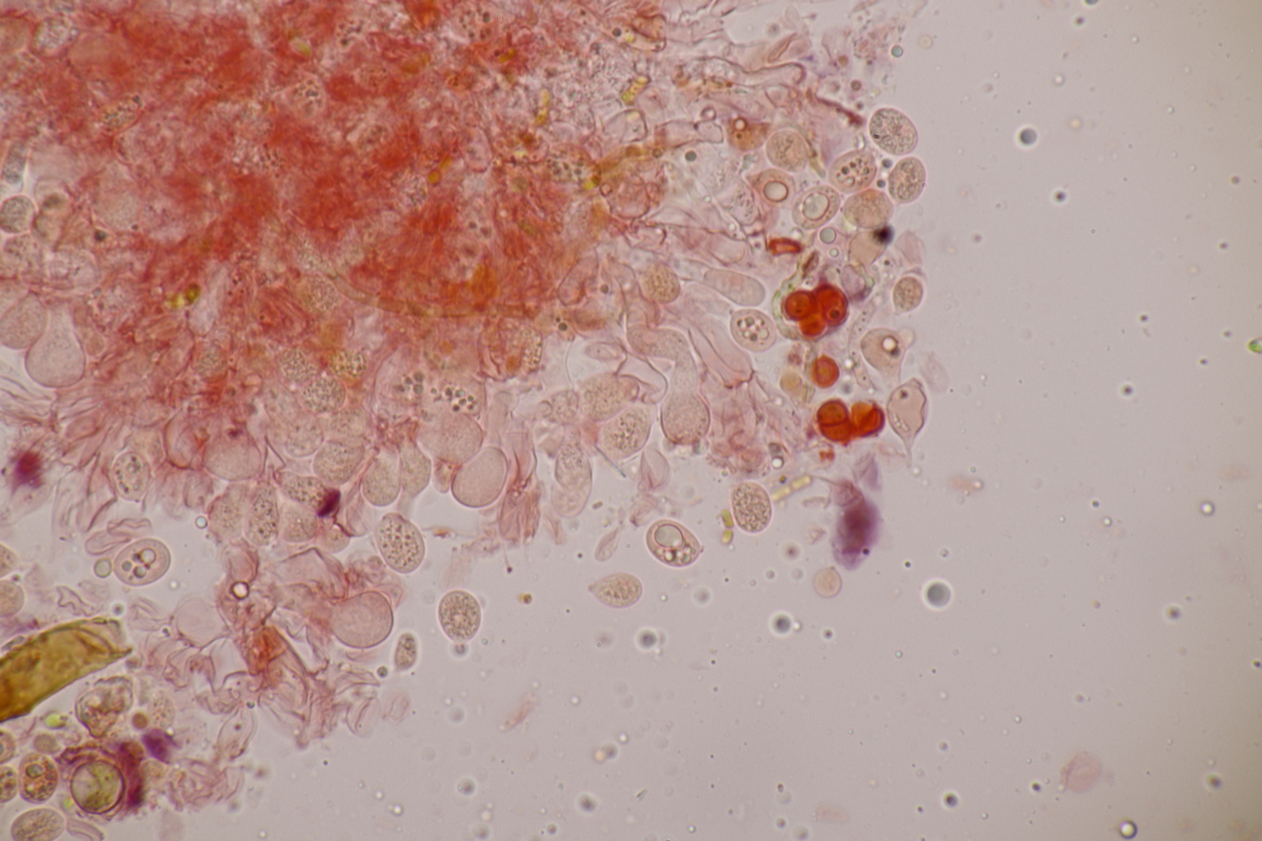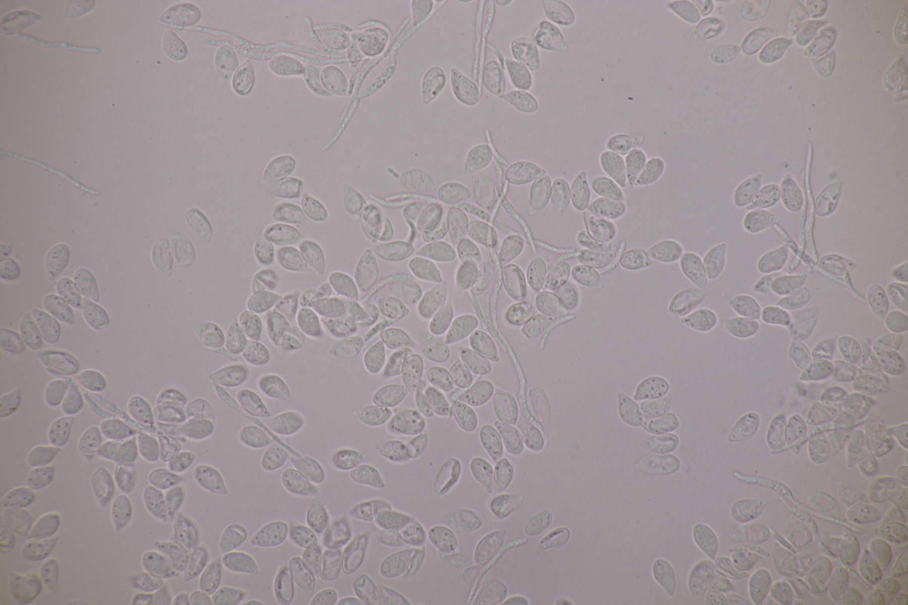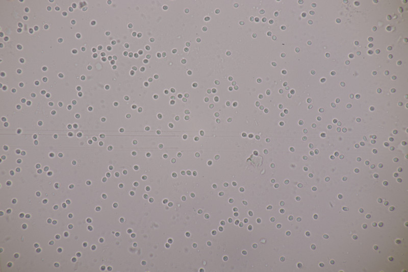3. Bei den schwarzen Kügelchen handelt es sich um eine nicht näher betrachtete Anamorphe. Die weiße Masse scheint aber die Anamorphe zu den weißen Bechern zu sein. Diese haben ziemlich kleine, elliptische Sporen mit symmetrischen Tropfen, also Lachnellula resinaria var. resinaria
