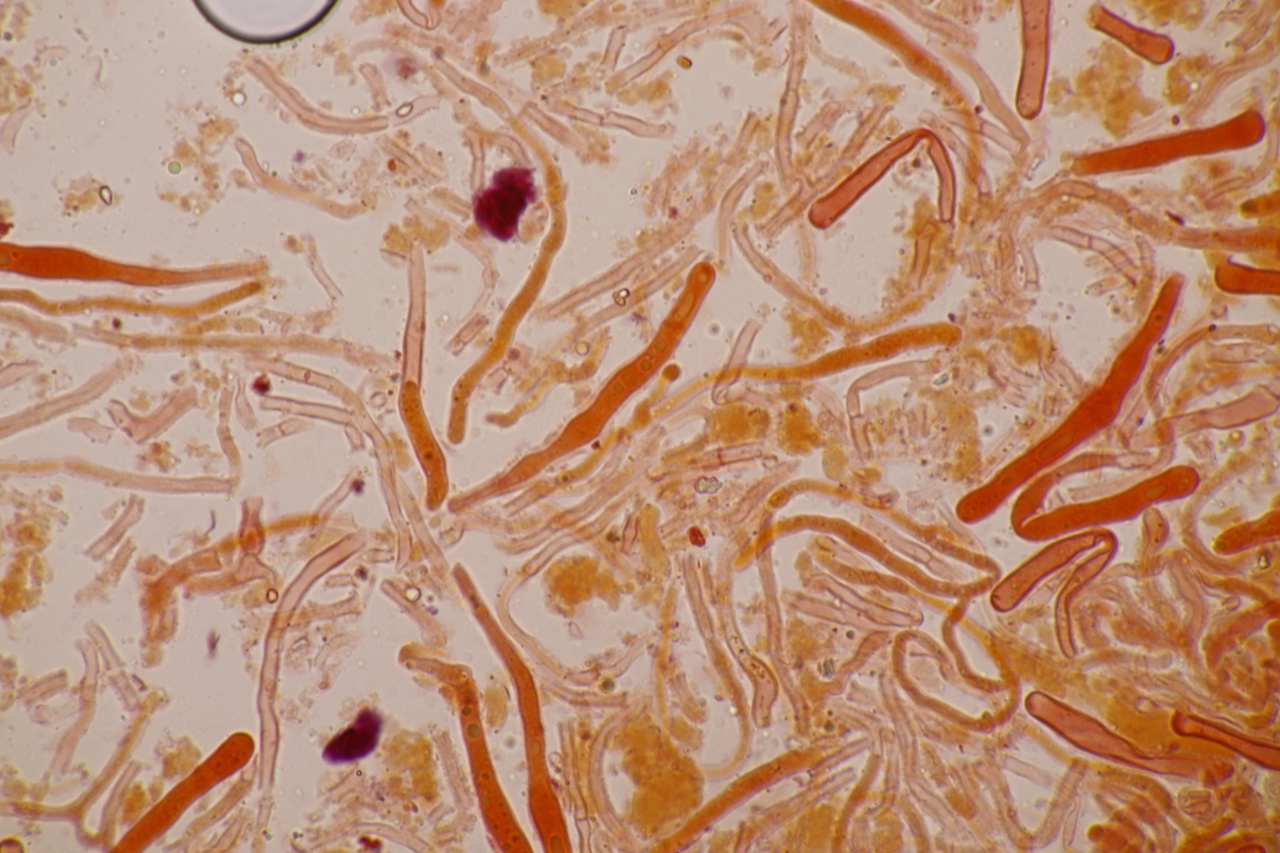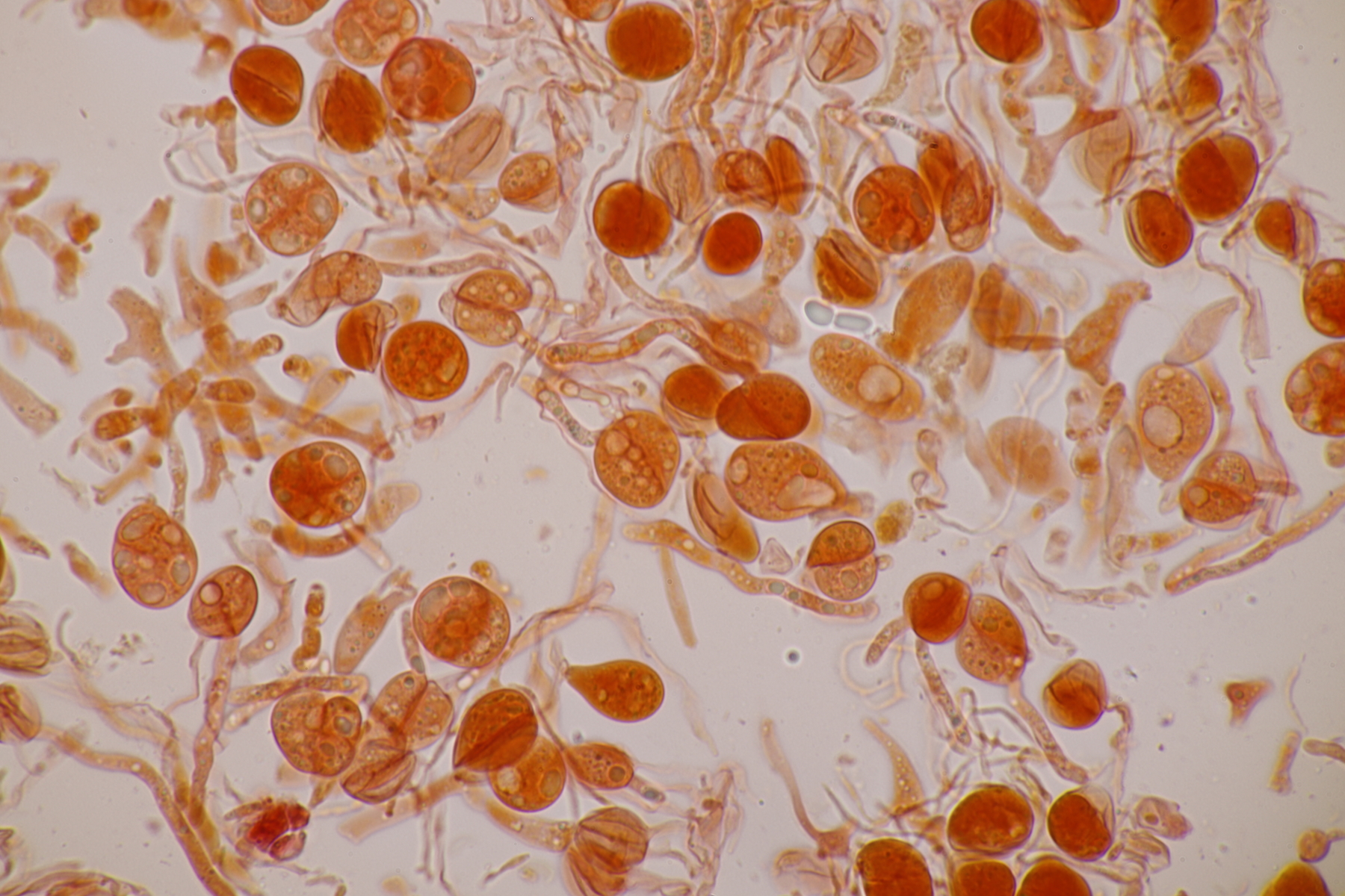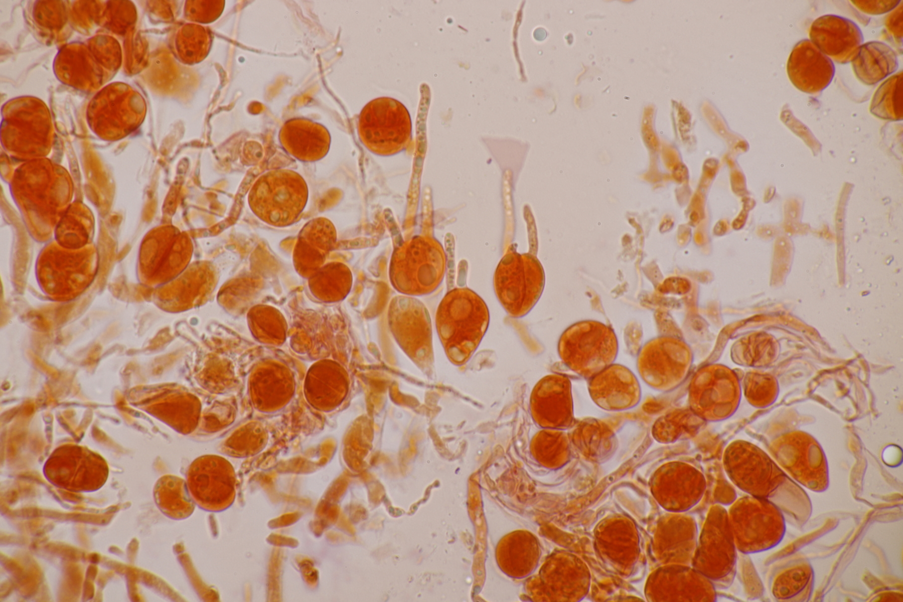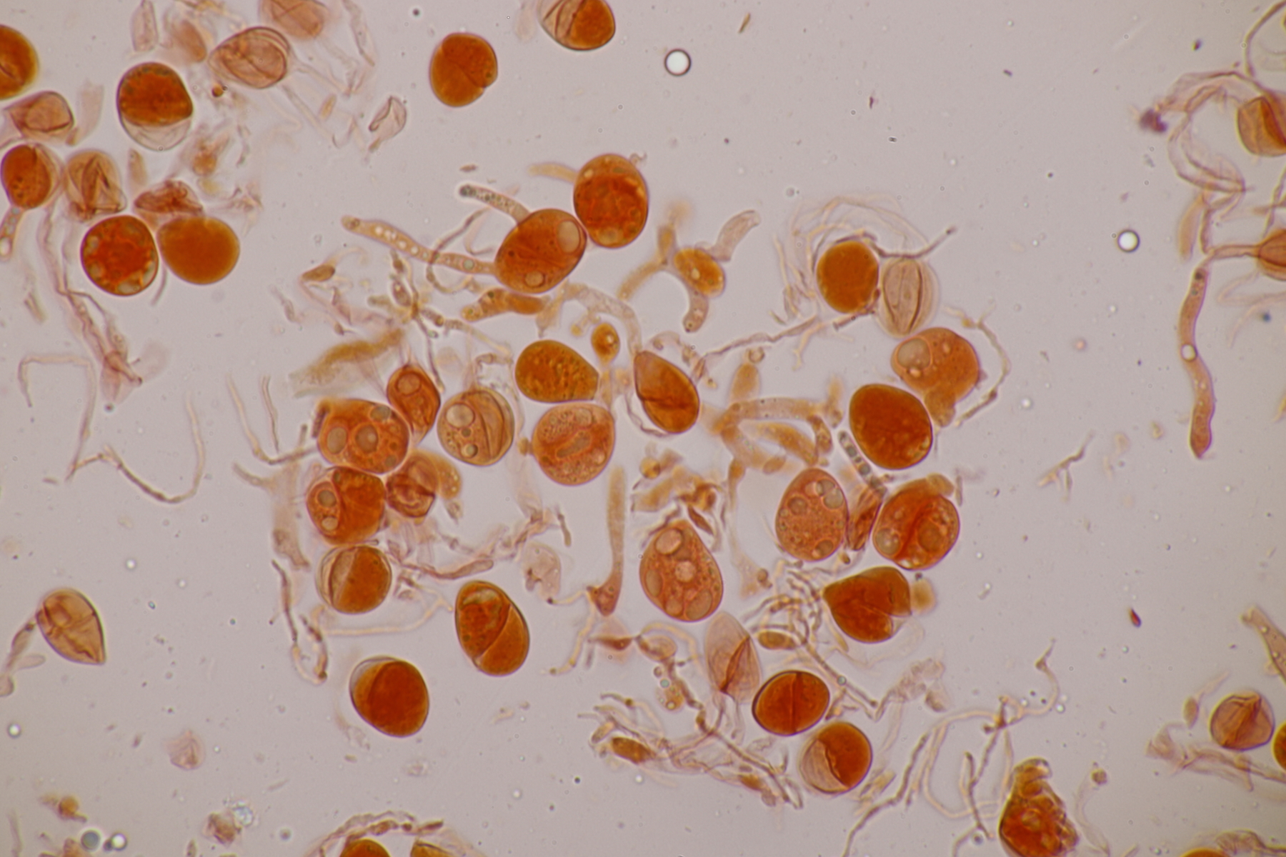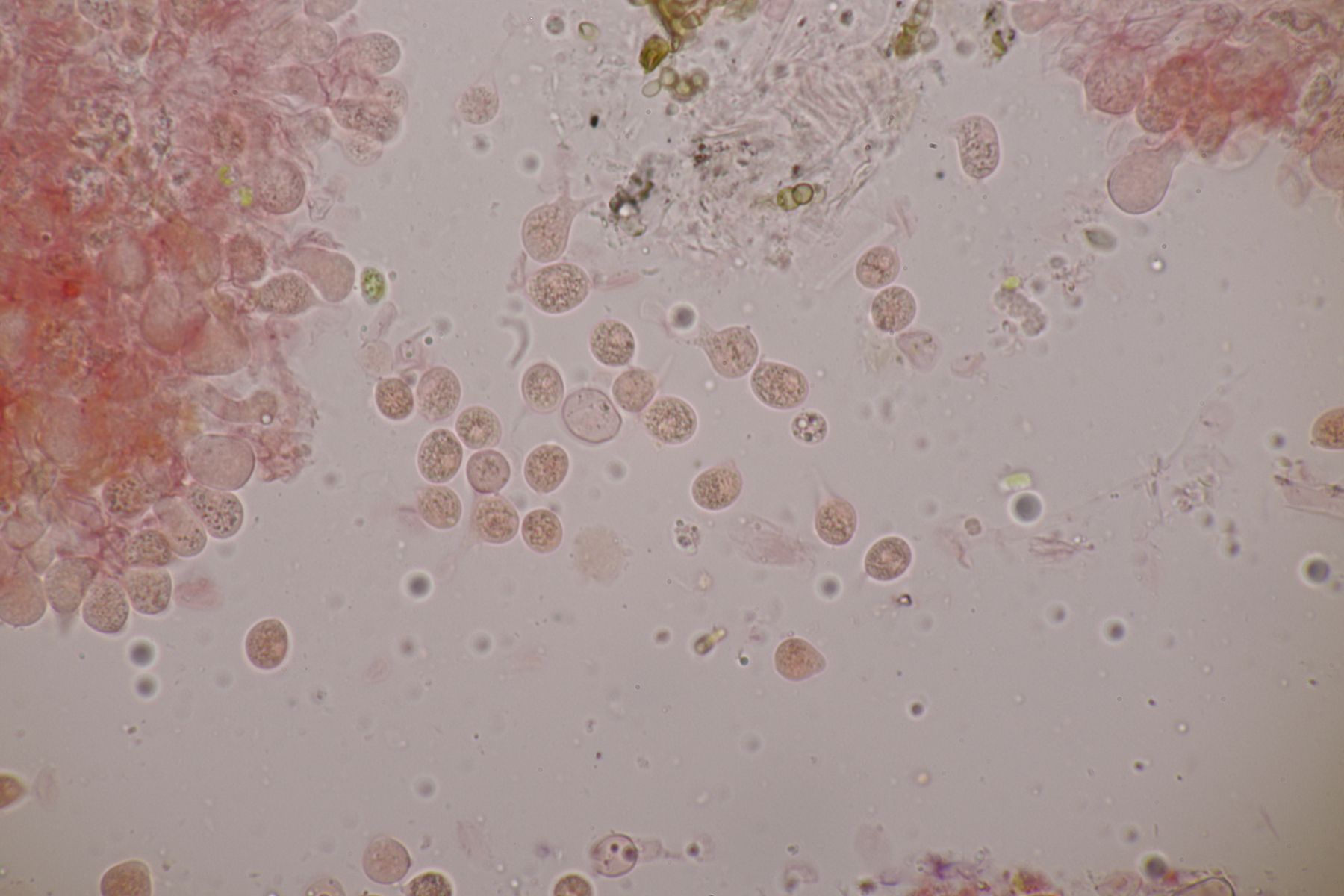3. Bei den schwarzen Kügelchen handelt es sich um eine nicht näher betrachtete Anamorphe. Die weiße Masse scheint aber die Anamorphe zu den weißen Bechern zu sein. Diese haben ziemlich kleine, elliptische Sporen mit symmetrischen Tropfen, also Lachnellula resinaria var. resinaria