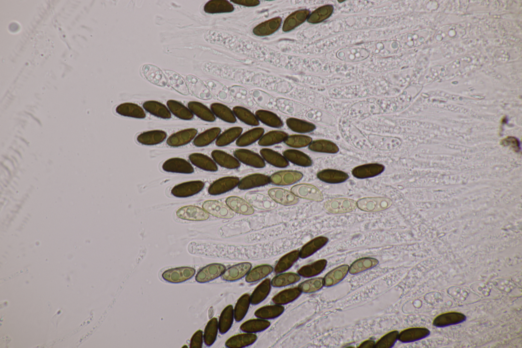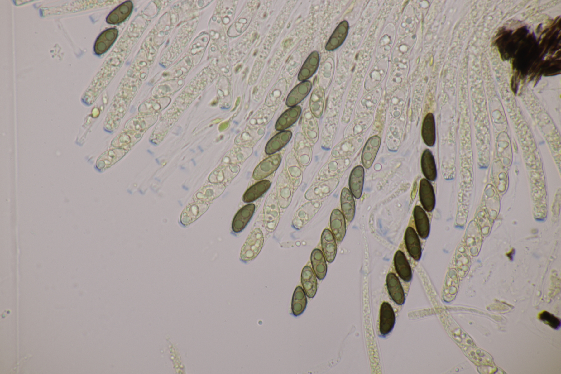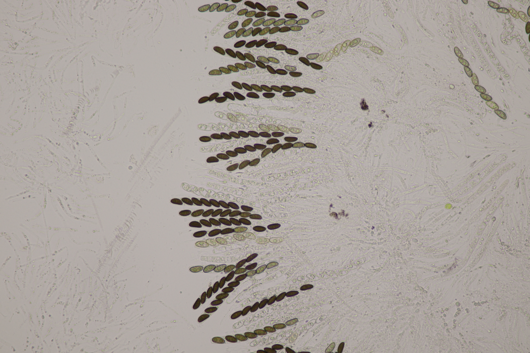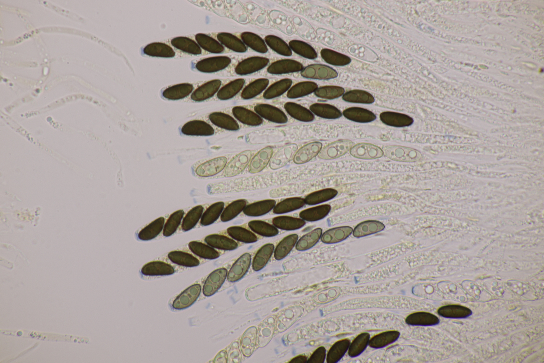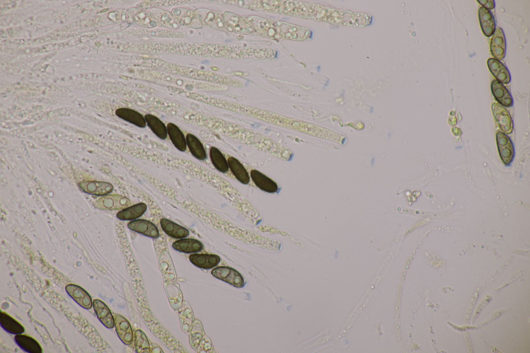9. Ditopella ditopa ex Alnus glutinosa. Mit den 16-sporigen Asci leicht zu bestimmen.