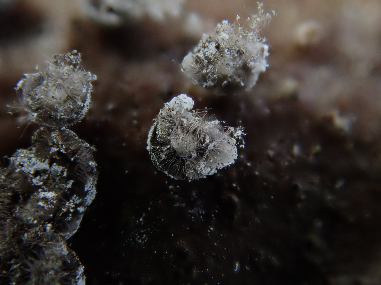 Man sieht auf Deinen Fotos, dass die Fruchtkörper gestielt sind, d.h. sie sitzen nicht am Substrat auf. Leider sieht man die Stielfarbe nicht. Ich vermute, dass er weißlich ist. Auch haben die Fruchtkörper eine deutliche Columella, das ist der weiße kalkhaltige Gnubbel in Innern der Fruchtkörper.