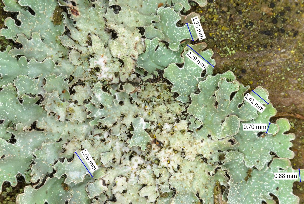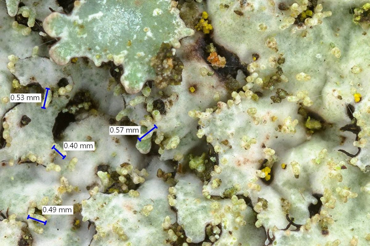 Einige Isidien, die auf die Thallusmitte konzentriert sind, habe ich nach dem Foto ausgemessenen. Die meisten lassen sich wegen der Ausrichtung nach oben so nicht messen, sie sind auch kürzer: