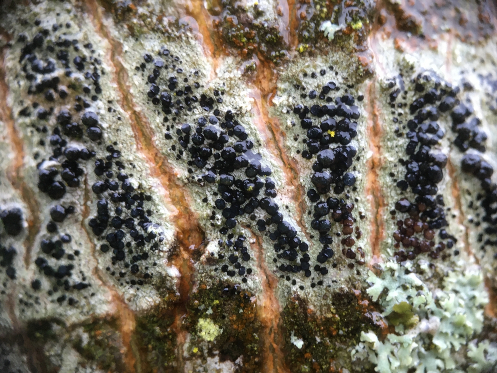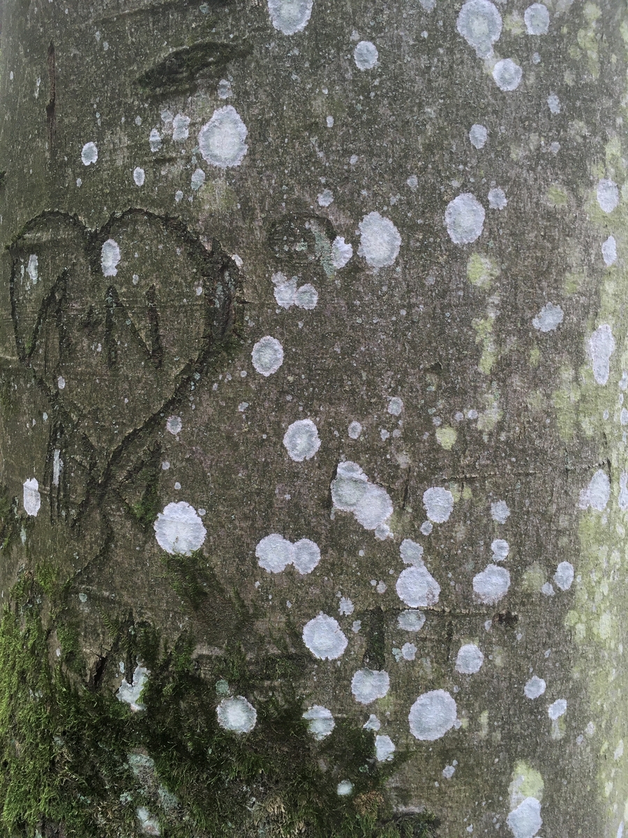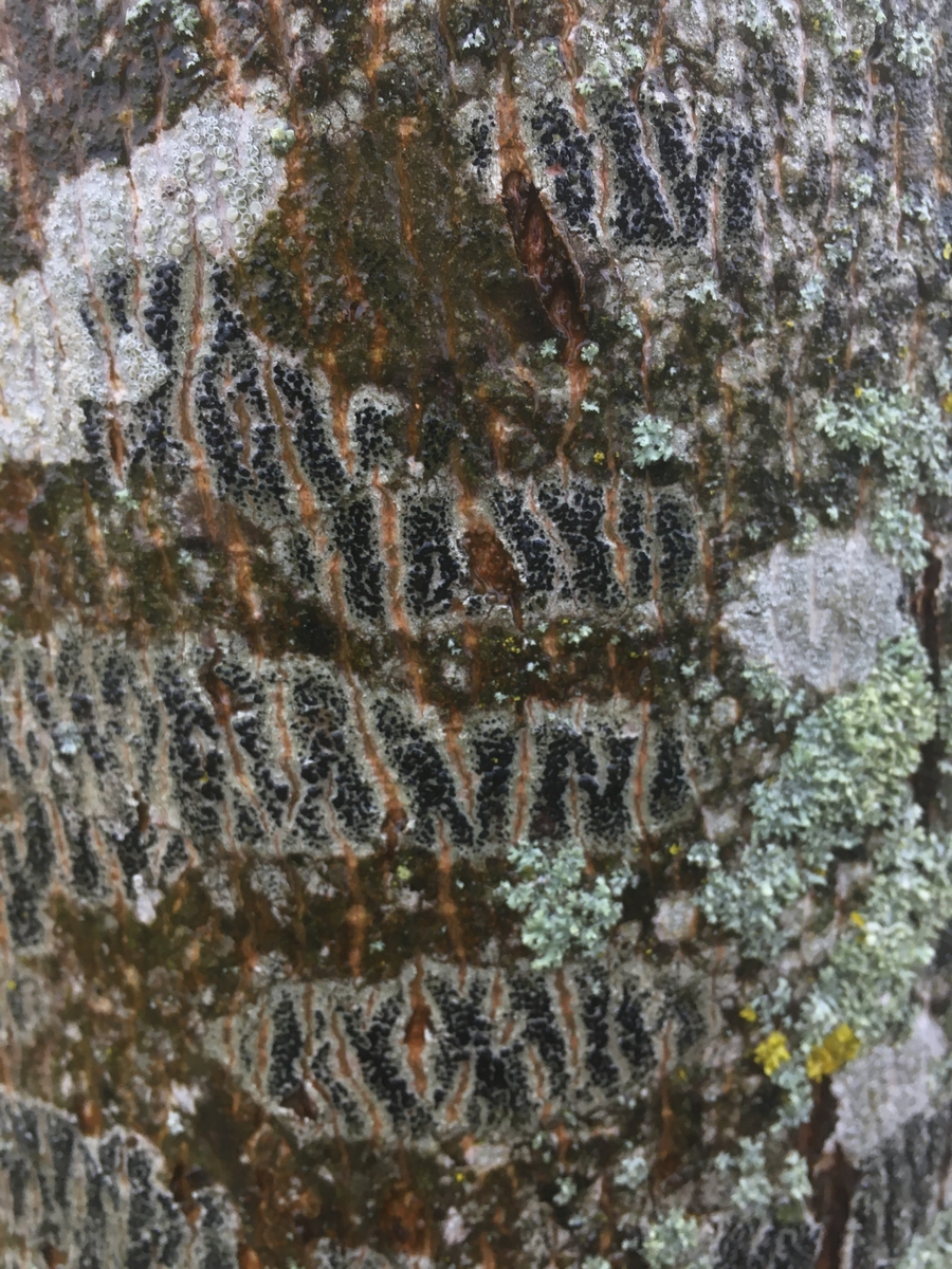 1) Eine Schwarznapfflechte, vielleicht Lecidella elaeochroma auf noch jungem Ahorn, man sieht schön wie sie durch die Dickenzunahme des Stammes gespalten wird: