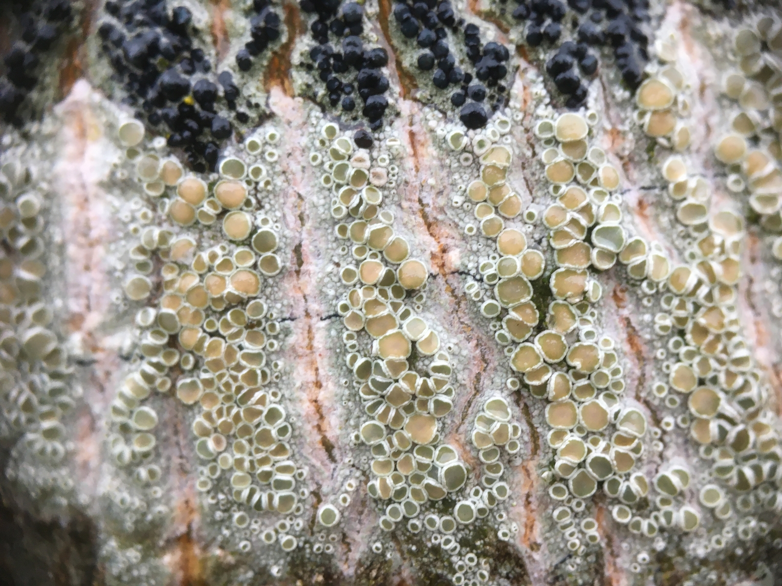 2) Darunter vermutlich die helle Kuchenflechte (Lecanora chlarotera)- vergrößert nicht übel oder? hat was futuristisches finde ich...