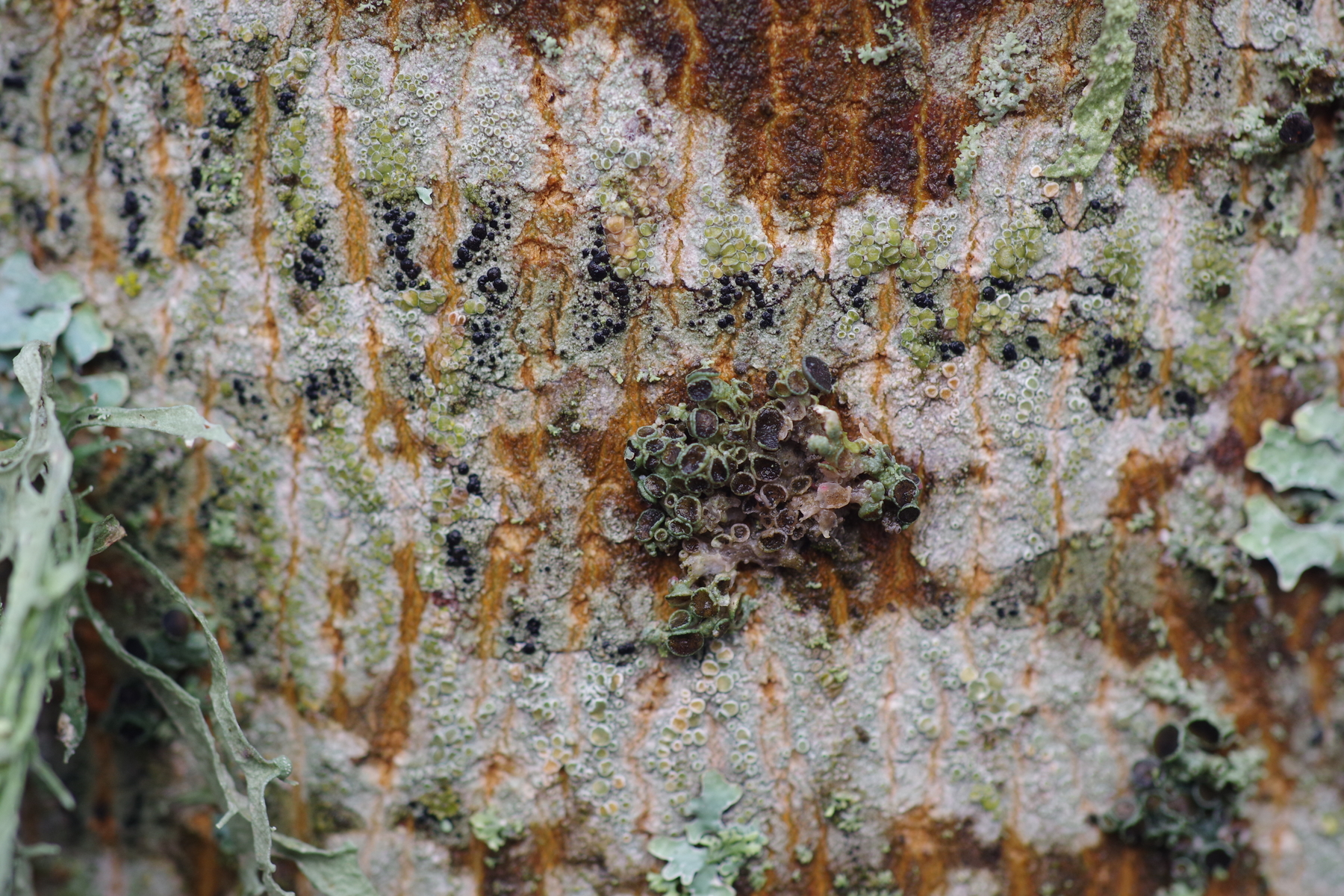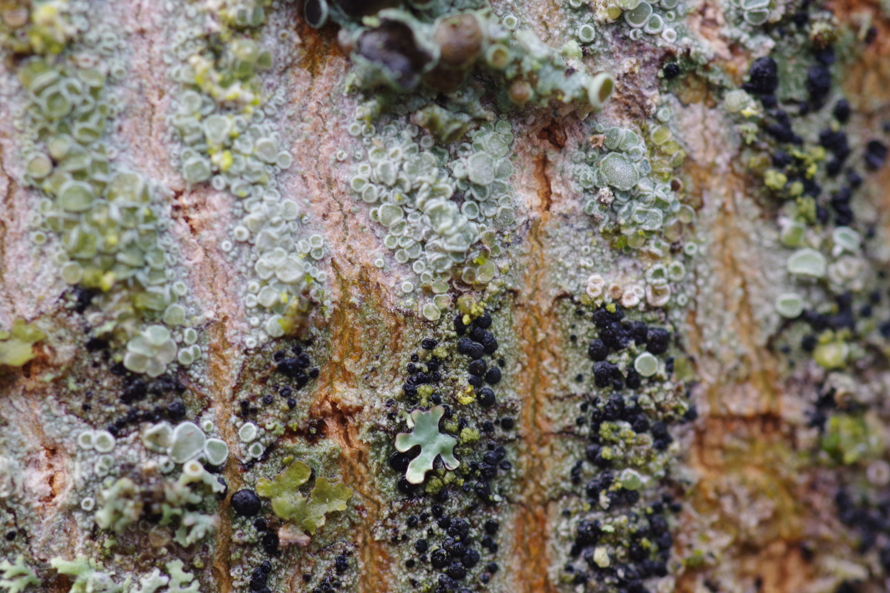 a) zunächst Lecidella (cf.) elaeochroma mit Lecanora sp. (inpsiriert von Martins Bild ähnlicher Kostellation)