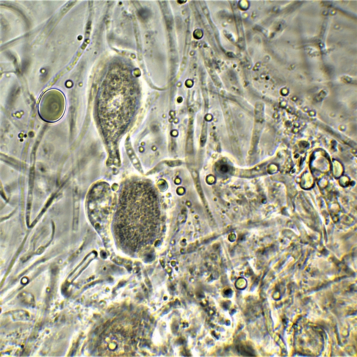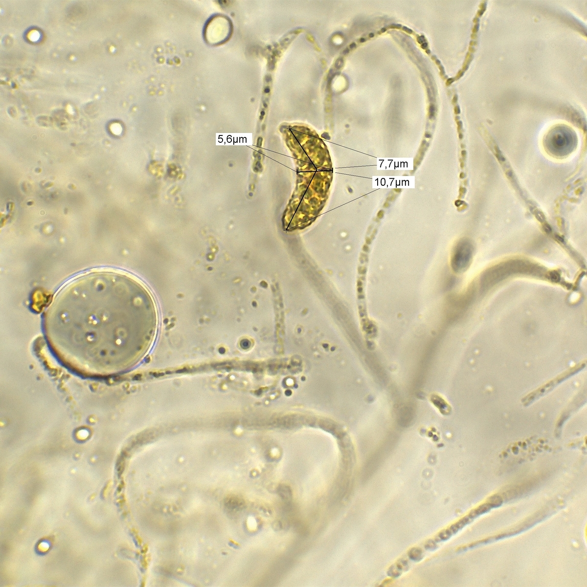Sporen allantoid/würstchenförmig mit Appendix, inamyloid und Körnchen artigen Inhalt, sehr groß bis etwas über 18 µm in der Länge