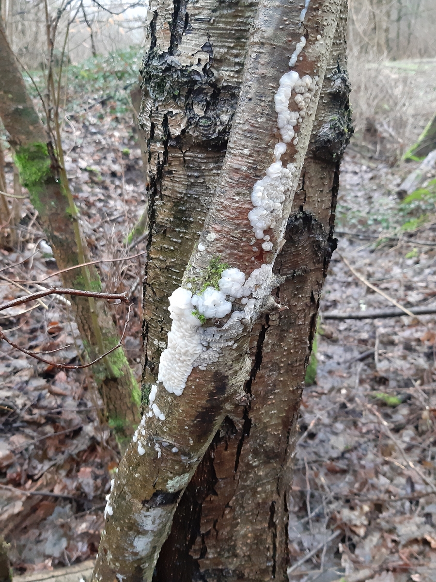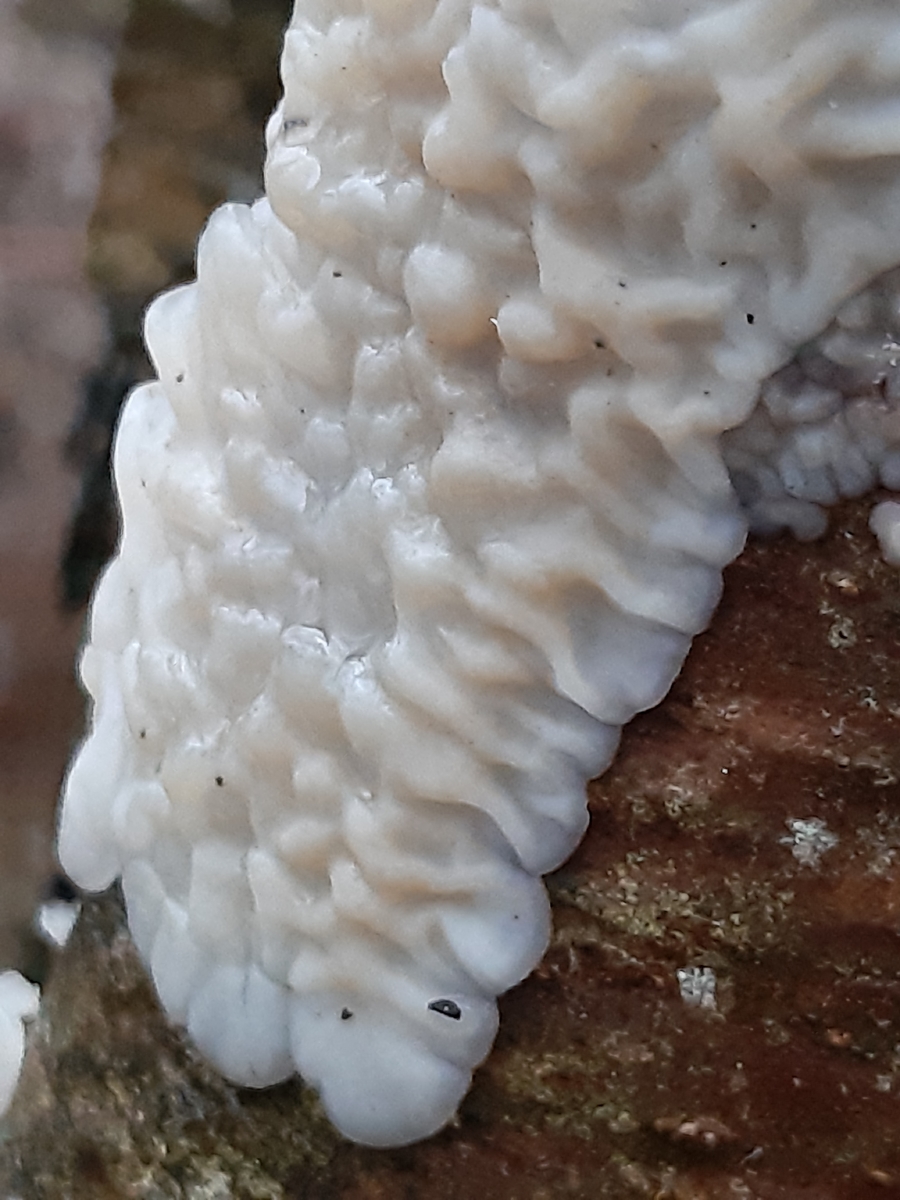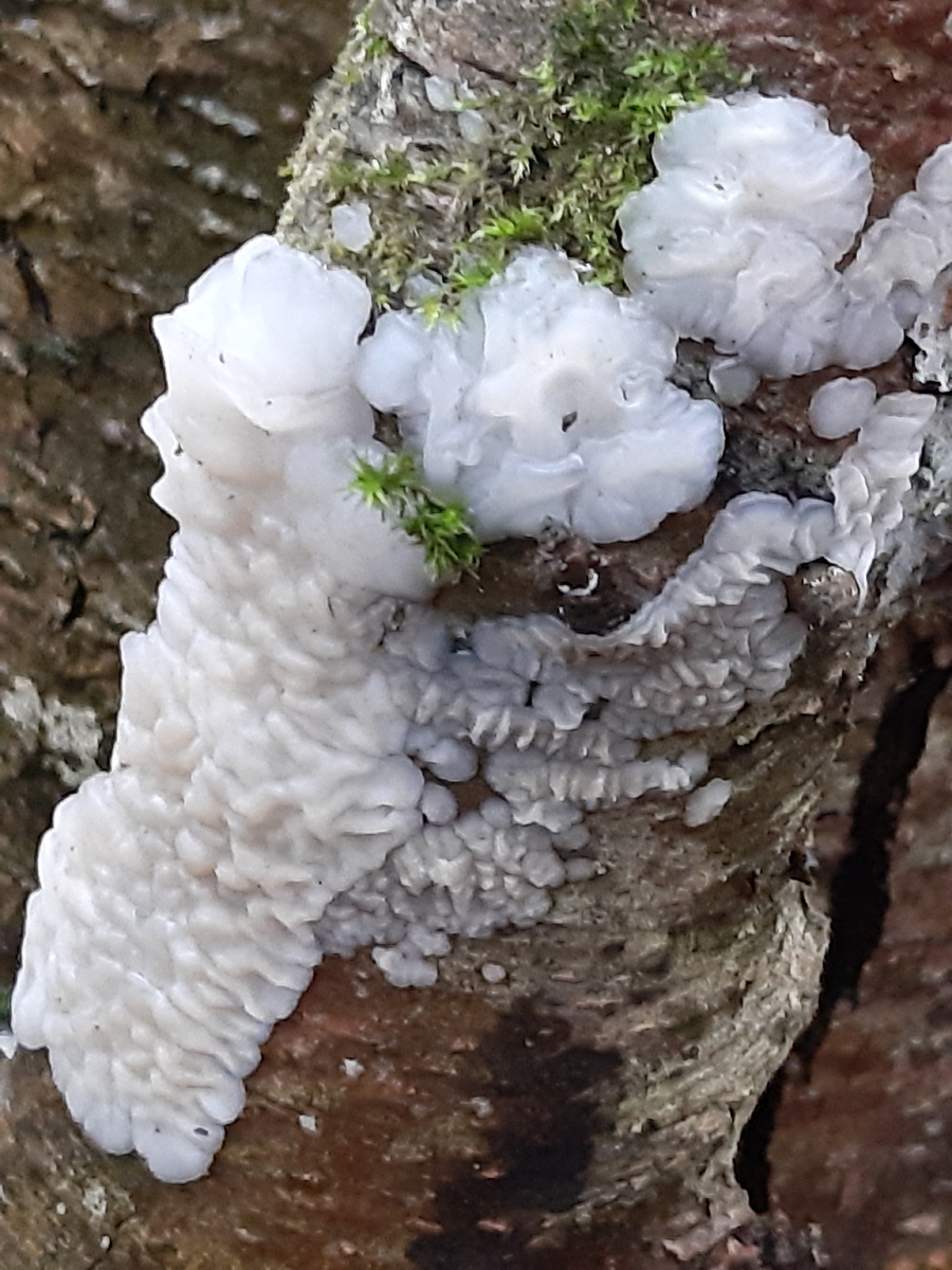 diese Art hatte ich schon letztes Jahr an einem aufrechten Laubholzast (Substrat Erle Auenwald?) beobachtet, wußte es geht in Richtung Gallertpilze, konnte damals noch nicht genau zuordnen. Dieses Jahr kamen wieder neue Fruchtkörper am selben Ast, in verschiedengestaltiger Form. Einzelne gewundene Knubbel die in Reihe oder als ein zusammenfließendes Luftkissen am Holz, sich deutlich abhebend. Der gallertartige, weißliche Pilze ließ sich gut ablösen. Im Schnittbild sieht man gut das geleeartige Fruchtfleisch. Mikroskopisch fällt es mir noch schwer den für mich etwas wirren Aufbau zu verstehen, für Hilfe wäre ich da sehr Dankbar!