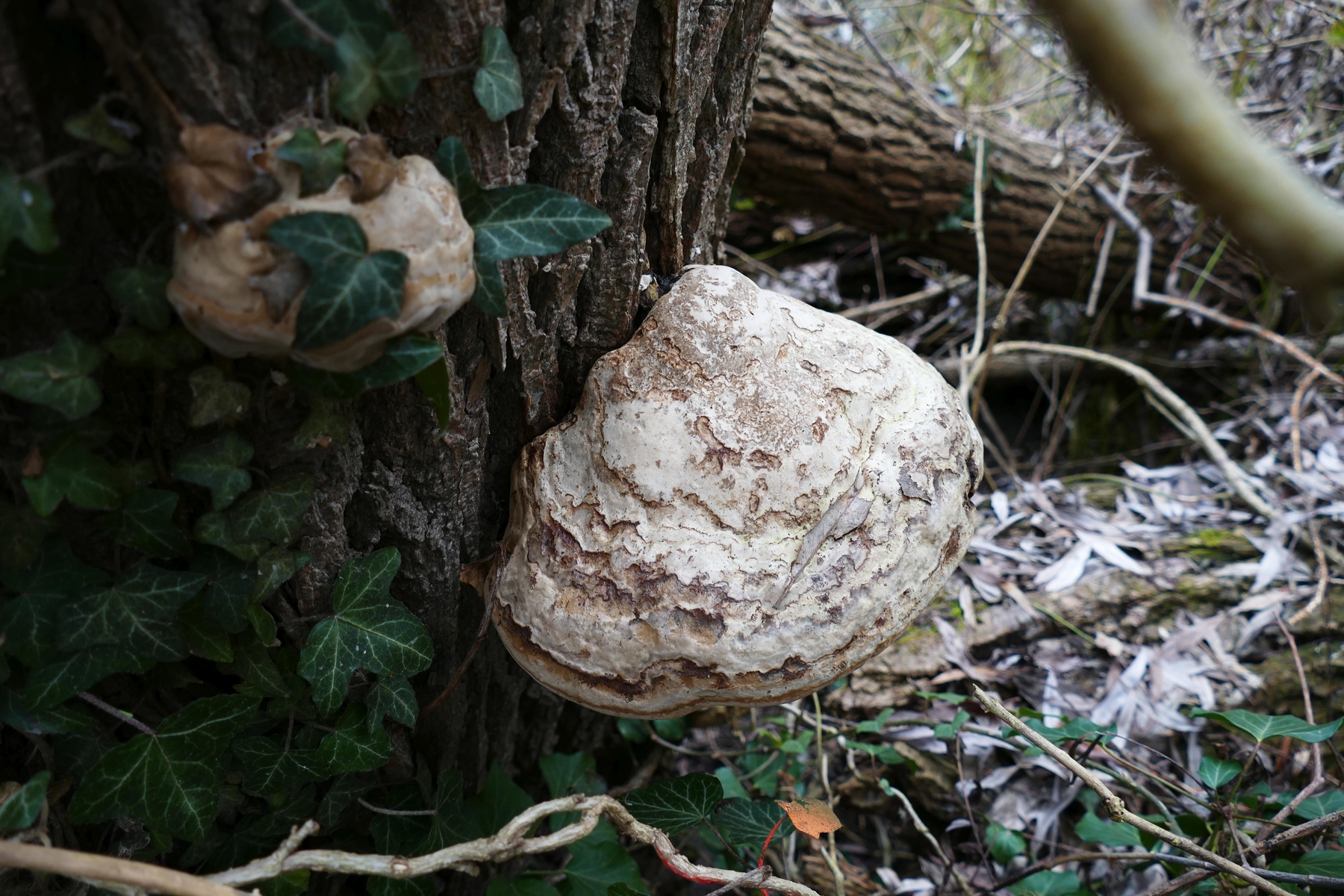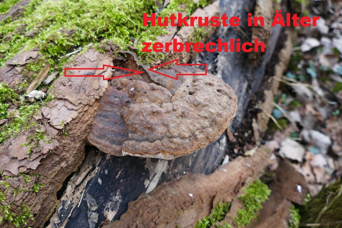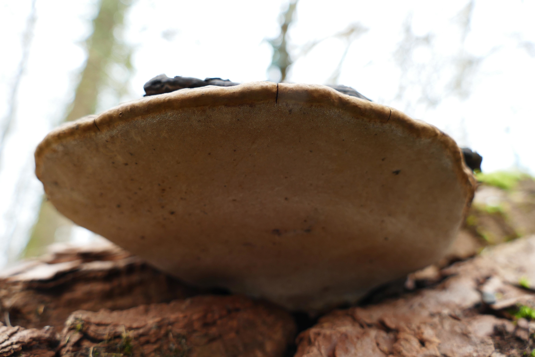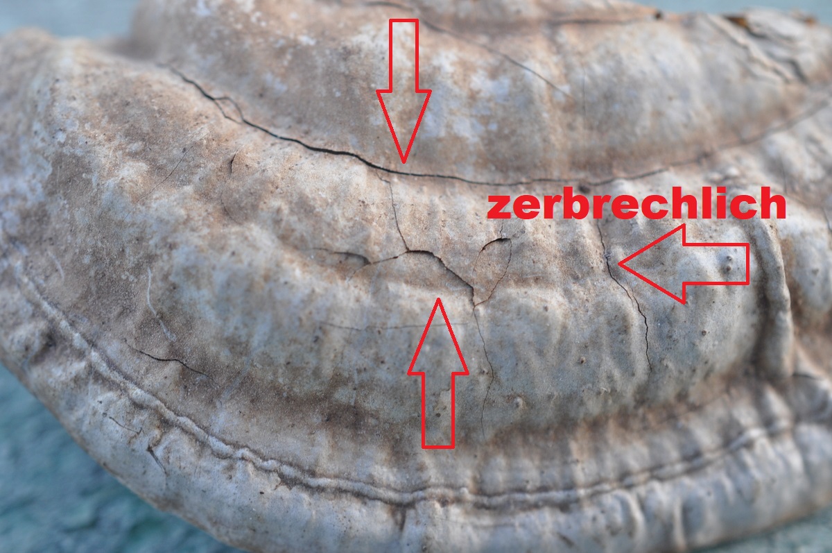 An der ersten umgekippten, noch fast vollberindeten Pappel am Wegrand wuchsen etliche große Porlinge, offenbar mehrjährig und braunfleischig, breit anwachsend. Die Hutoberseite ist schmutzig graubraun.