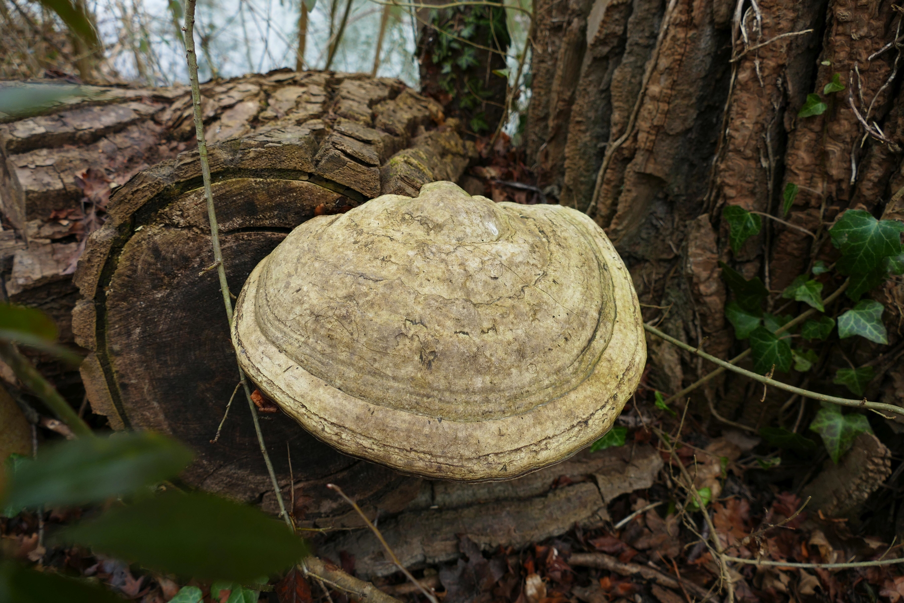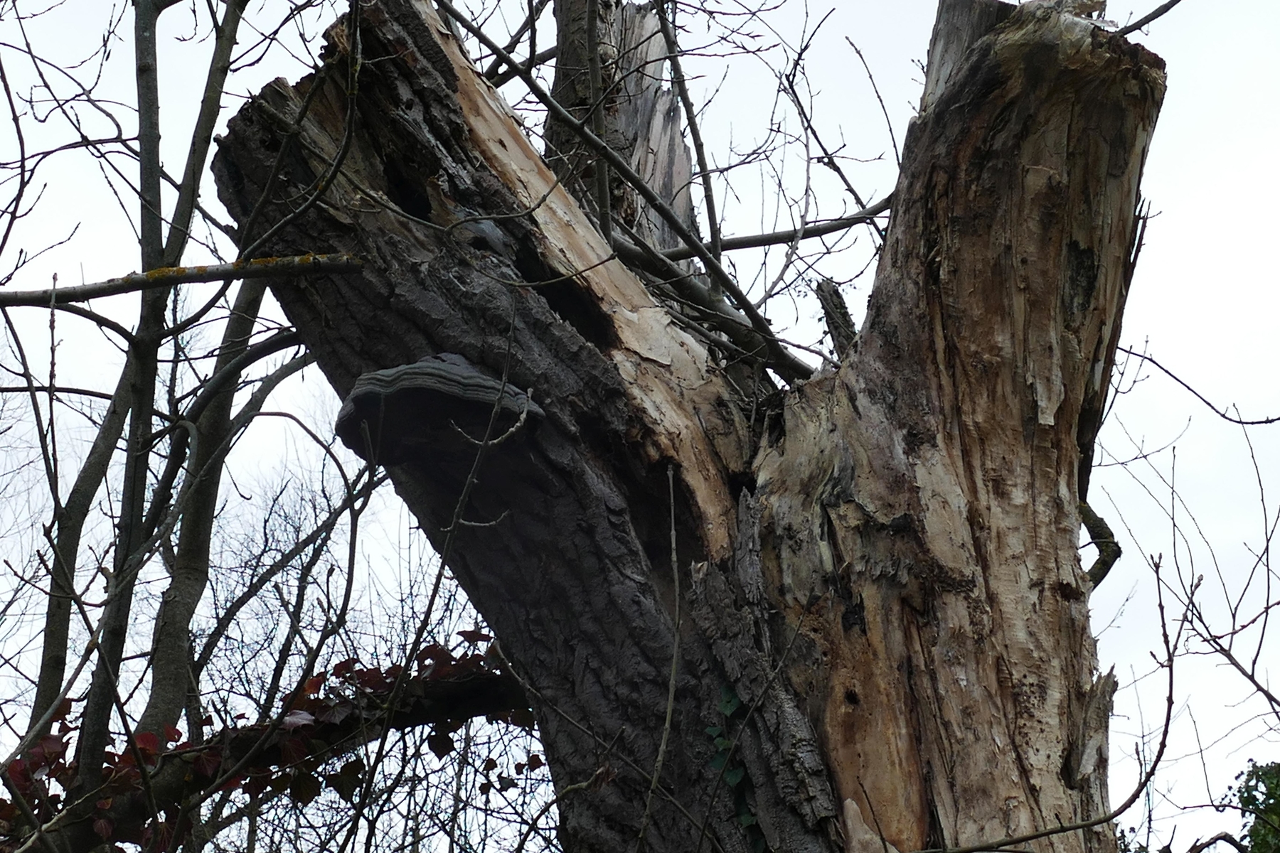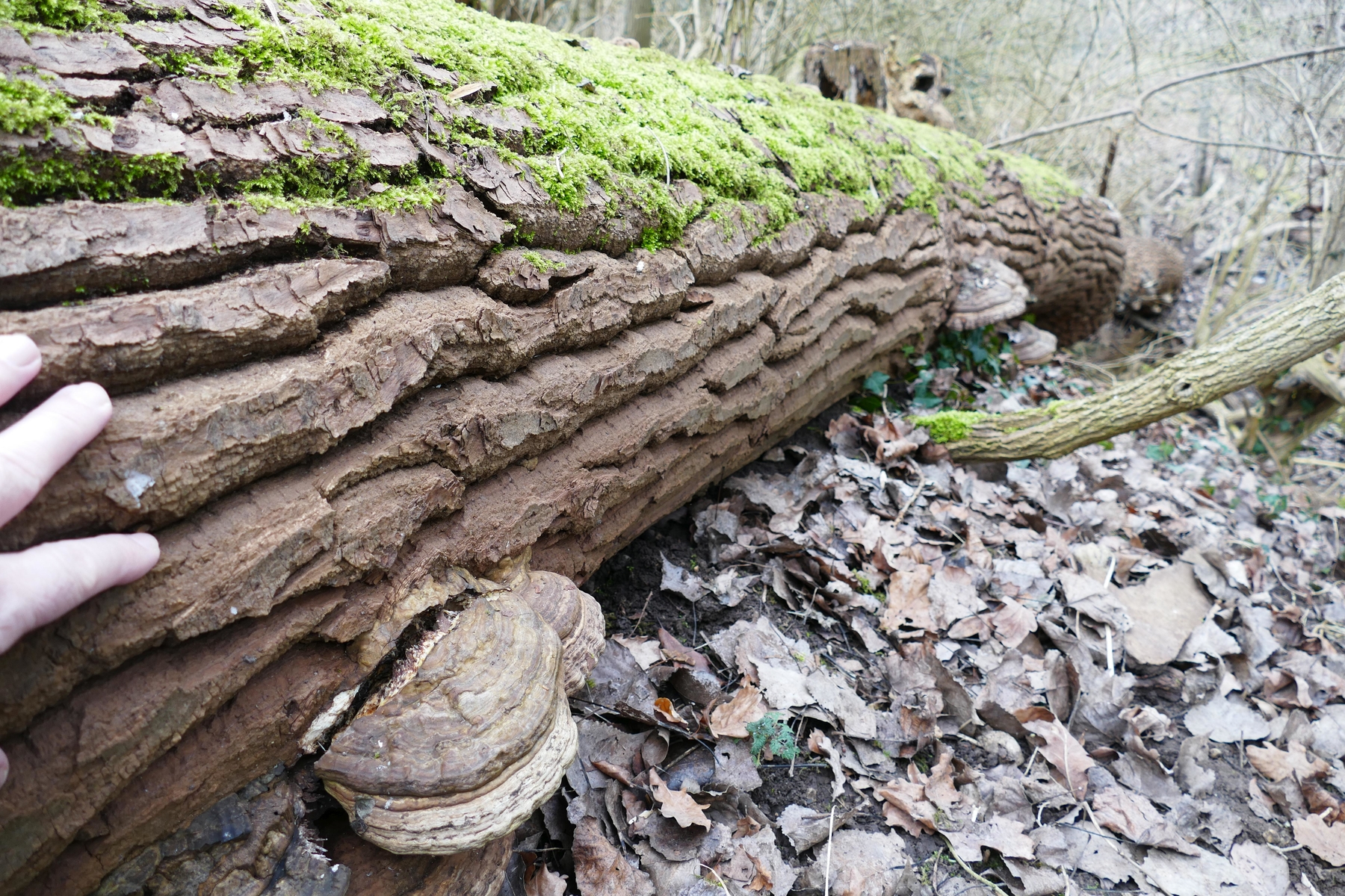 An der ersten umgekippten, noch fast vollberindeten Pappel am Wegrand wuchsen etliche große Porlinge, offenbar mehrjährig und braunfleischig, breit anwachsend. Die Hutoberseite ist schmutzig graubraun.