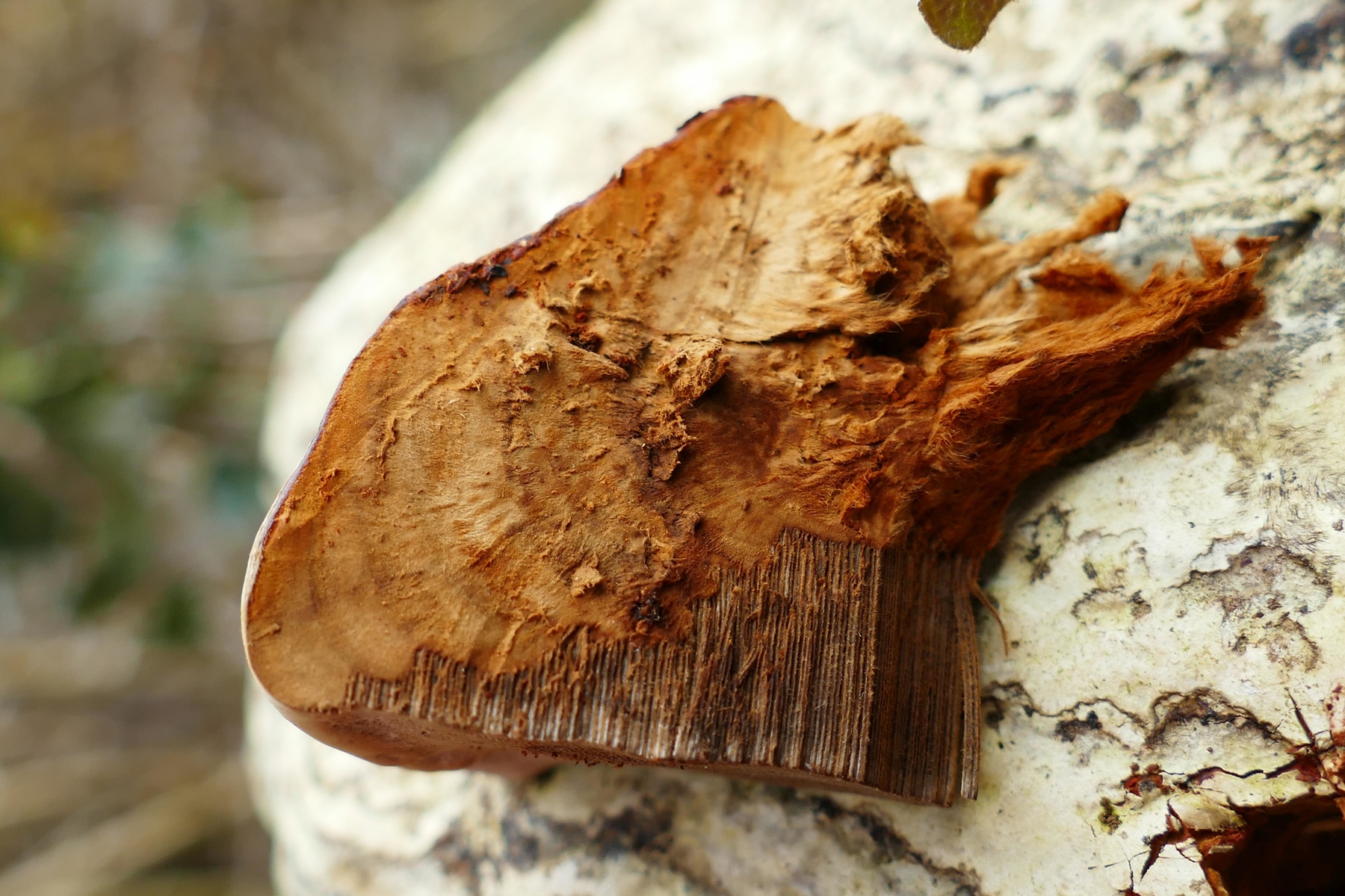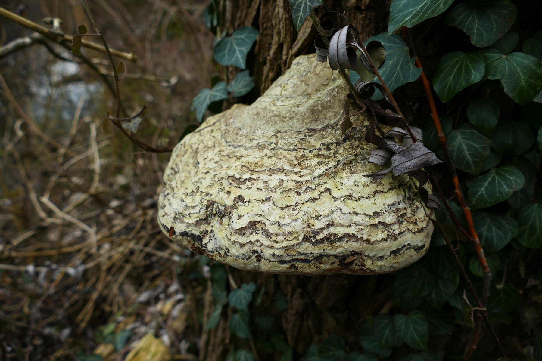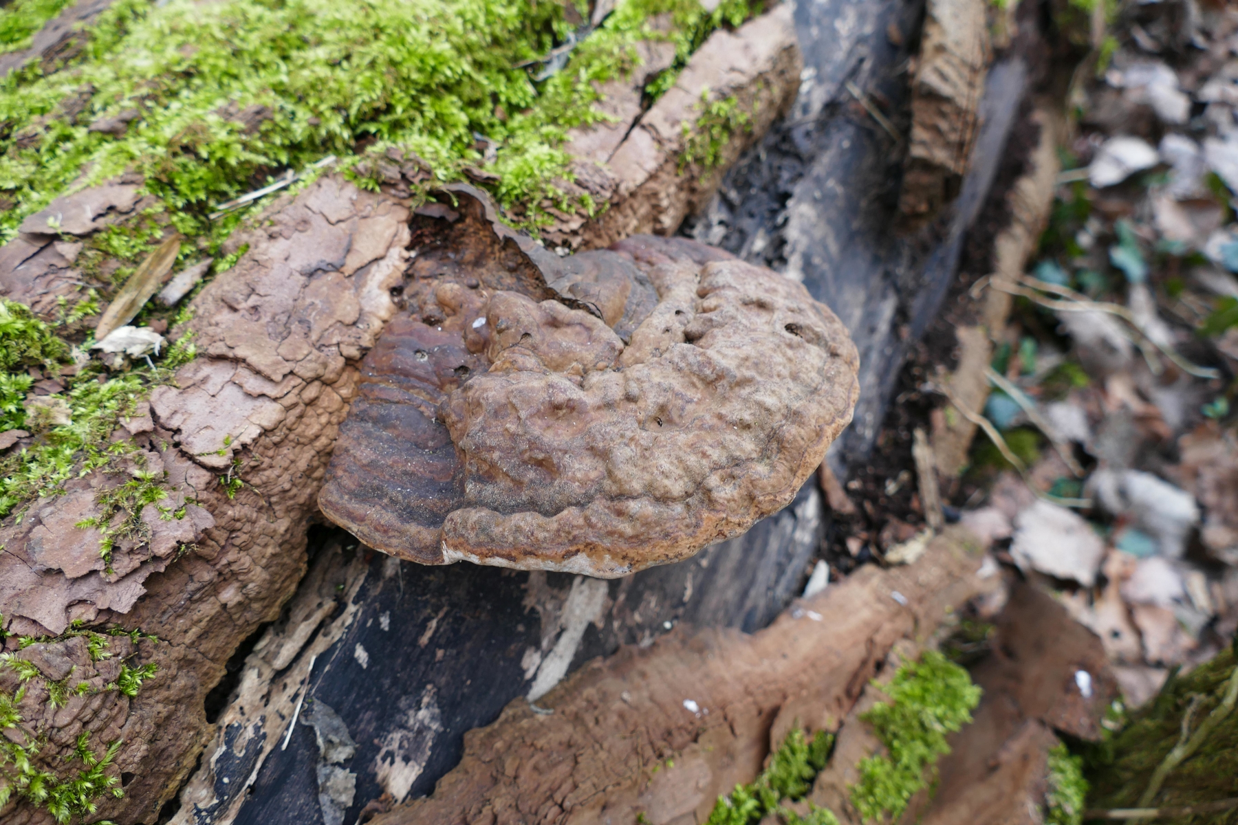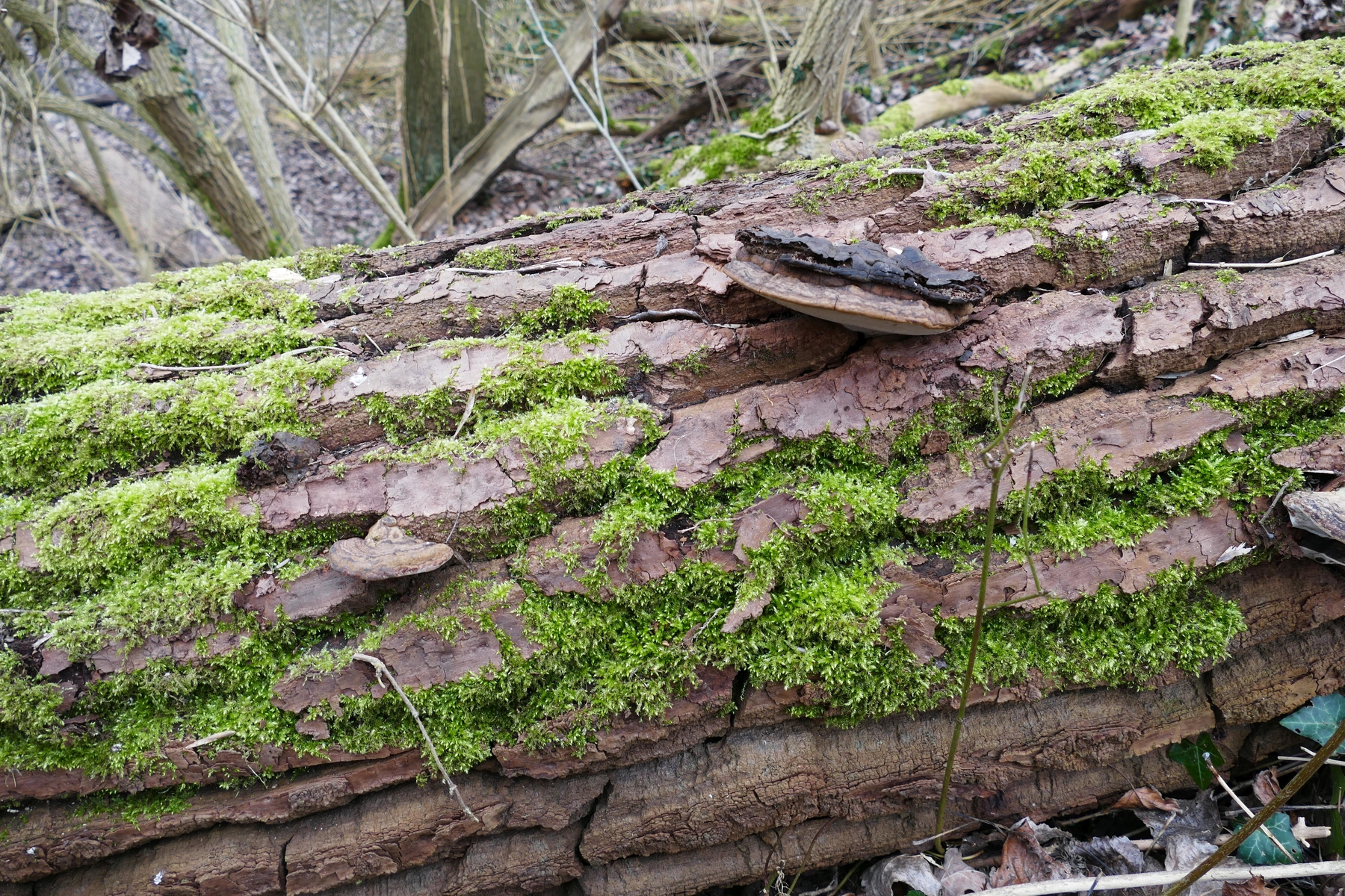 An der ersten umgekippten, noch fast vollberindeten Pappel am Wegrand wuchsen etliche große Porlinge, offenbar mehrjährig und braunfleischig, breit anwachsend. Die Hutoberseite ist schmutzig graubraun.