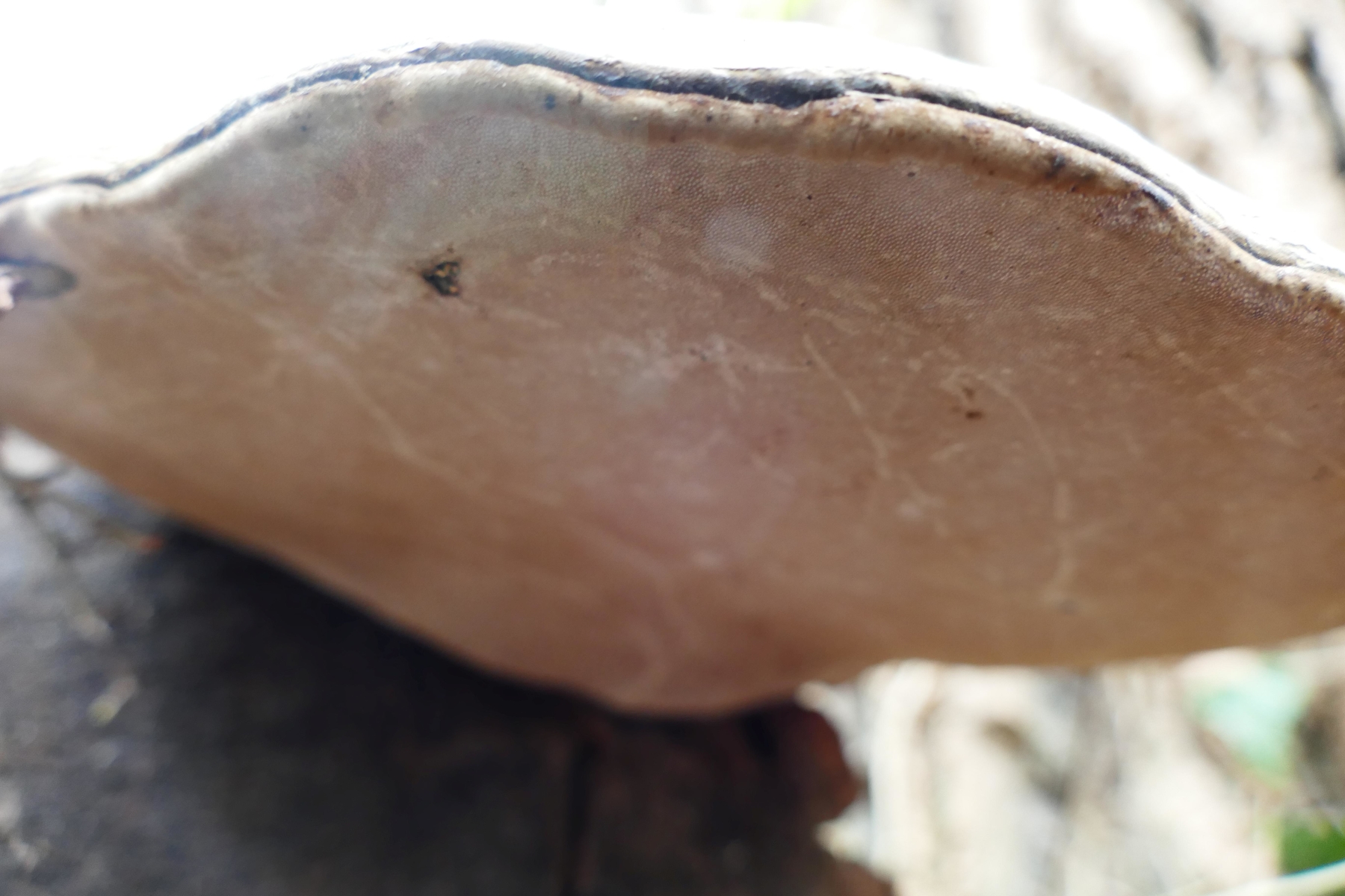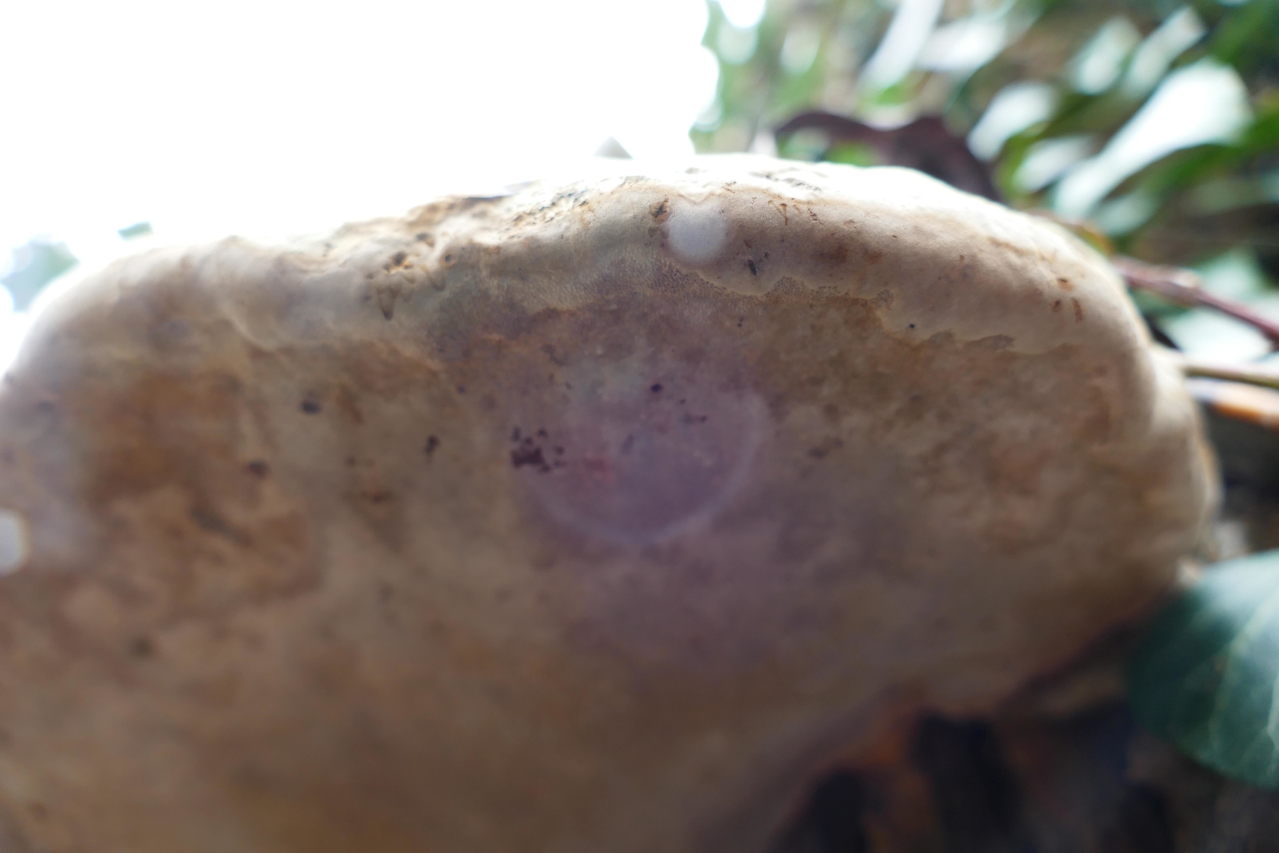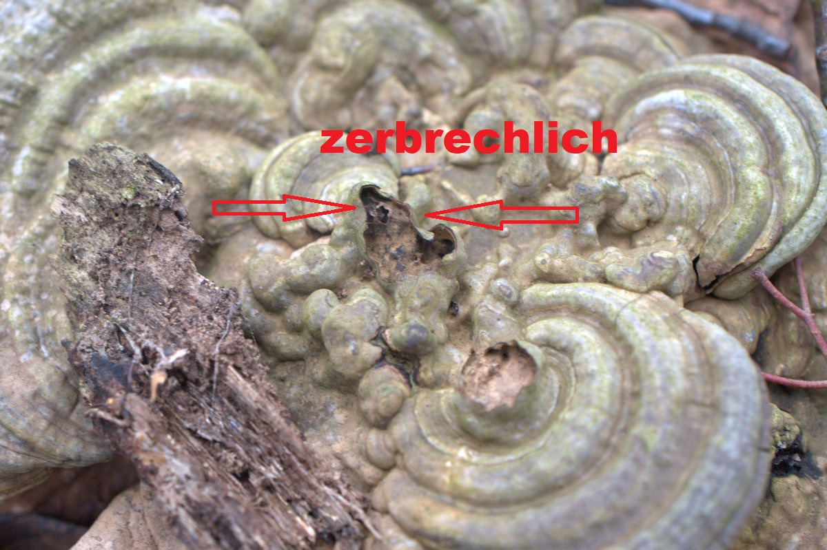 Der hier wachsende, feinporige Fruchtkörper ist gelbstichig.