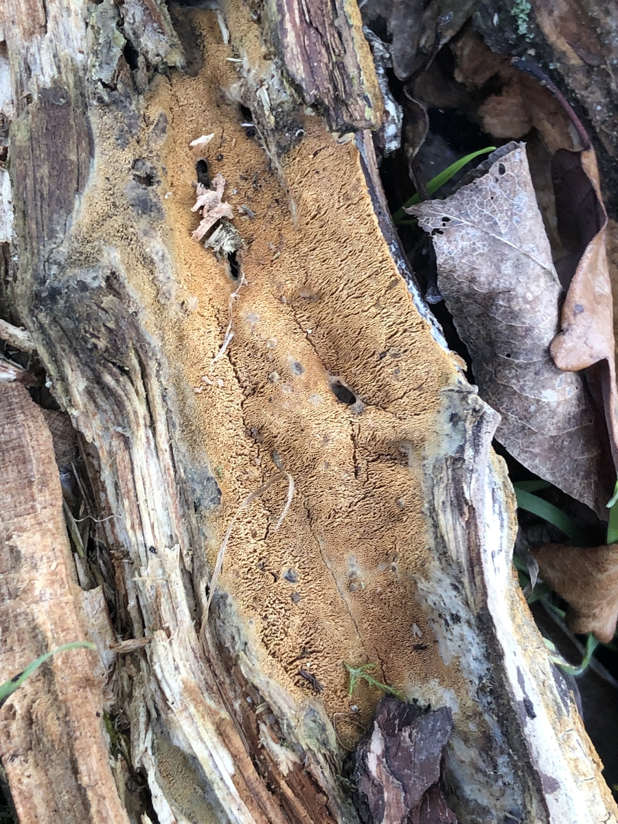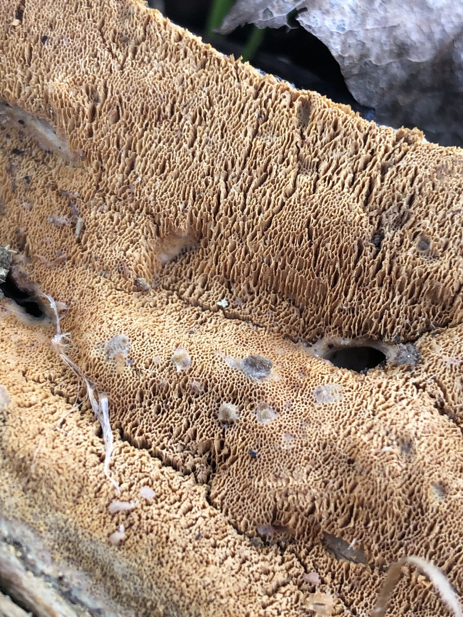 Den Porling müsste man mikroskopisch untersuchen. Allerdings sieht der schon ziemlich verwittert aus, die milchkaffebraune Farbe ist vermutlich auch nicht die ursprüngliche Farbe des Fruchtkörpers. Ceriporiopsis wäre möglich, Arten aus anderen Gattungen aber auch).