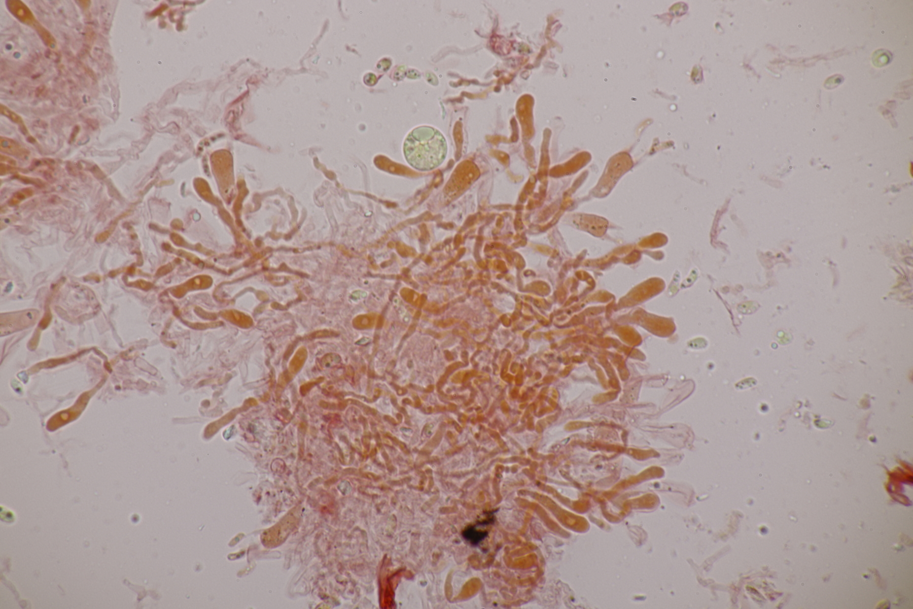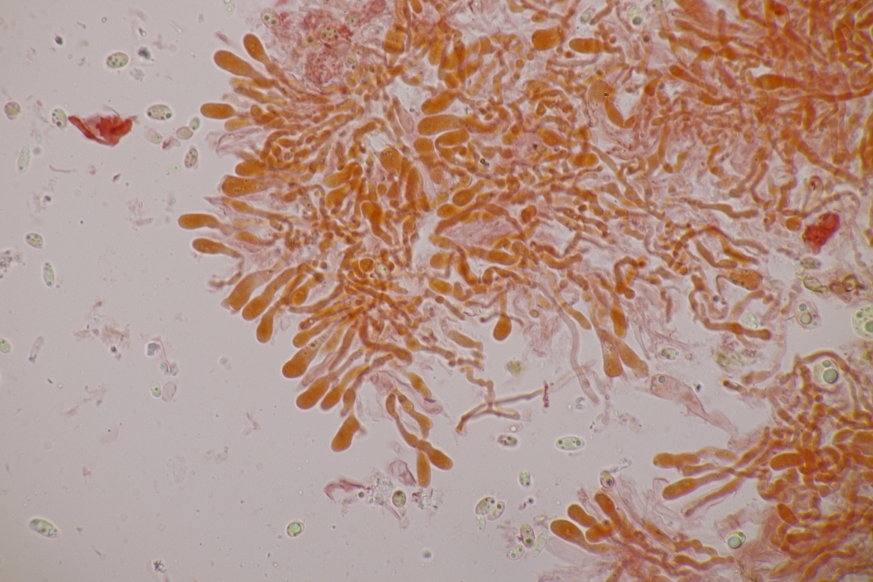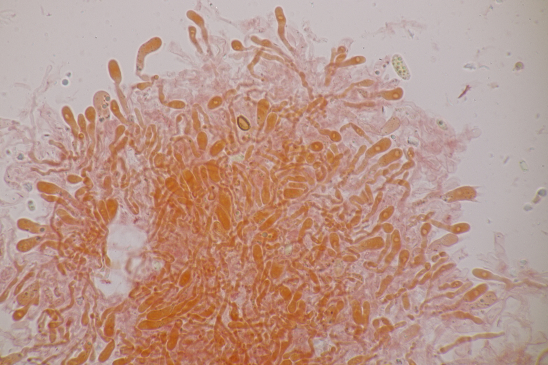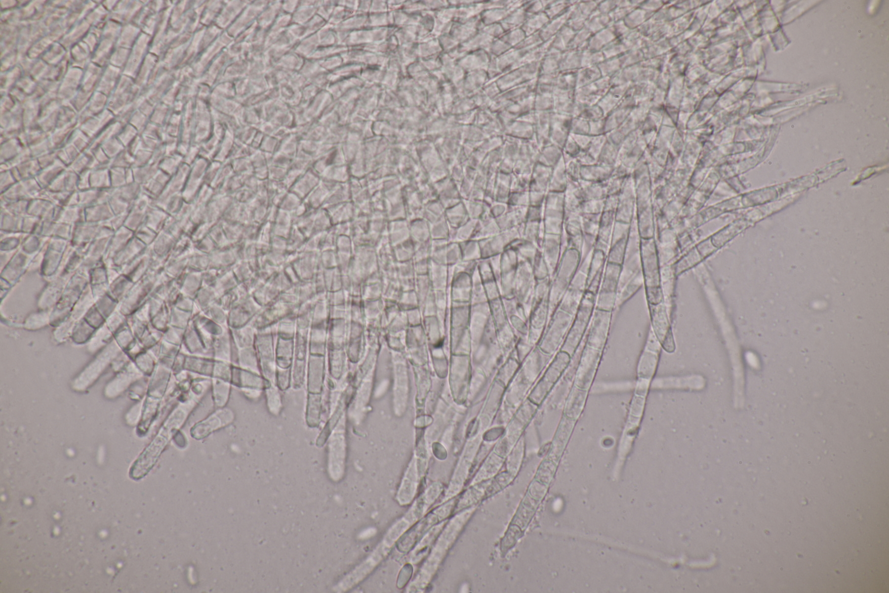 Ansonsten habe ich noch einen weiteren schönen Fund auf den Kiefernnadeln gemacht. Da gab es sehr zahlreich Meloderma desmazieri und einer der Fruchtkörper hatte auffälligen weißen Glibber drauf. Ich habe leider keine Makrofotos gemacht, aber mikroskopisch waren dann schöne, septierte Basidien zu sehen, die zu Sirotrema translucens gehören (den hast du ja auch offenbar mal gefunden).