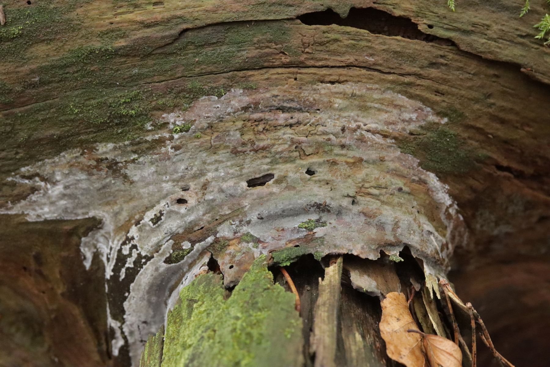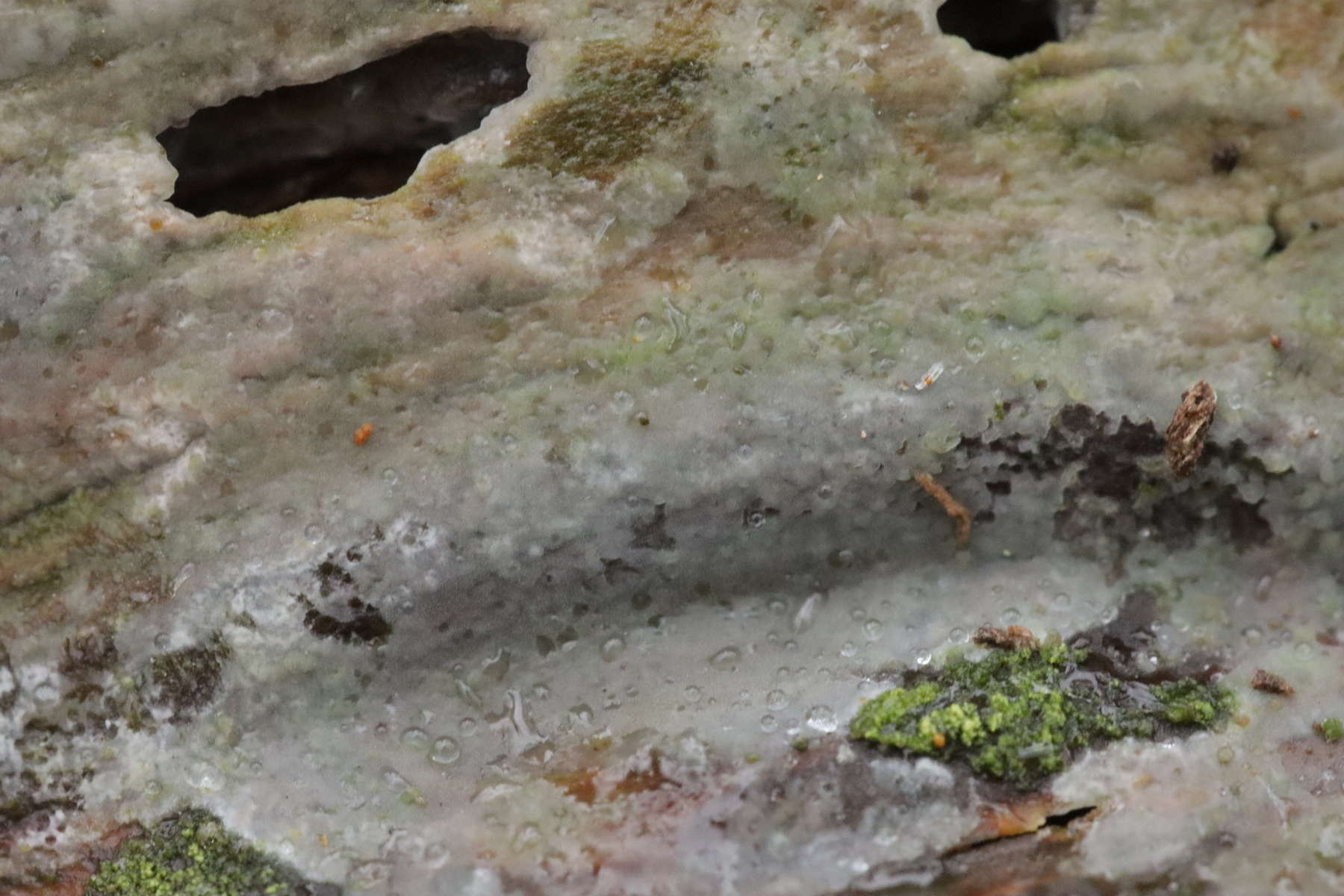 2. An Pinus sylvestris. Sporen messen 6.0-7.2 x 1.4-1.9, Q=3.5-4.9, bzw. 6.8+-0.3 µm x 1.7+-0.2 µm, Q=4.1+-0.4. Die Konsistenz des Fruchtkörpers ist wachsartig weiß. Zystiden sind keine vorhanden, Basidien sind viersporig. Bei der Beurteilung, ob Schnallen vorhanden sind, tue ich mich schwer, meine aber, daß doch welche vorhanden sind. Könnte das Phlebia subcretacea sein?