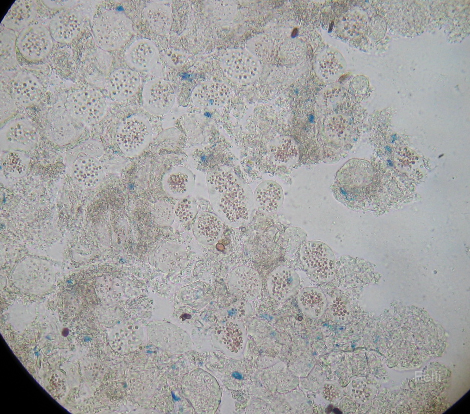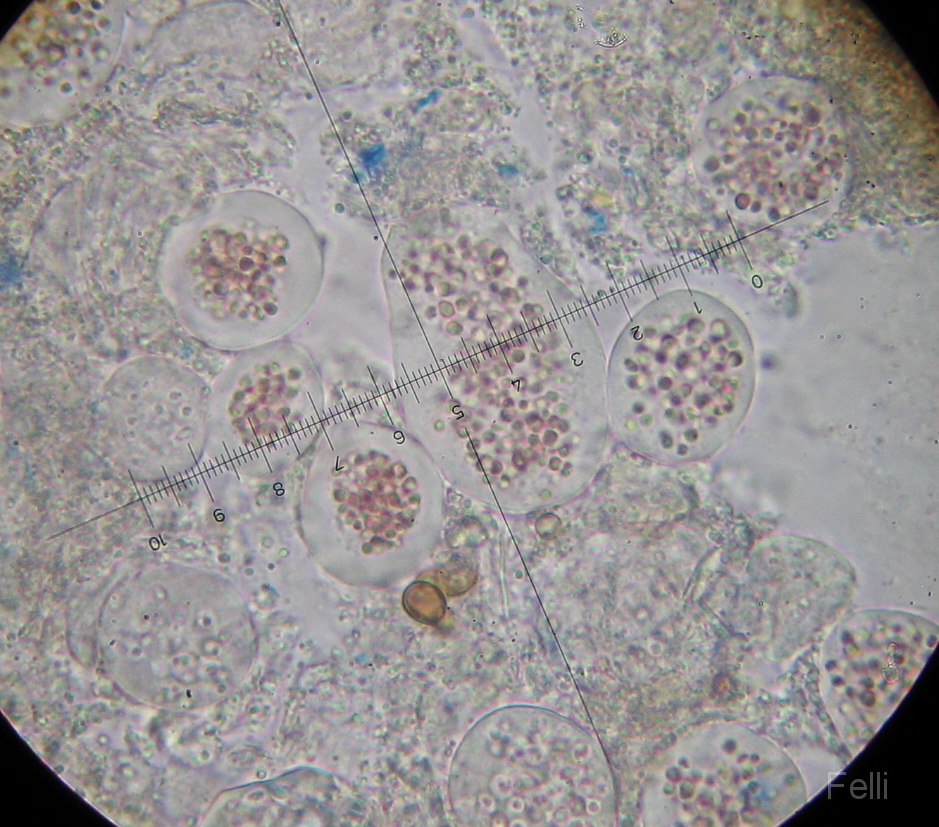 Die kugeligen Zellen, die Du im Mikroskop gesehen hast, sind keine Sporen, sondern sind typisch für ein Sklerotium.